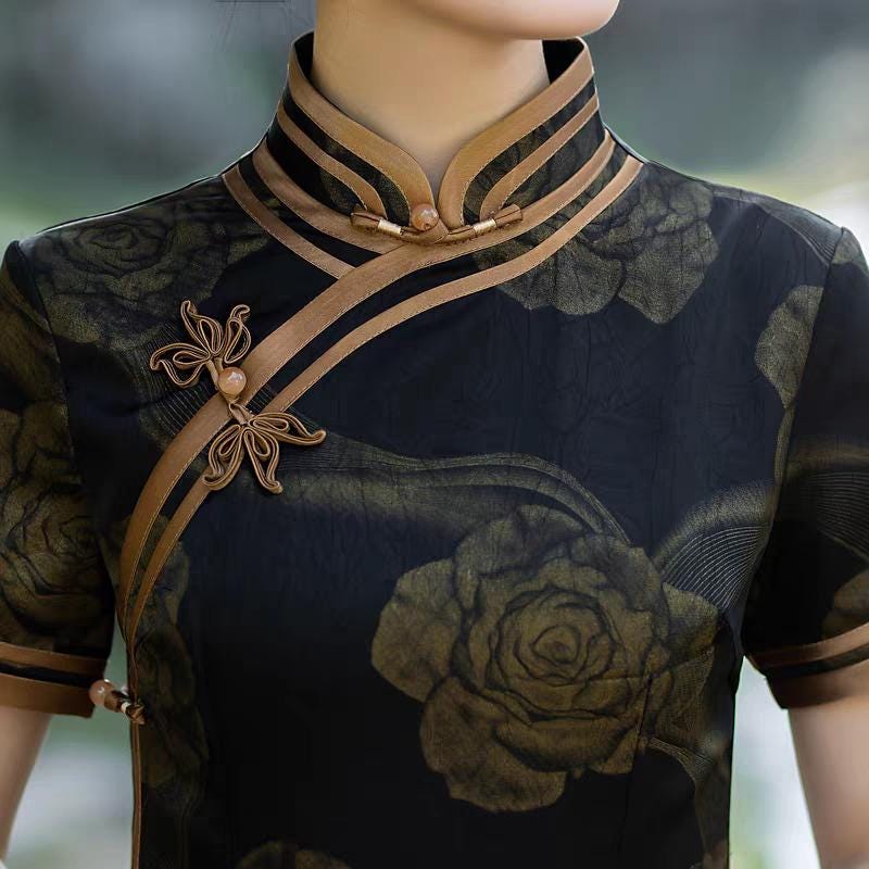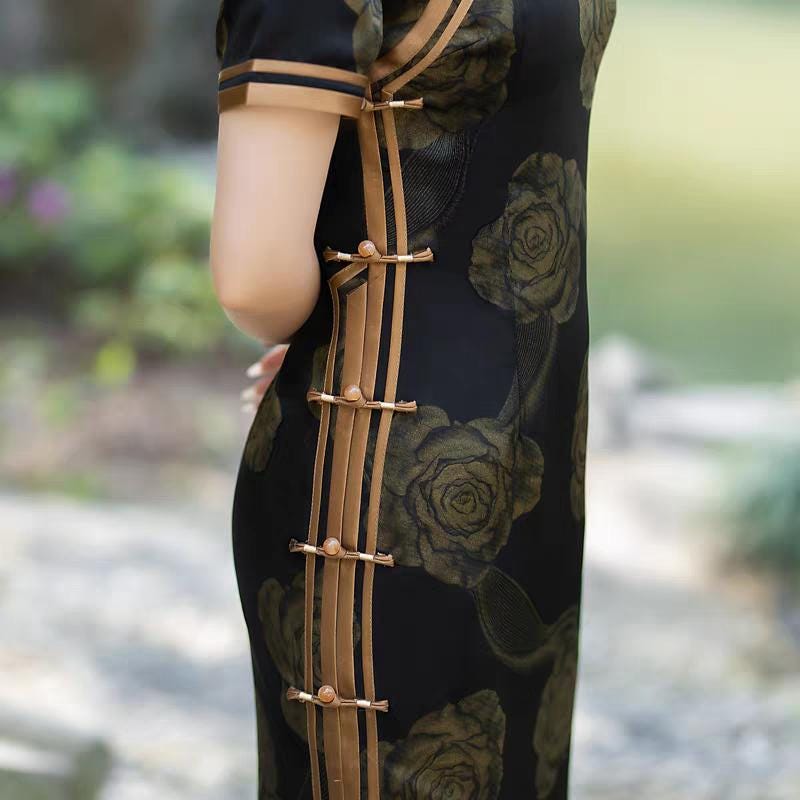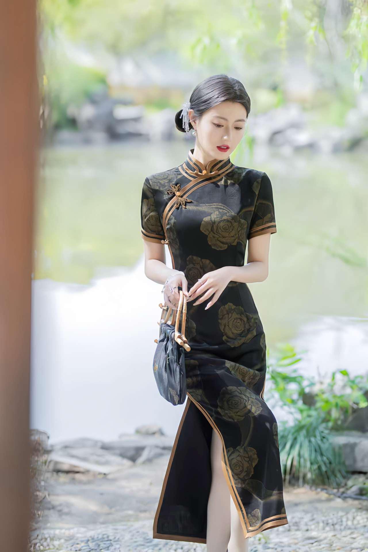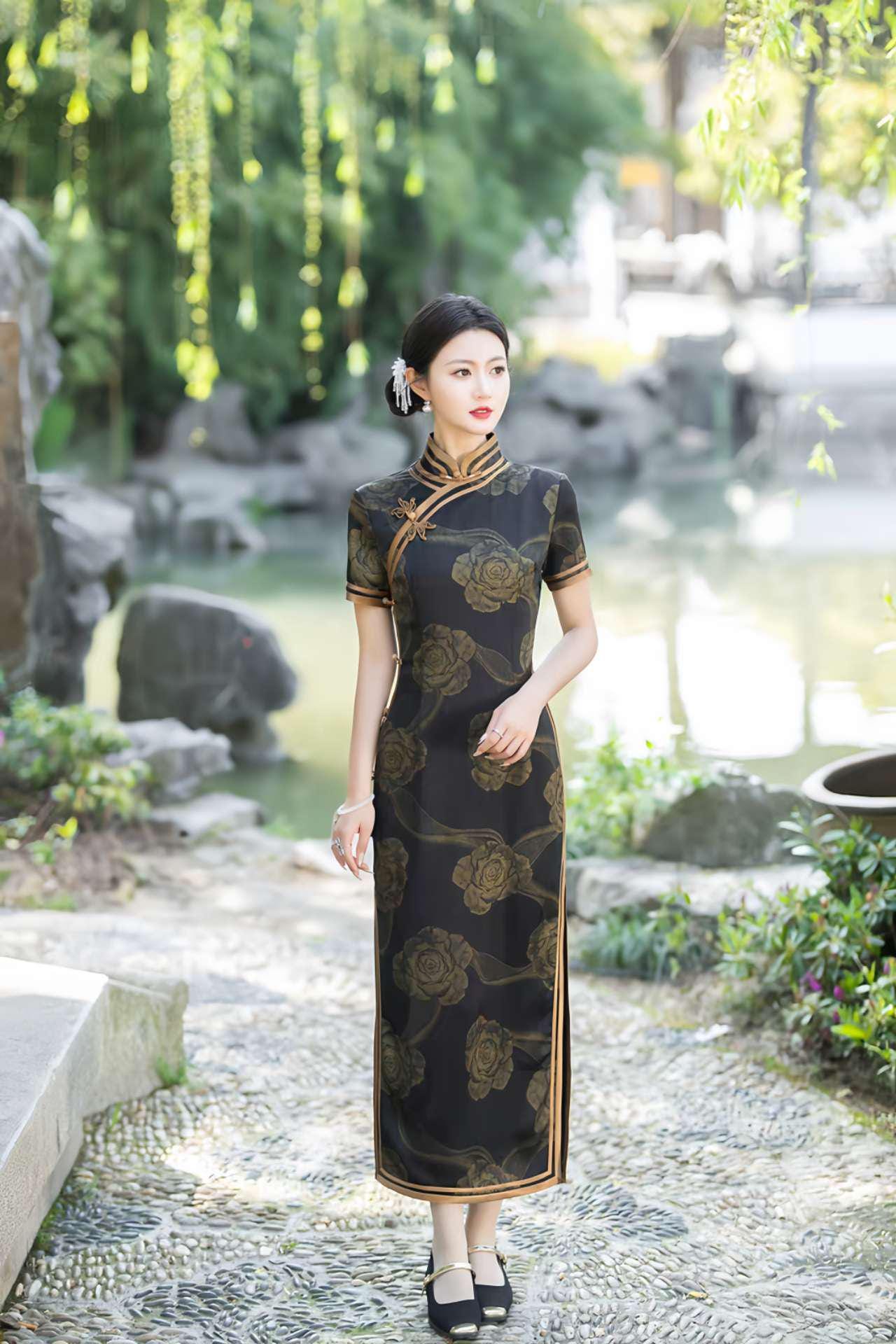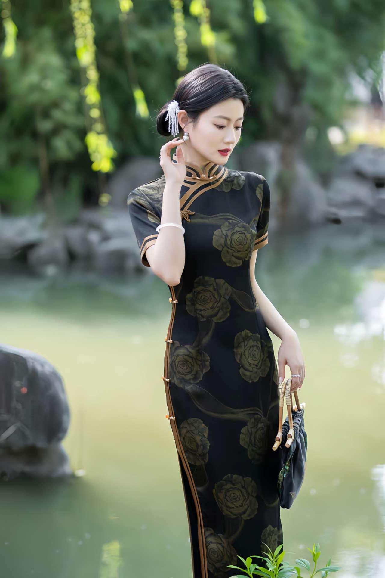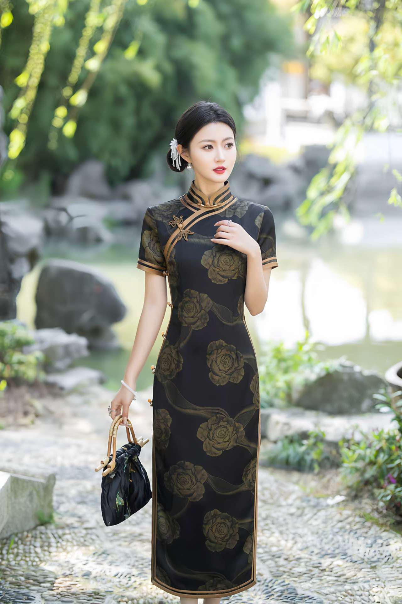 Cheongsam Clásico de Seda, Vestido Qipao Negro, Vestido Chino Vintage, Qipao con Diseño de Rosas, Vestido Tradicional, tallas grandes M-5XL