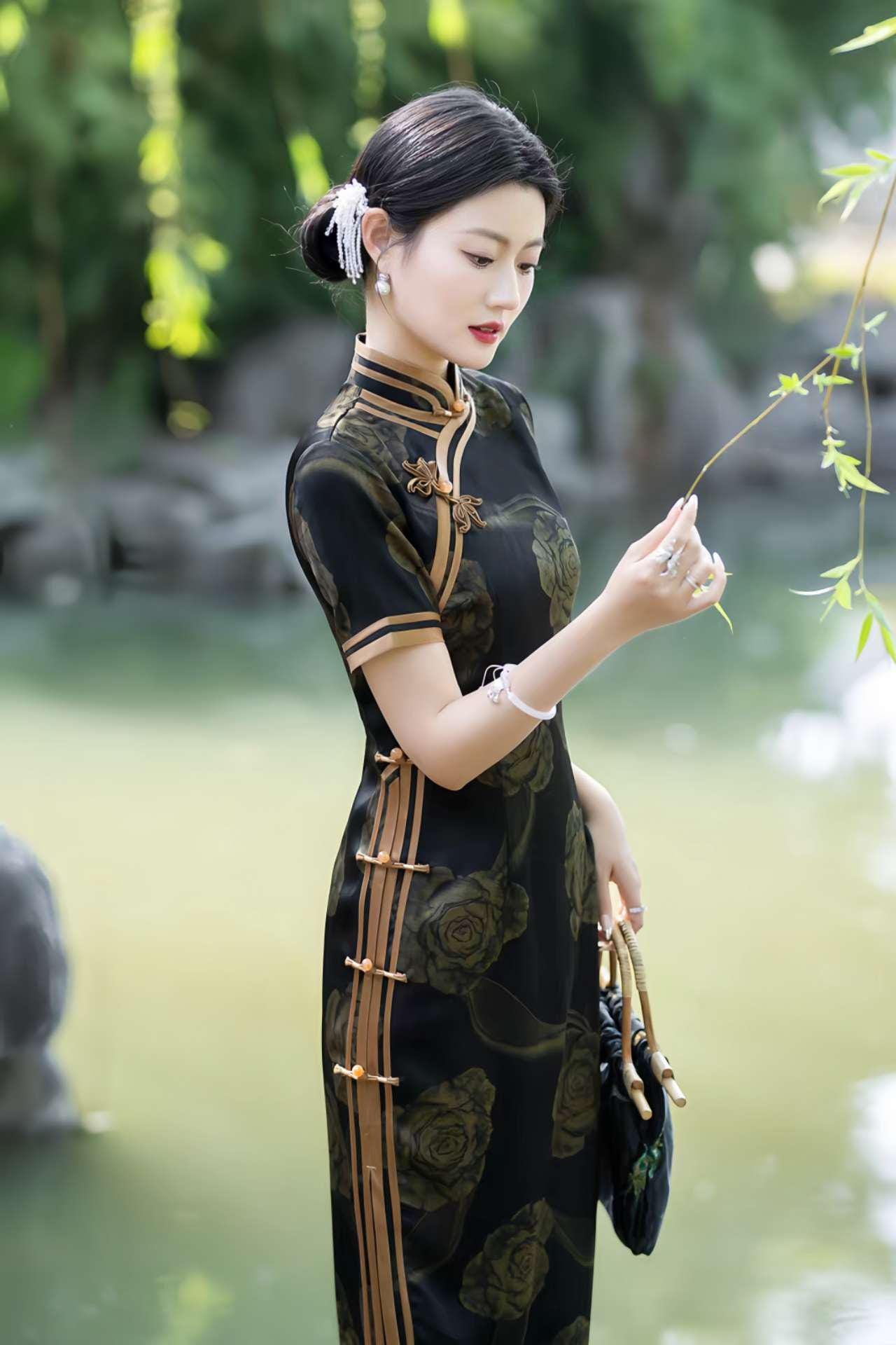 Sumérgete en la elegancia atemporal con este vestido qipao vintage de seda negra, una fusión exquisita entre el diseño chino clásico y la feminidad sofisticada. Confeccionado en seda satinada de alta calidad, presenta un acabado brillante y un diseño floral de rosas vintage en verde oliva sobre fondo negro profundo.