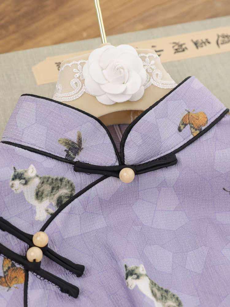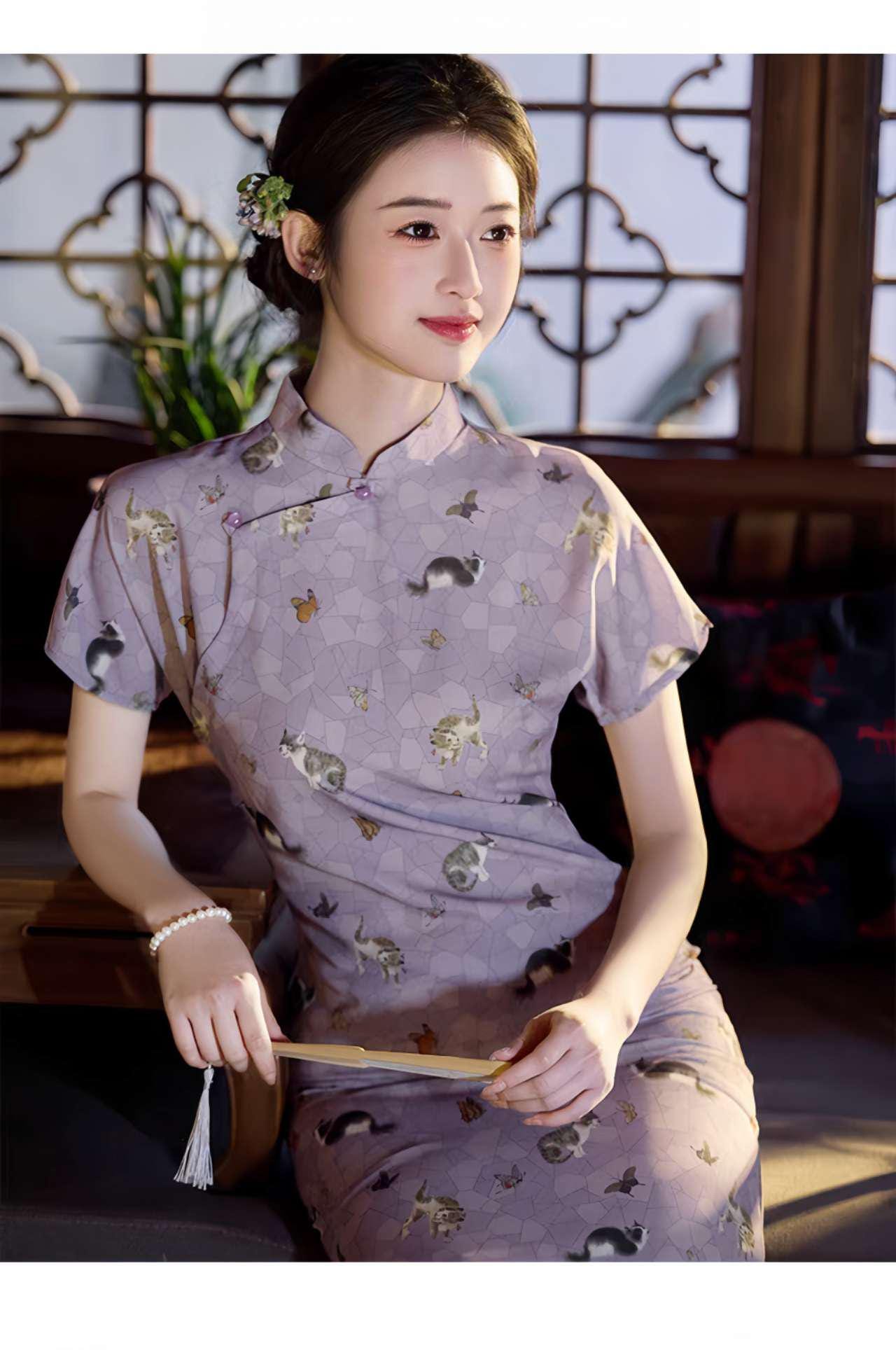 Agrega encanto y dulzura a tu estilo con este exclusivo vestido qipao vintage en color púrpura, decorado con un alegre estampado de gatitos y mariposas. Confeccionado en una mezcla de lino y Tencel transpirable, es ideal para primavera y verano: suave, liviano y cómodo para la piel.