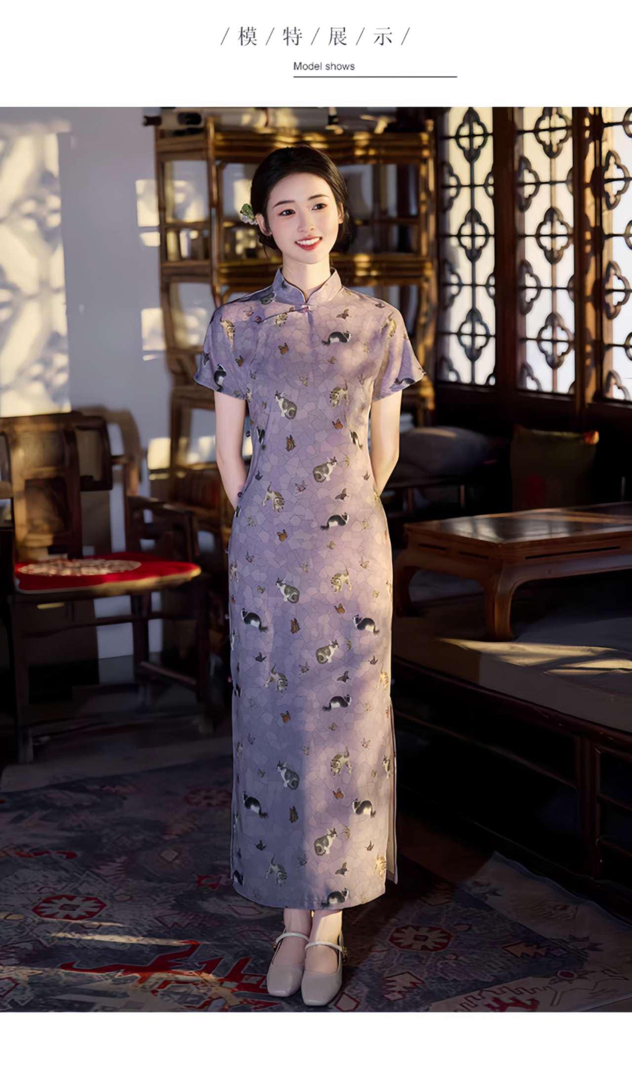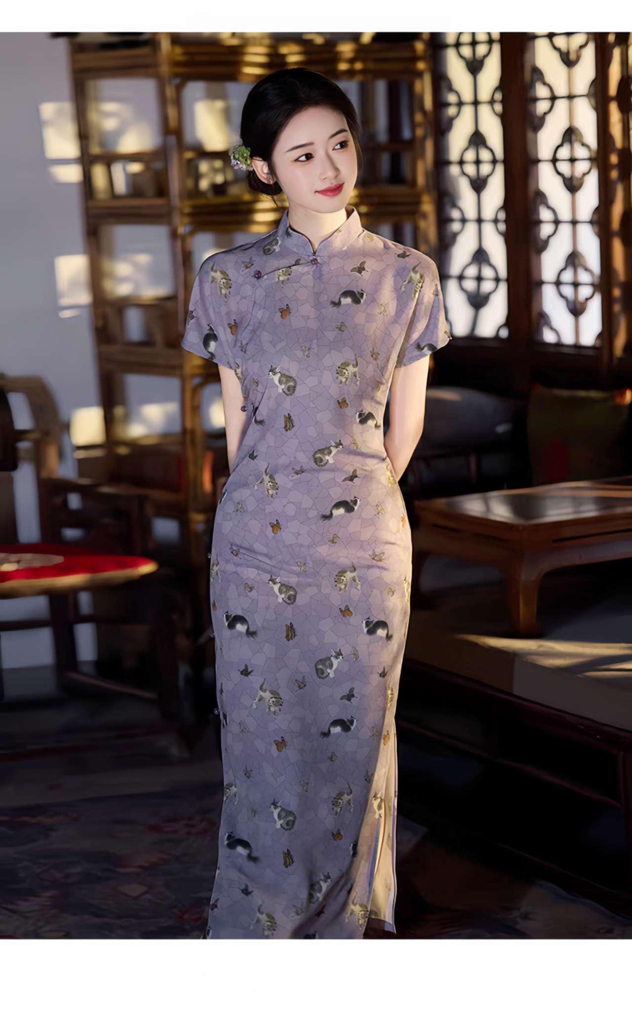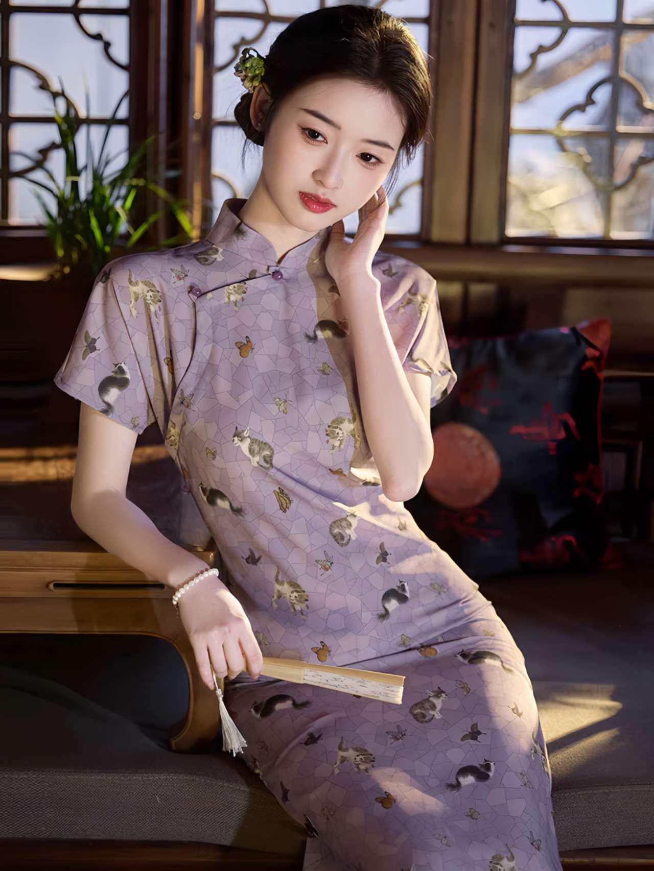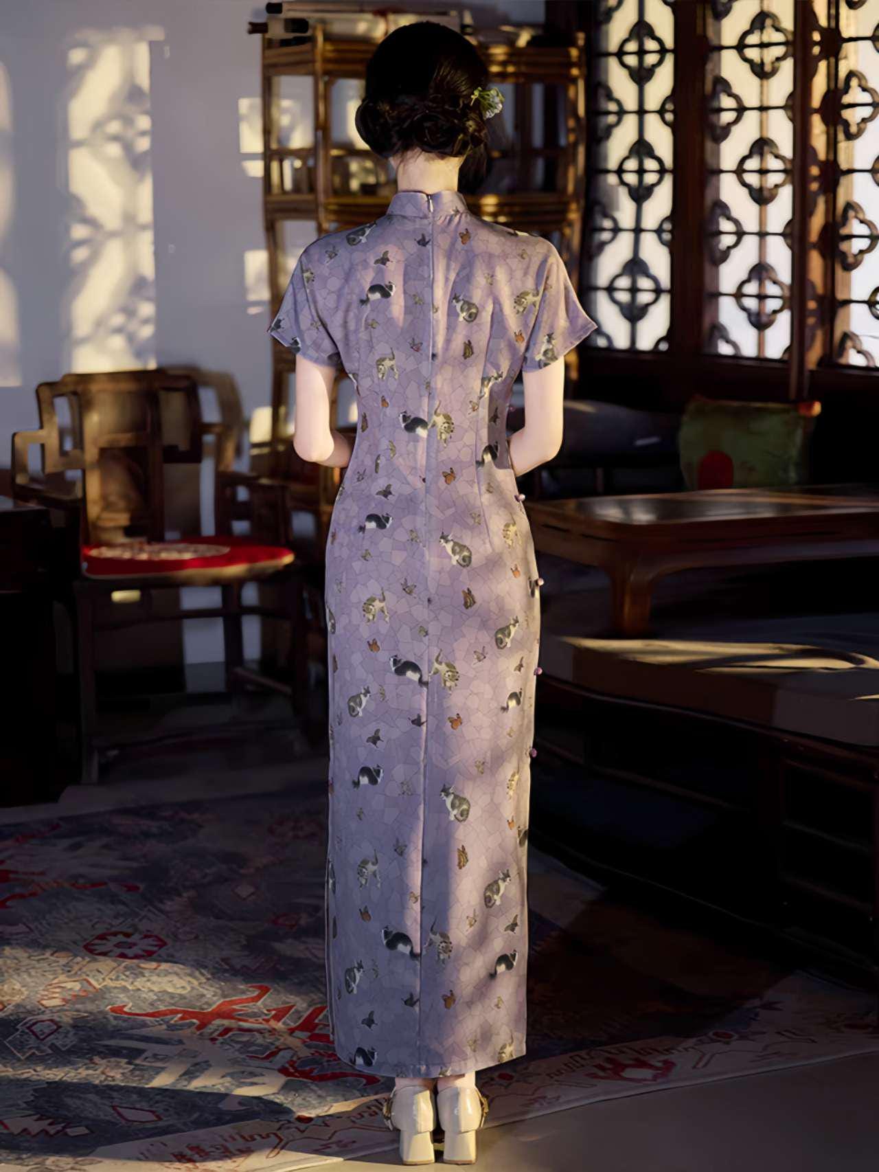 Cheongsam de Gato Morado, Qipao Chino Vintage, Regalo para Ella, Vestido de Té, Vestido Asiático Artístico, Qipao Elegante y Divertido