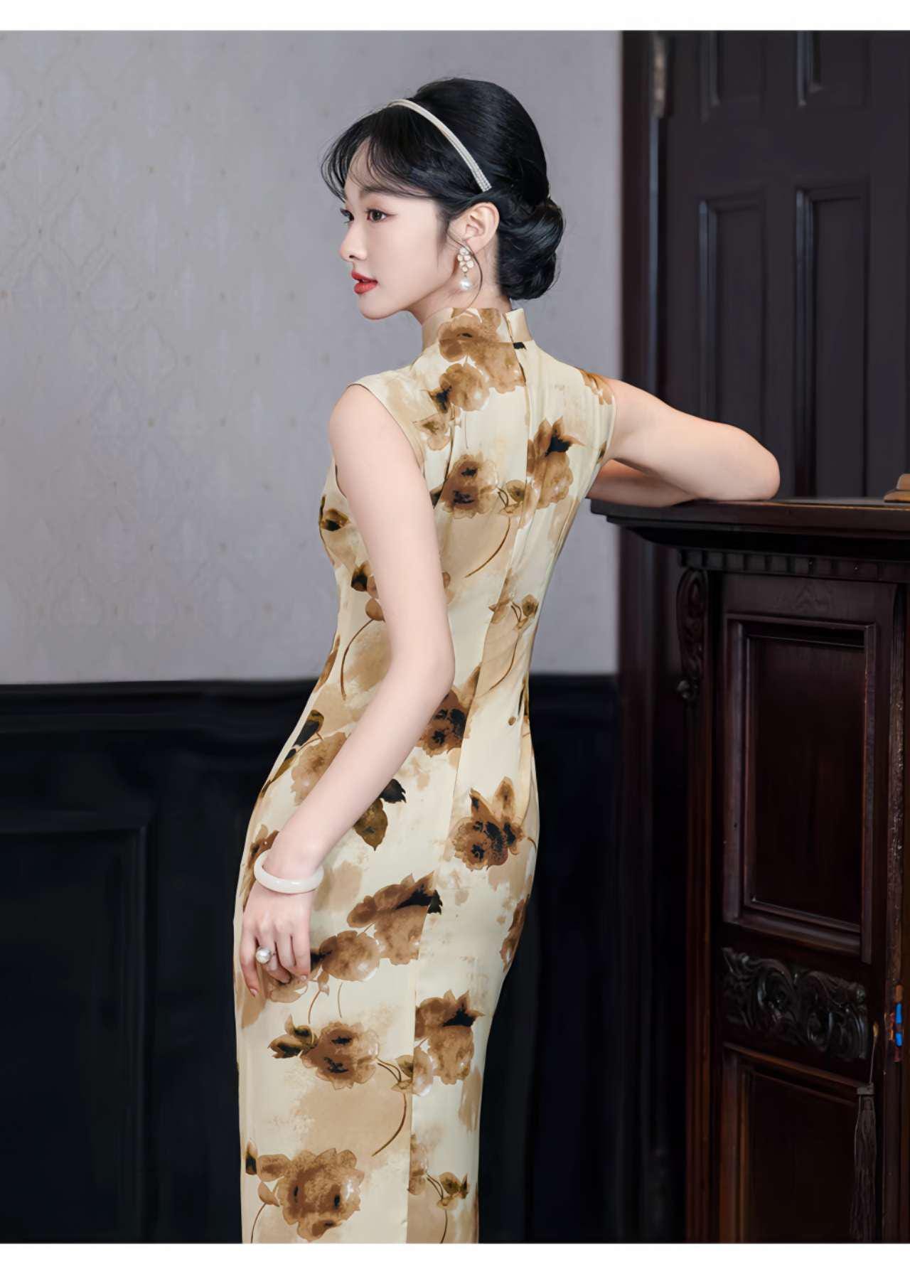 Destaca tu estilo con este qipao amarillo de inspiración vintage, con un delicado estampado floral tipo acuarela sobre una tela suave y elástica de seda de leche. El diseño incorpora cuello mandarín, corte sin mangas, y una longitud hasta la pantorrilla (122 cm), fusionando la elegancia china con un encanto retro refinado.