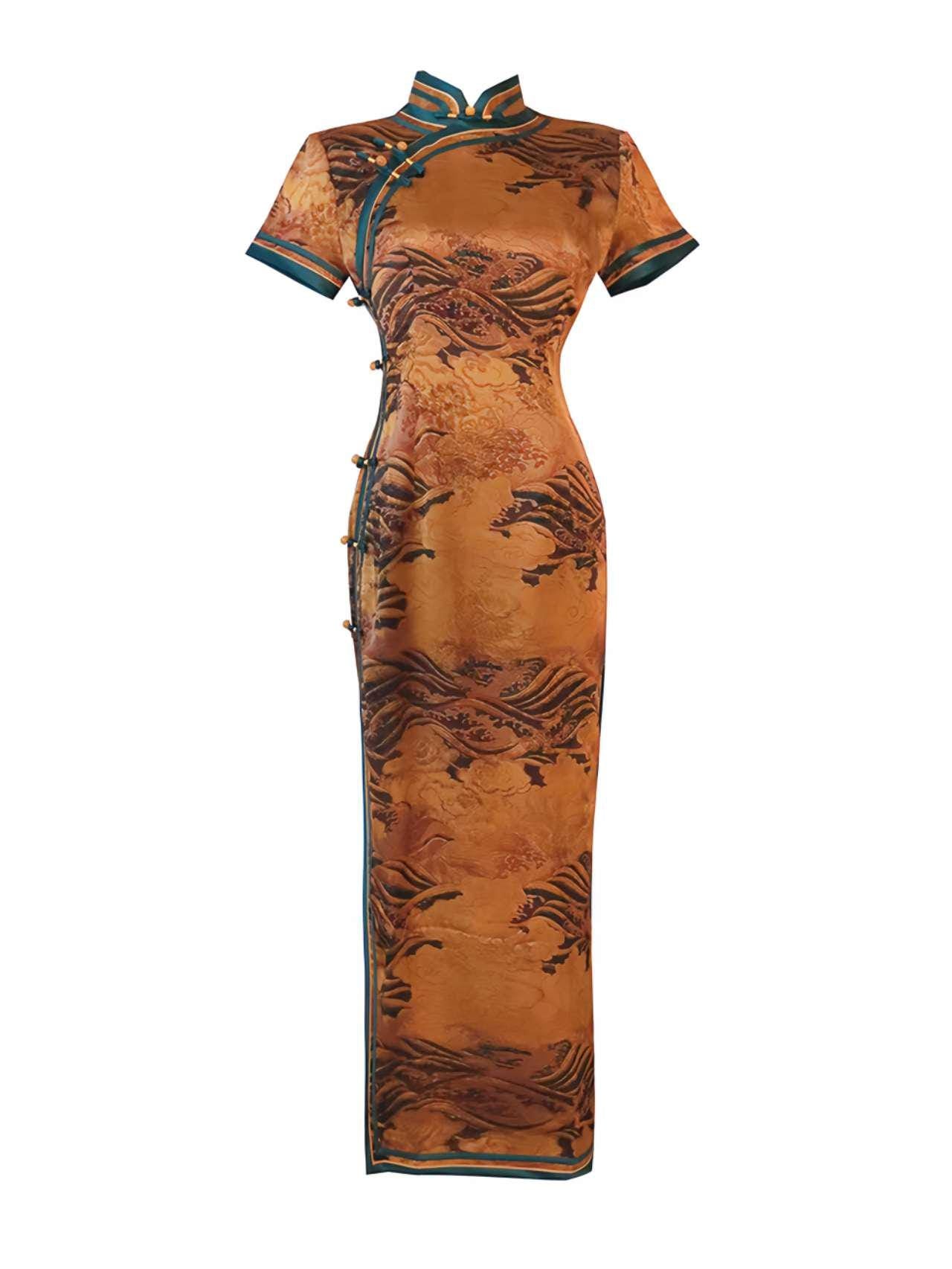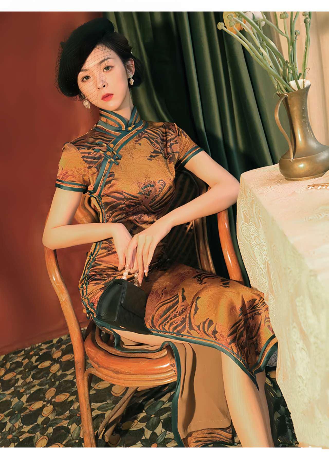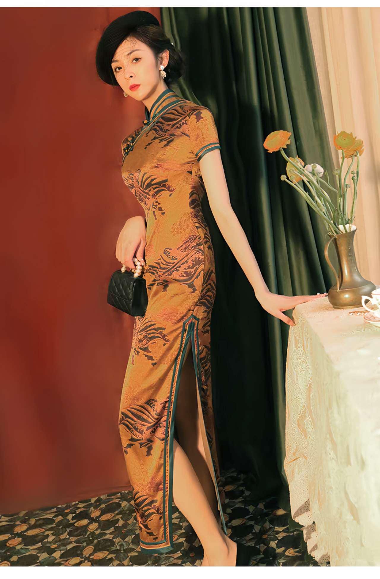 Sumérgete en el encanto del viejo Shanghái con este espectacular qipao de brocado floral. Confeccionado en tela de satén estilo brocado (花萝缎), este vestido presenta un tono dorado ambarino con ribetes verde esmeralda, botones tradicionales hechos a mano y un jacquard inspirado en el ave fénix oriental.