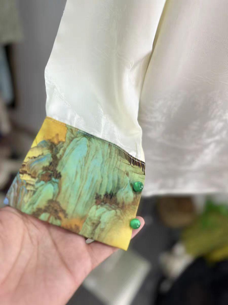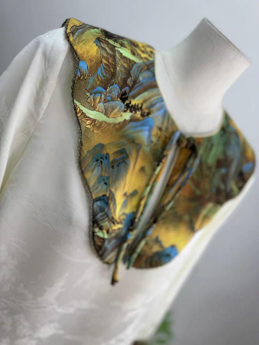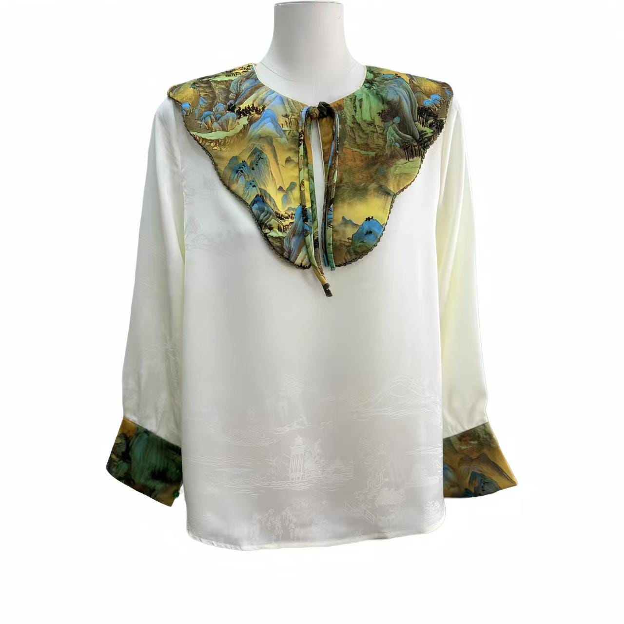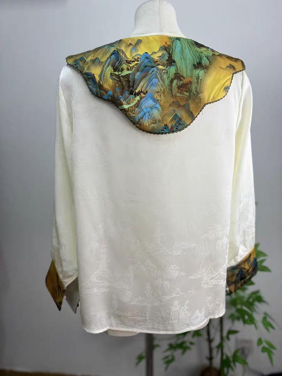 Step into timeless elegance with this vintage-inspired Chinese Yunjian (cloud collar) blouse. Crafted from luxurious jacquard satin, the garment blends traditional Oriental artistry with modernity. Landscape-inspired collar and cuff details create a refined style steeped in cultural symbolism. Available in white and purple, this blouse pairs perfectly with skirts, pants, or layered ensembles, ideal for cultural festivals, performances, art exhibitions, or elegant everyday wear. A statement piece that reflects the grace of Eastern heritage with a contemporary twist.