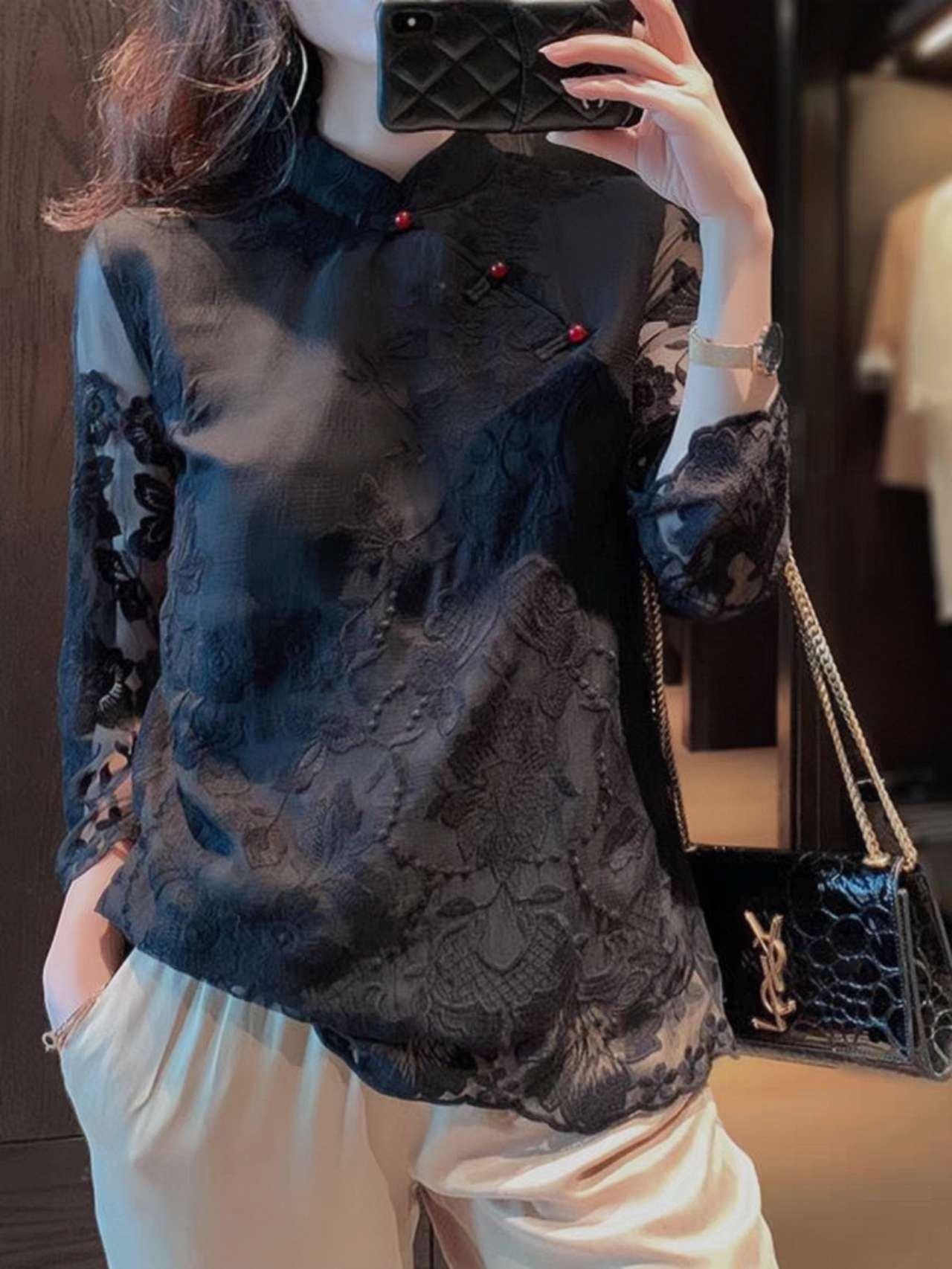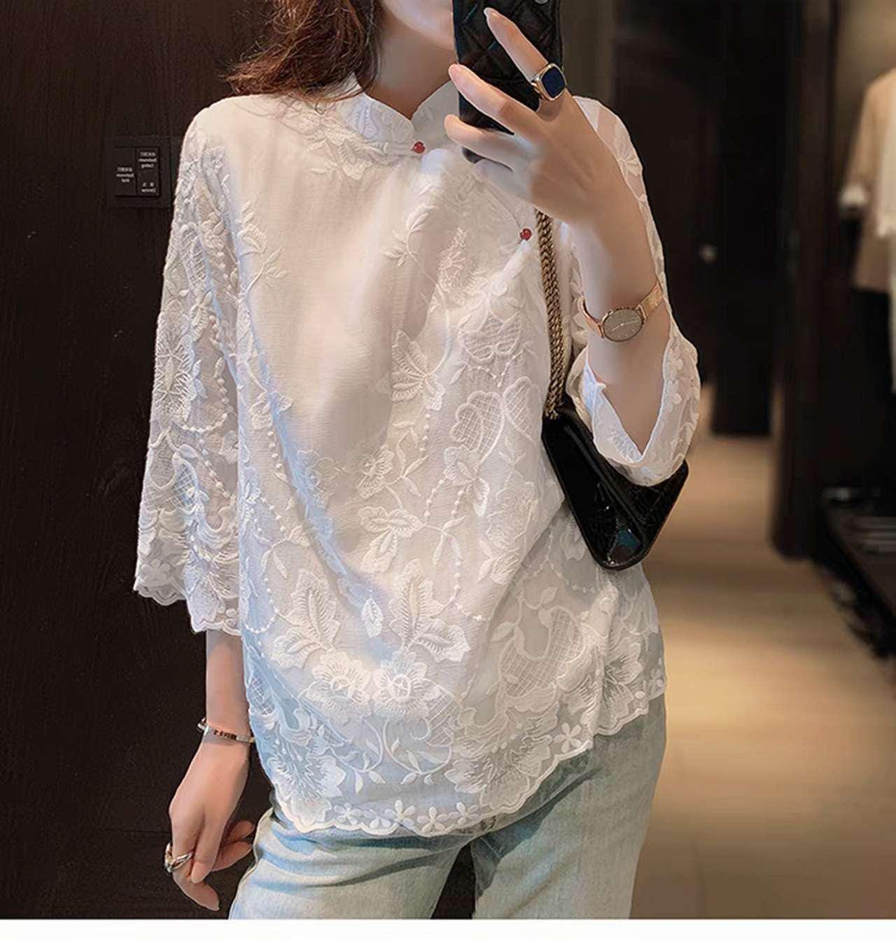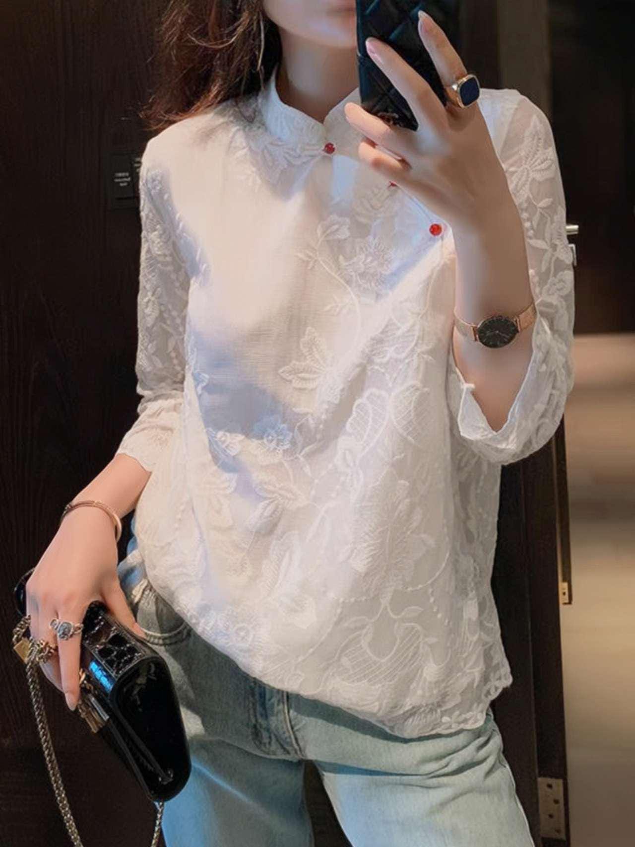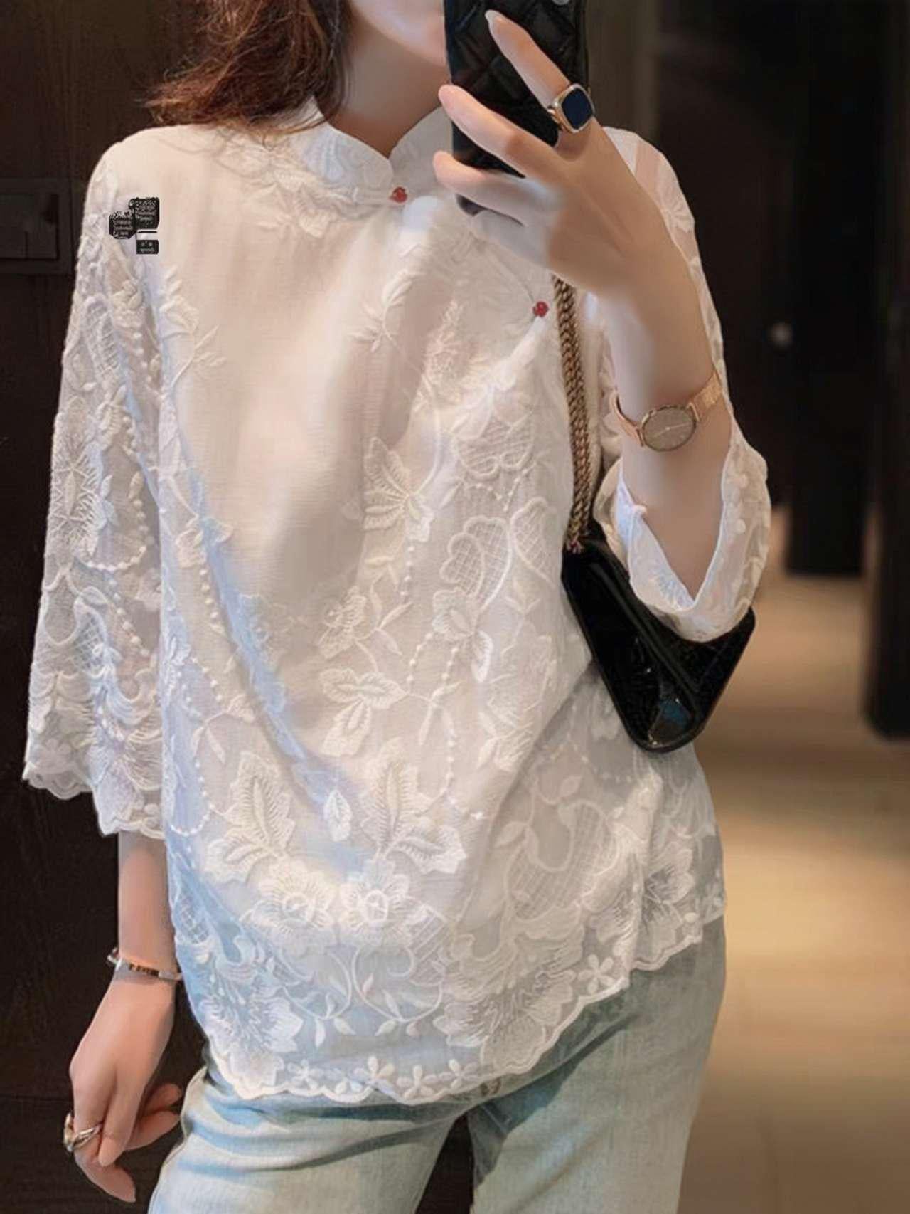 This Tang-style blouse combines oriental craftsmanship with modern fashion. Crafted from delicate lace and polyester, it features a loose seven-eighths sleeve design, a classic Mandarin collar, and floral embroidered details reminiscent of Chinese poetry.