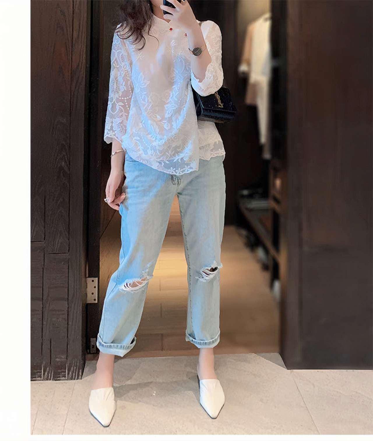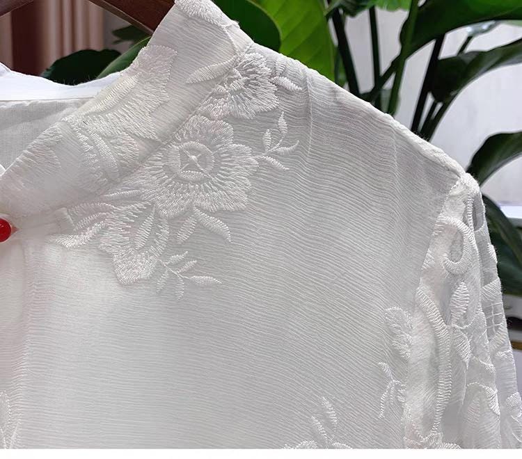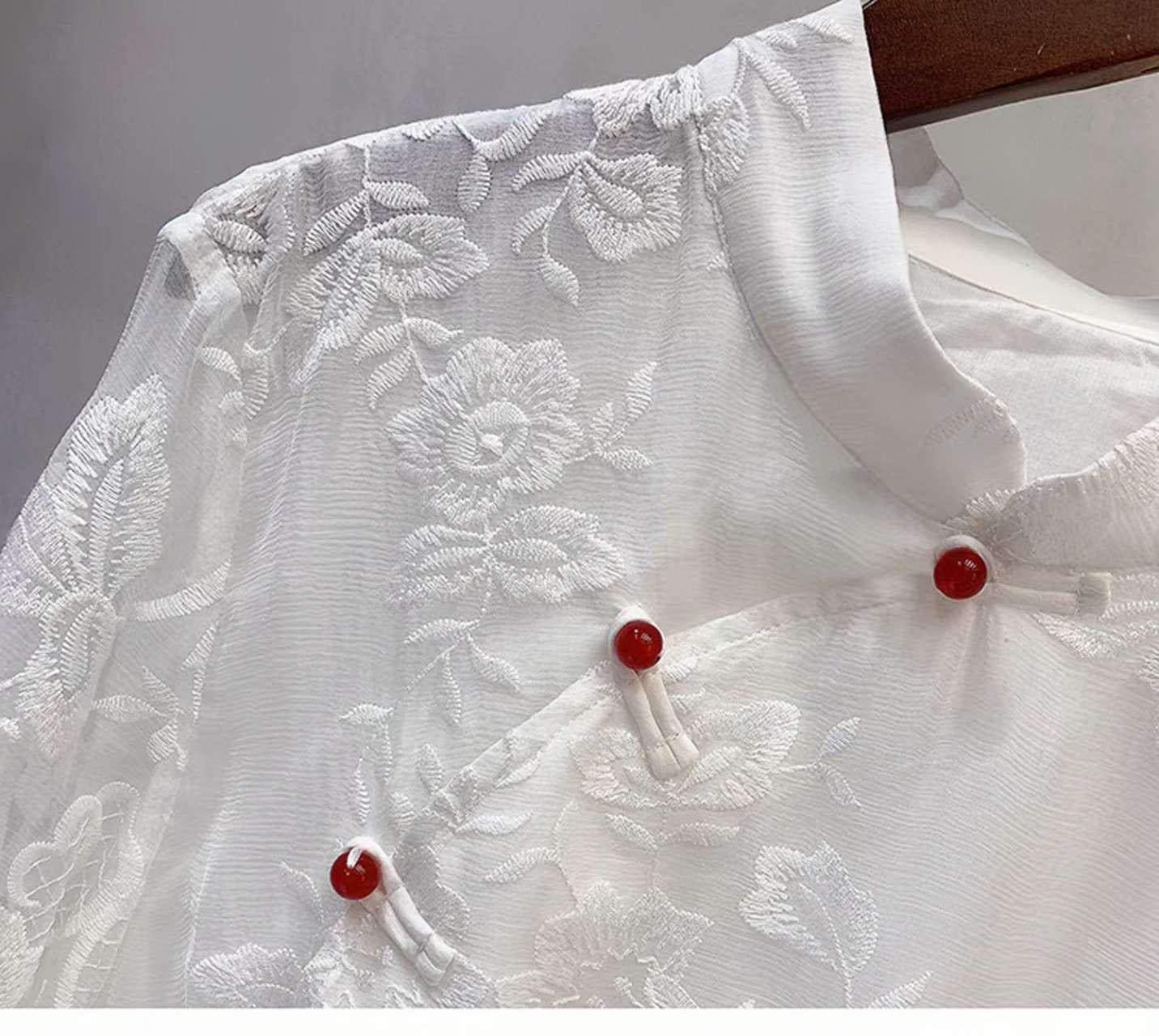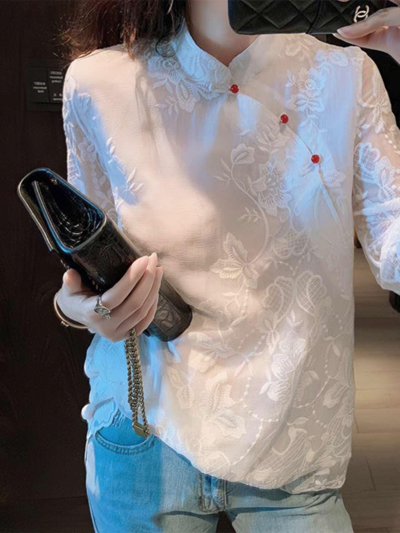This Tang-style blouse combines oriental craftsmanship with modern fashion. Crafted from delicate lace and polyester, it features a loose seven-eighths sleeve design, a classic Mandarin collar, and floral embroidered details reminiscent of Chinese poetry.