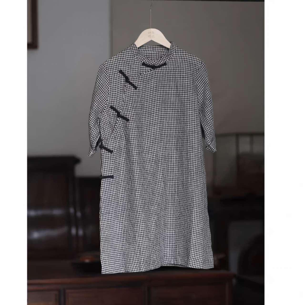 Bring quiet elegance to your wardrobe with this vintage-style checked Chinese tea shirt. Crafted with a mandarin collar, traditional diagonal closures, and a loose, mid-length cut, it offers a relaxed silhouette, ideal for tea ceremonies, cultural retreats, or slow-living fashion.