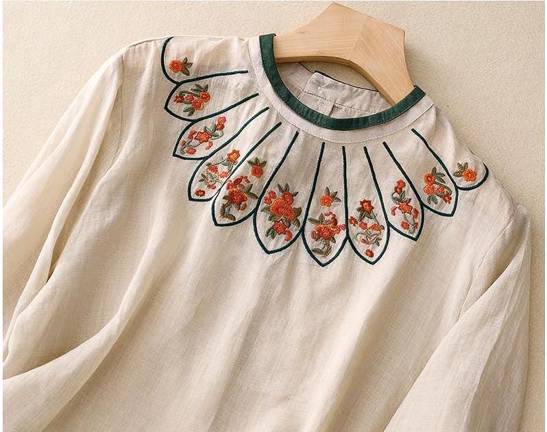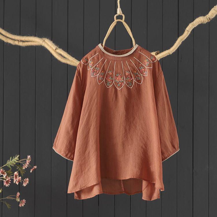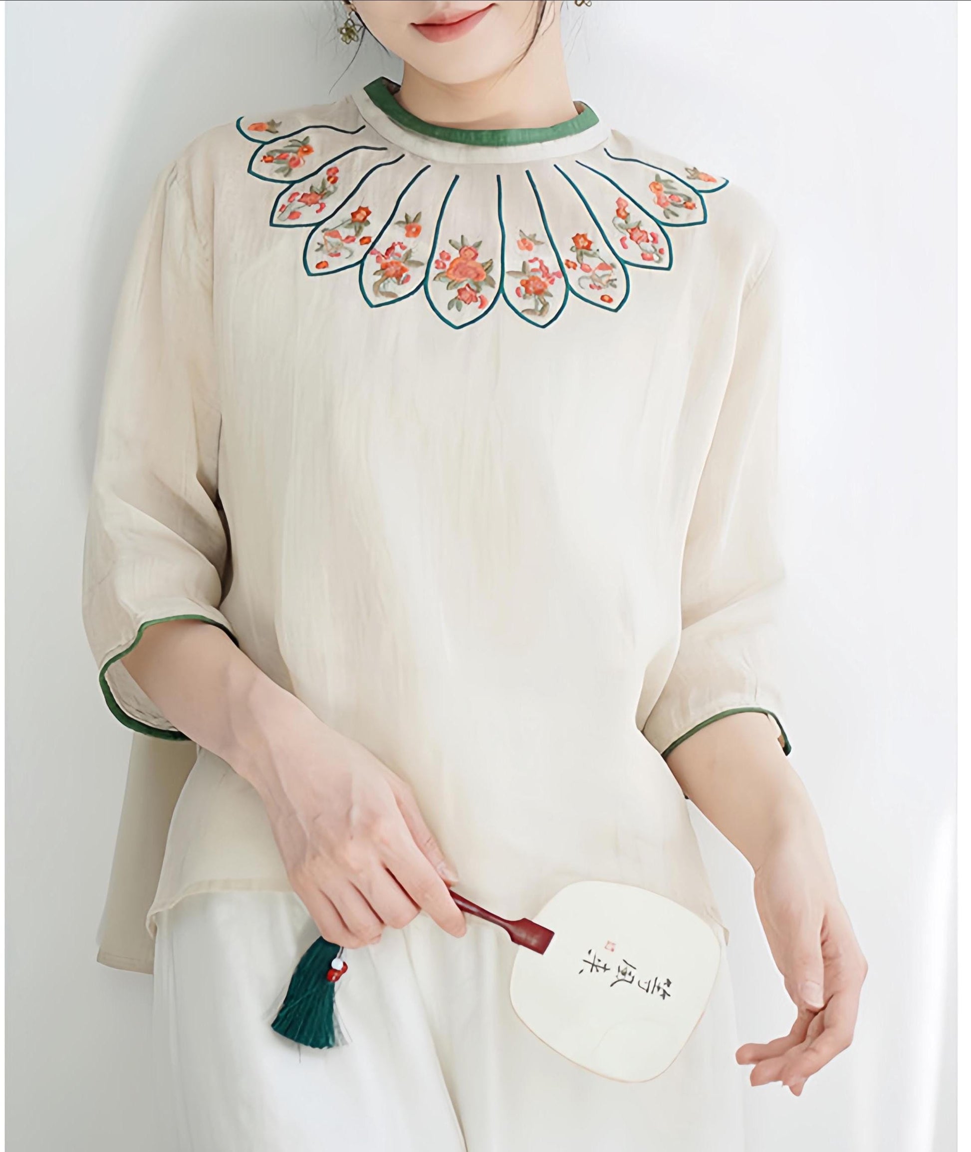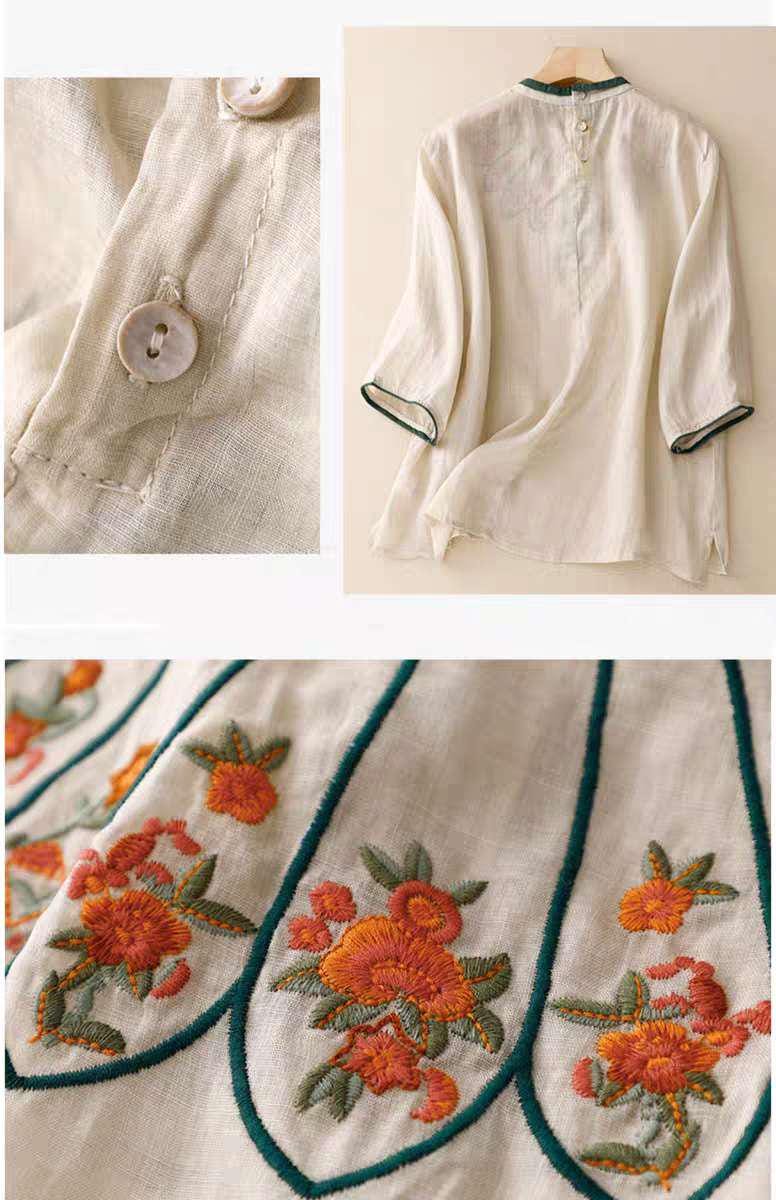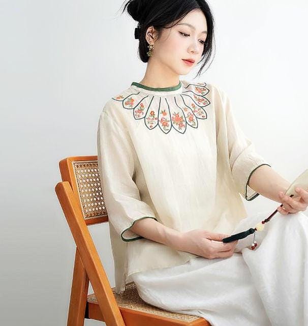 Vintage Ethnic Floral Shirt - Folk Embroidery Cotton Linen Tunic - Chinese Folk Art Inspired Women's Blouse