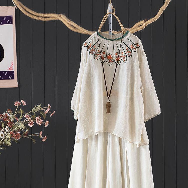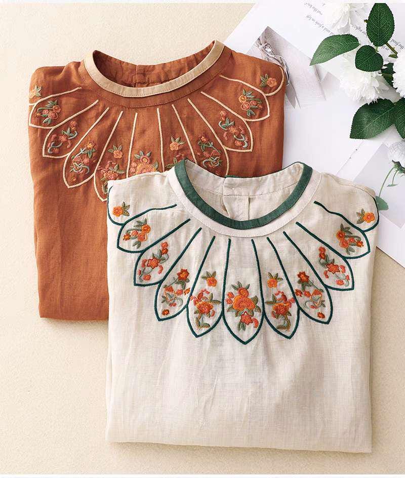 This handcrafted blouse made of natural cotton and linen combines freshness and traditional style. The petal-embroidered collar with small flowers conveys an artistic and ethnic feel. It's lightweight, comfortable, and perfect for spring and summer.