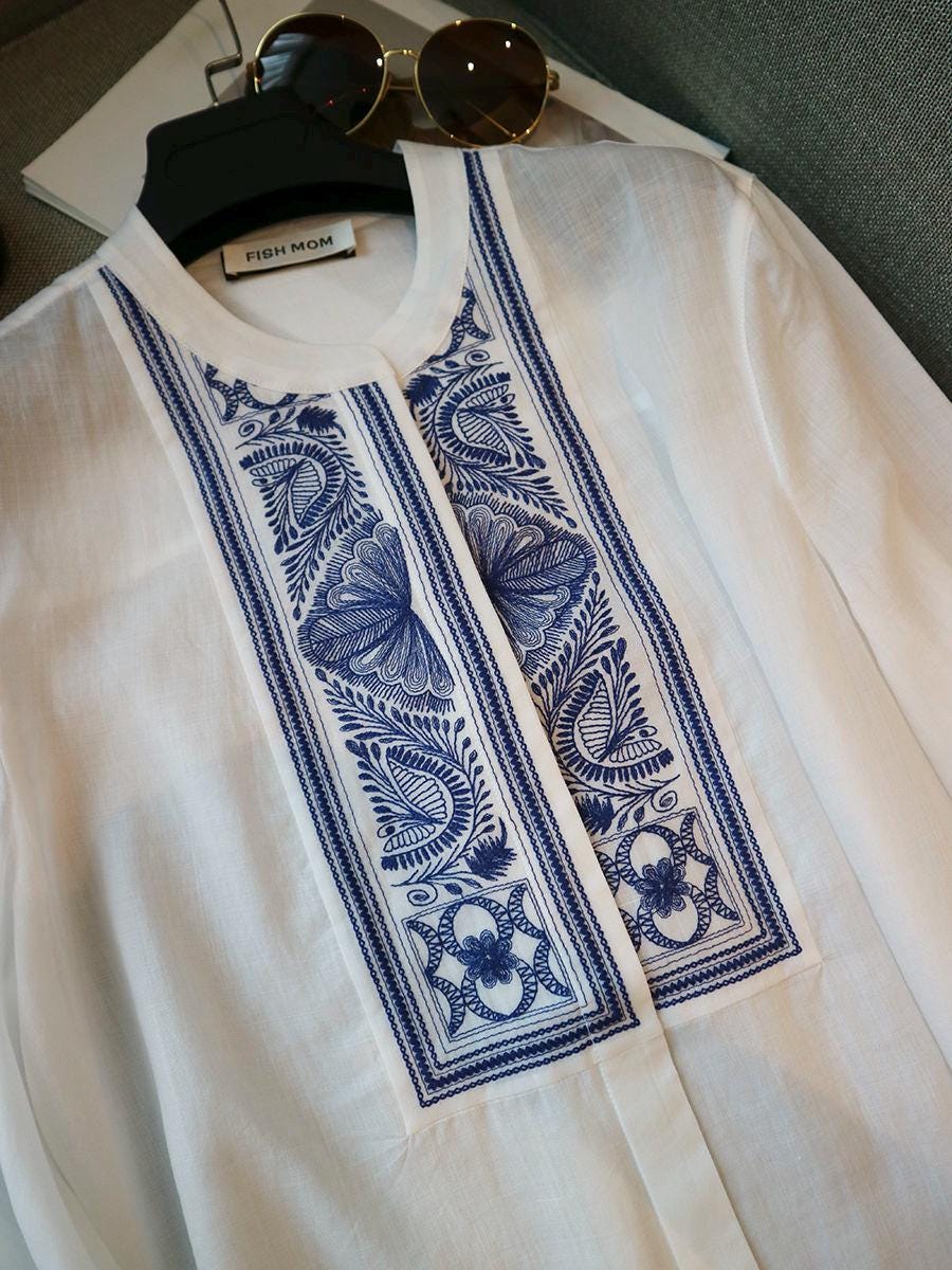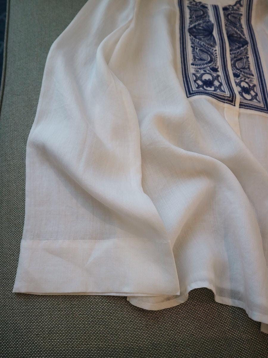 Look effortlessly elegant in this bohemian linen blouse. Featuring handcrafted embroidery details, this lightweight and breathable piece is perfect for spring and summer. Inspired by traditional folk patterns, this vintage shirt adds a sophisticated and timeless touch to any wardrobe. Its relaxed fit and long sleeves make it ideal for casual outings, vacations, or a cozy day at home.
