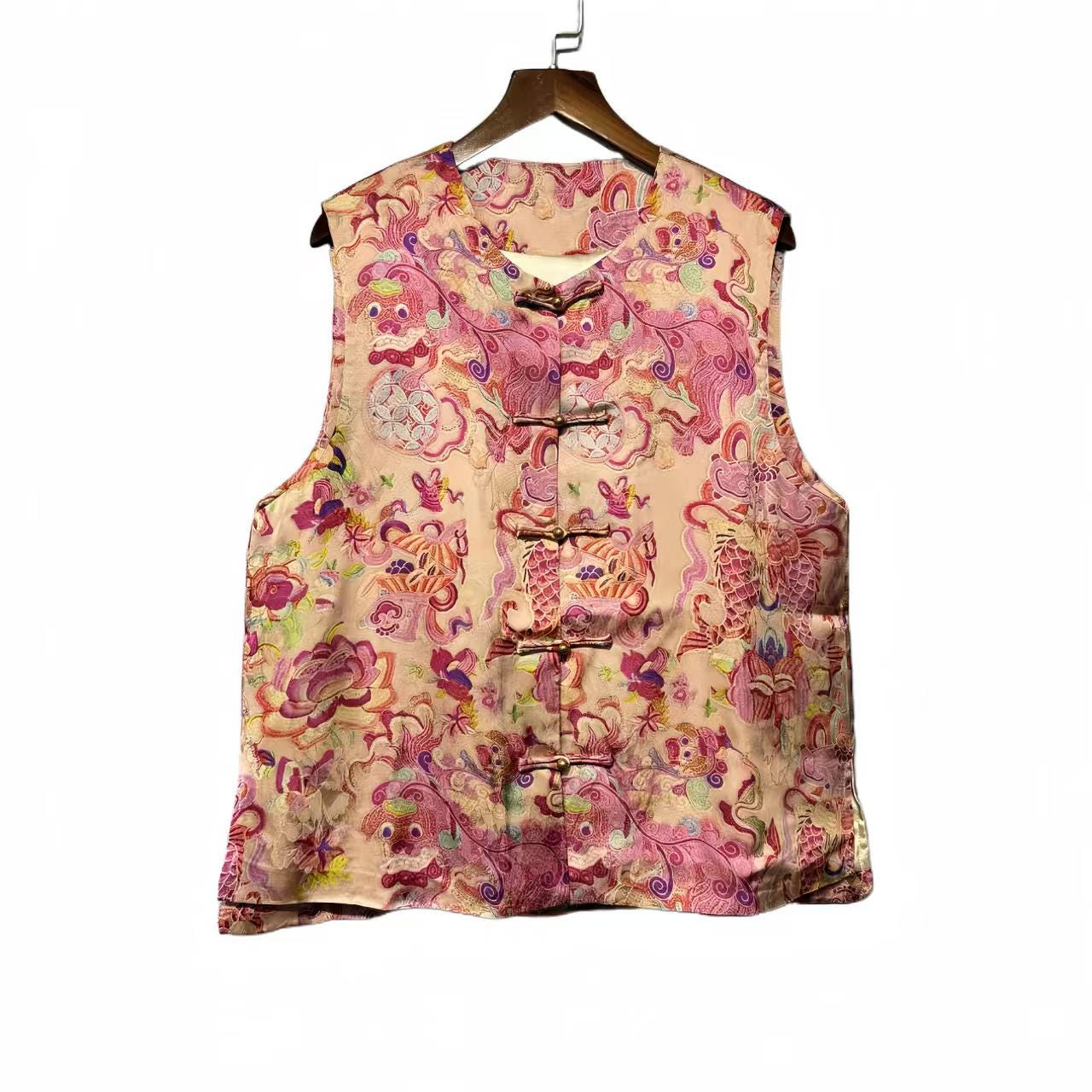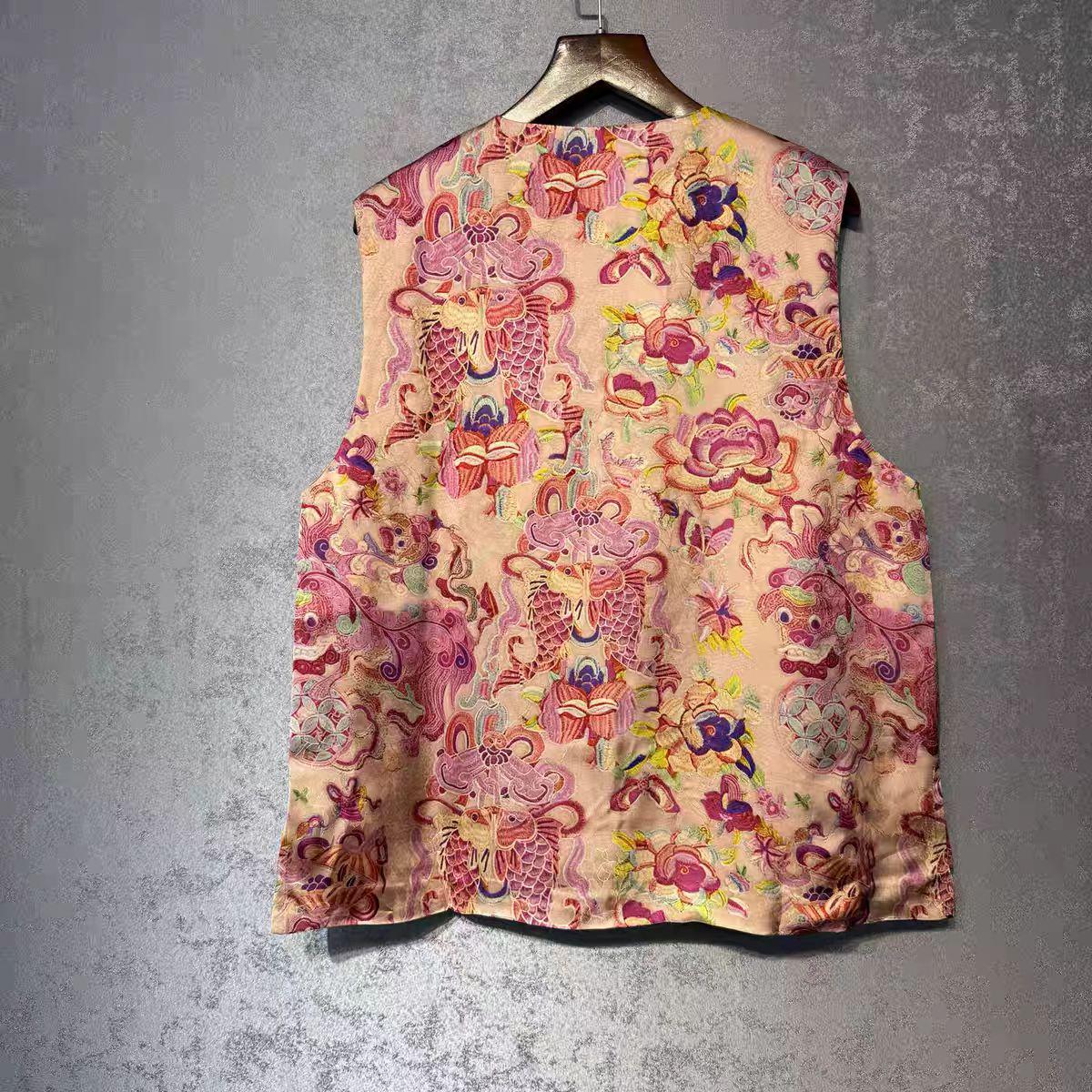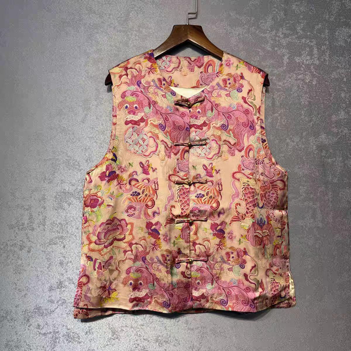 Bring a timeless oriental charm to your wardrobe with this vintage Chinese brocade vest. Crafted from luxurious jacquard satin fabric, it features intricate woven patterns of dragons, phoenixes, and floral clouds—symbols of prosperity and elegance. The vest is designed with traditional frog closures, offering both cultural heritage and a retro-chic style. Perfect layered over shirts or dresses, it's a unique piece for cultural festivals, performances, cosplay, or everyday fashion with an ethnic flair. This vest reflects the beauty of Asian craftsmanship and adds a bold vintage touch to your style.