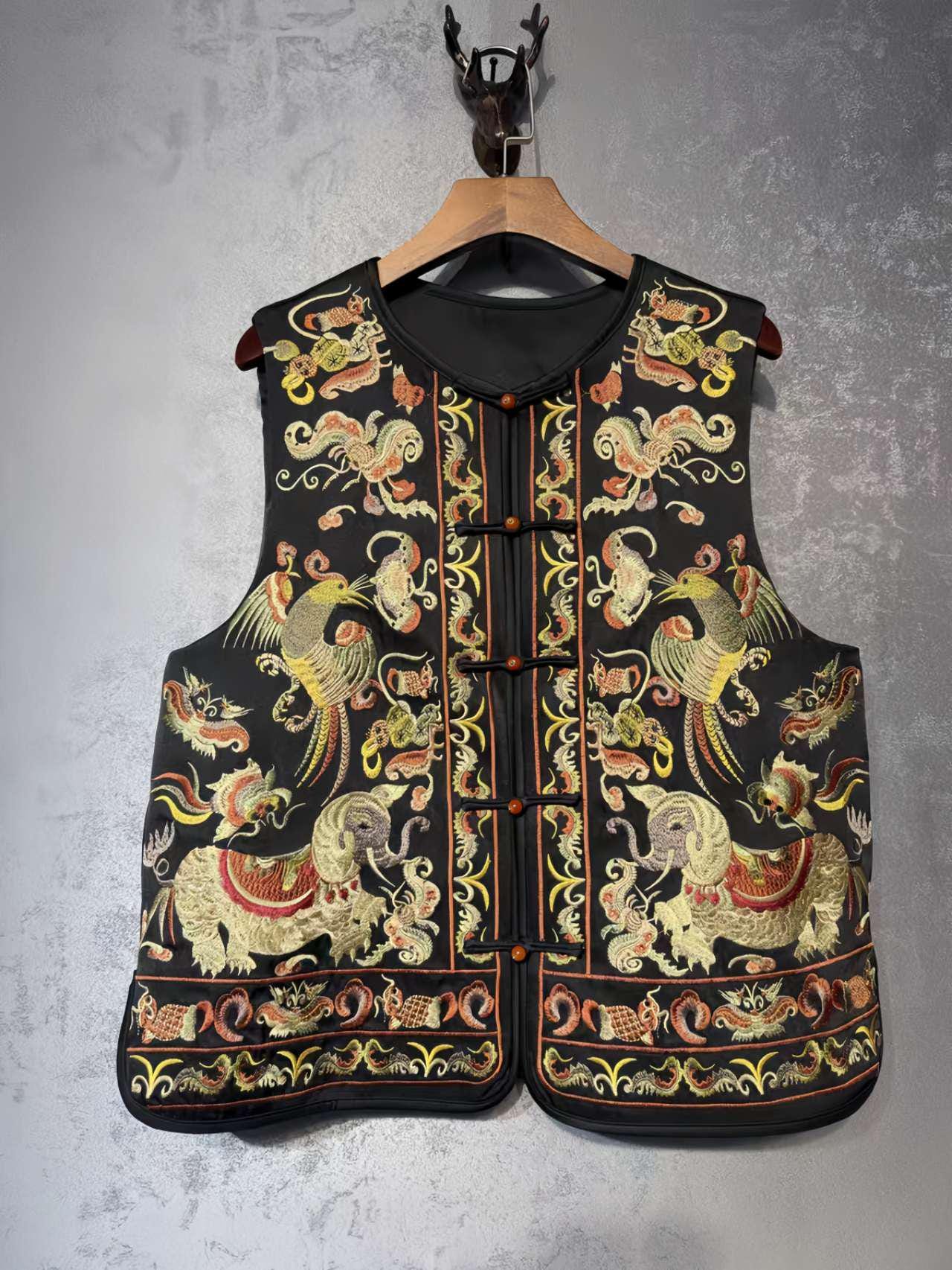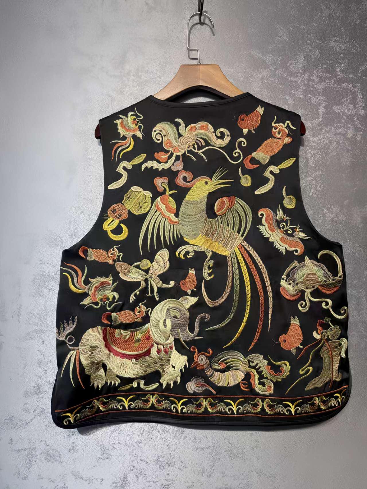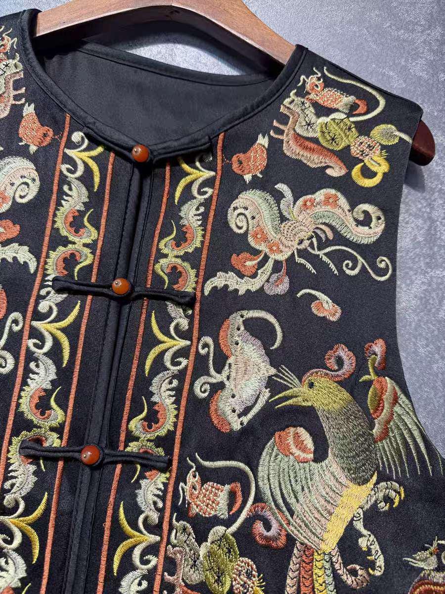 This oriental-style printed satin vest features a vibrant design with hand-embroidered birds and flowers, including a majestic peacock, a symbol of beauty and elegance in Chinese culture. Each piece is meticulously crafted to pay homage to ancient craftsmanship.
