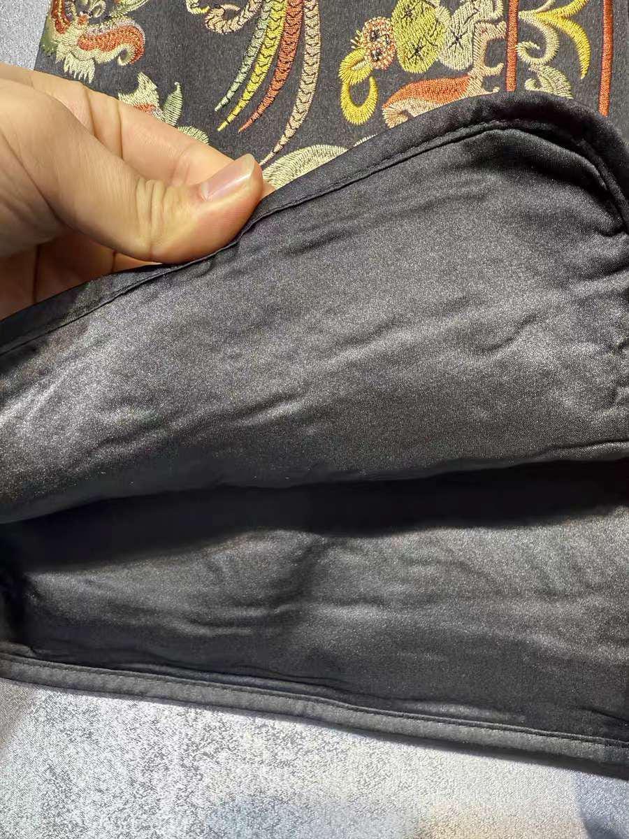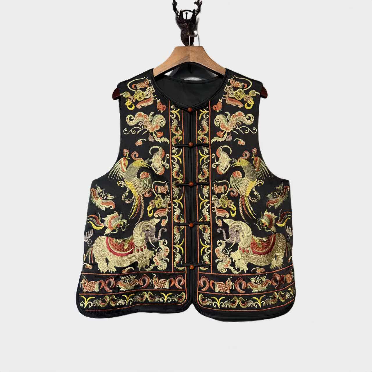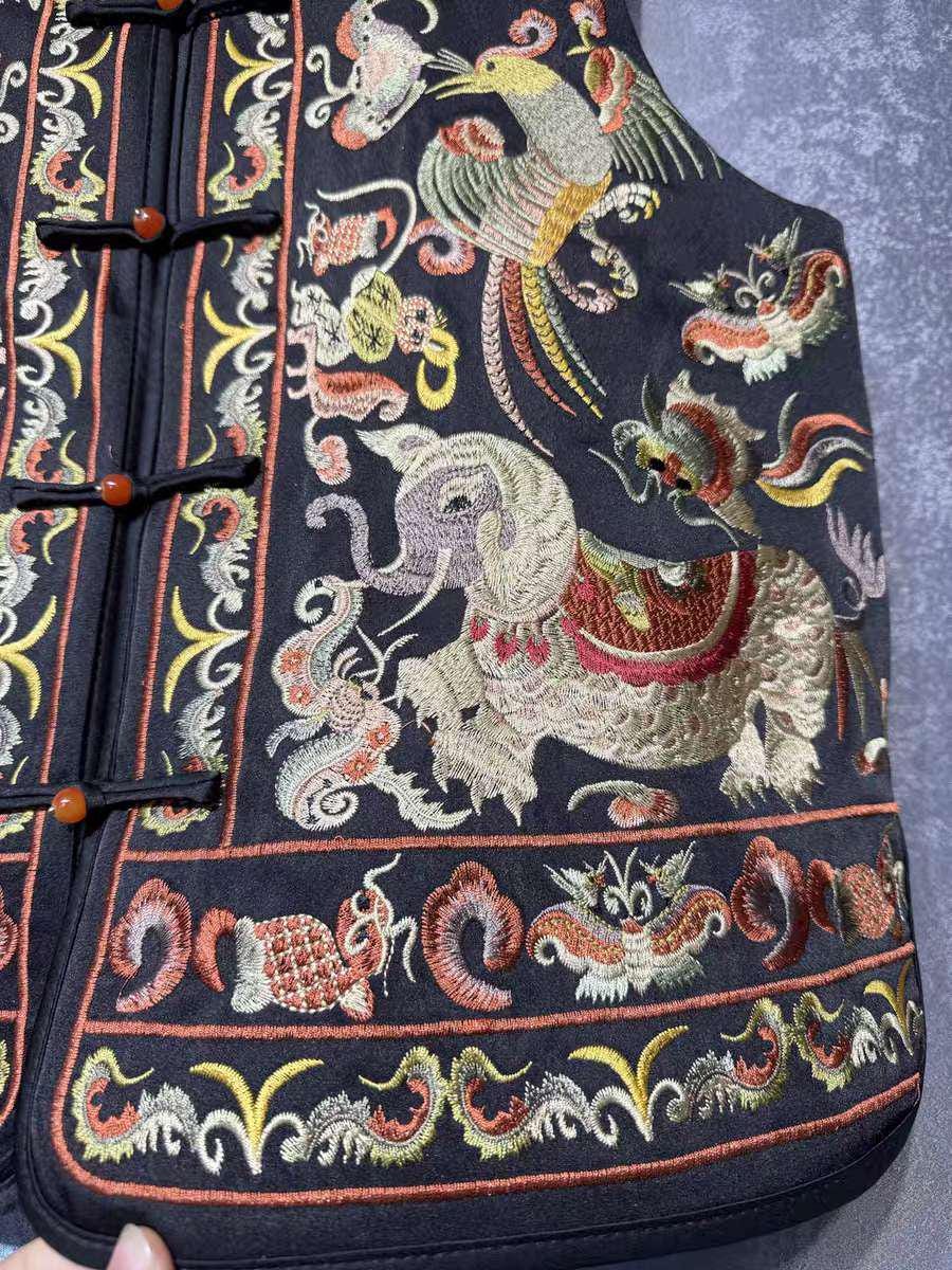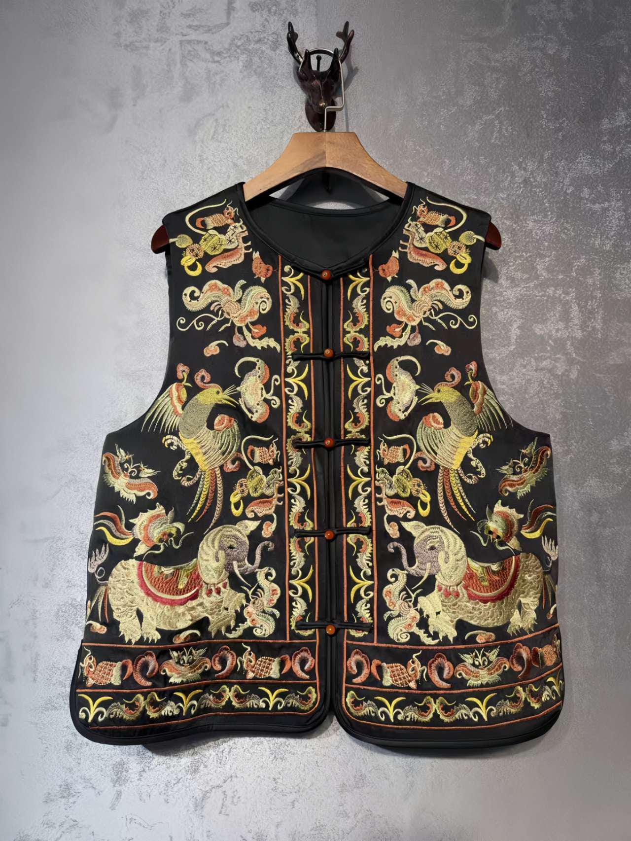 This oriental-style printed satin vest features a vibrant design with hand-embroidered birds and flowers, including a majestic peacock, a symbol of beauty and elegance in Chinese culture. Each piece is meticulously crafted to pay homage to ancient craftsmanship.