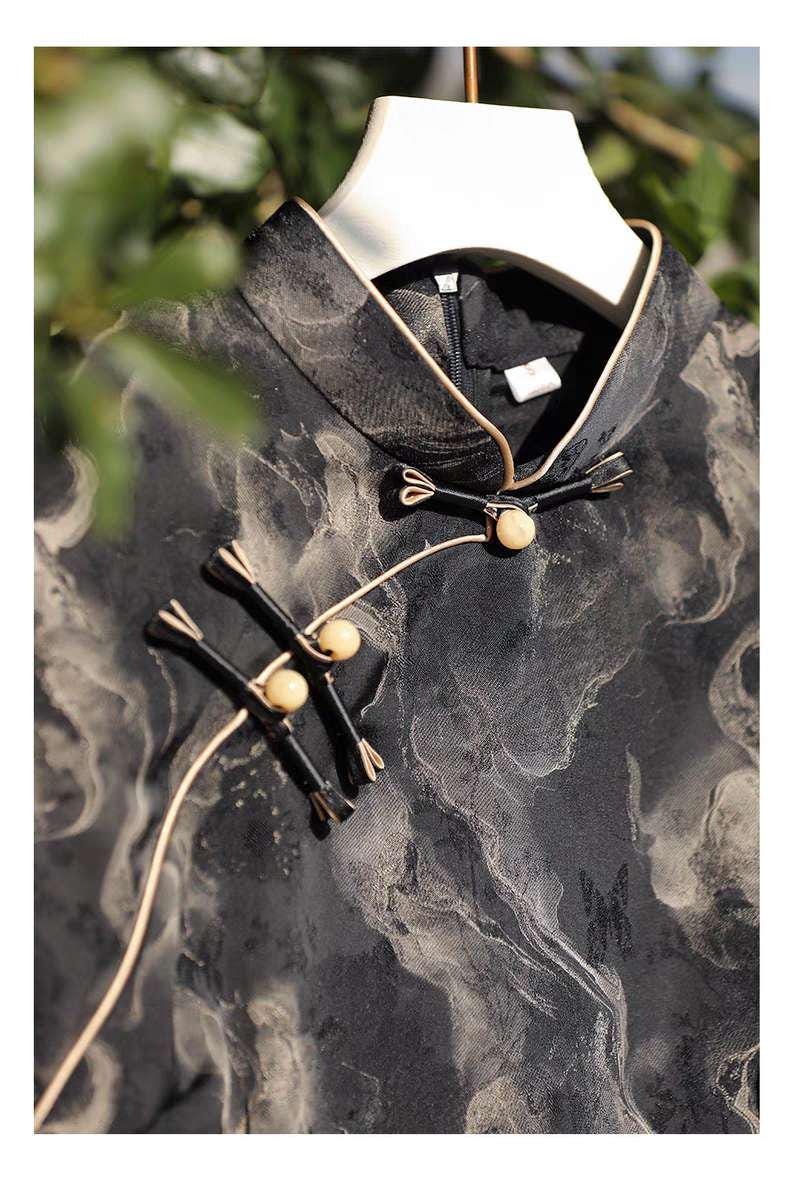 Elevate your style with this elegant vintage black cheongsam dress, a sophisticated reinterpretation of the classic qipao in silk-touch rayon fabric. Featuring a captivating smoky cloud print, this sleeveless dress with a Mandarin collar exudes grace and mystery.