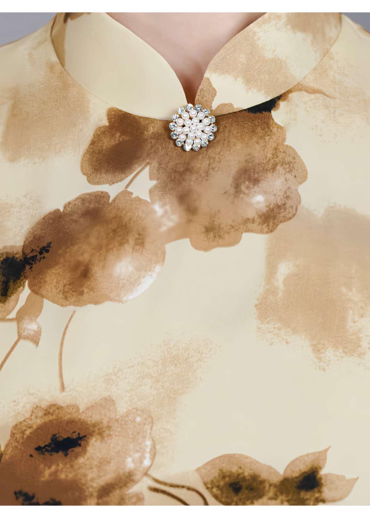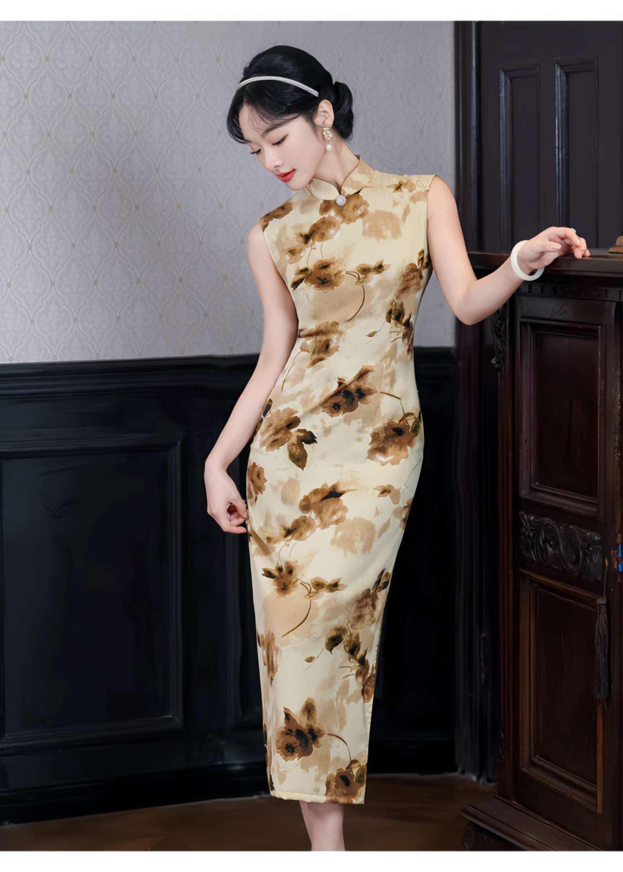 Highlight your style with this vintage-inspired yellow qipao, featuring a delicate watercolor floral print on soft, stretchy milk silk fabric. Featuring a Mandarin collar, a sleeveless silhouette, and a calf-length (122 cm), the design blends Chinese elegance with a refined retro charm.