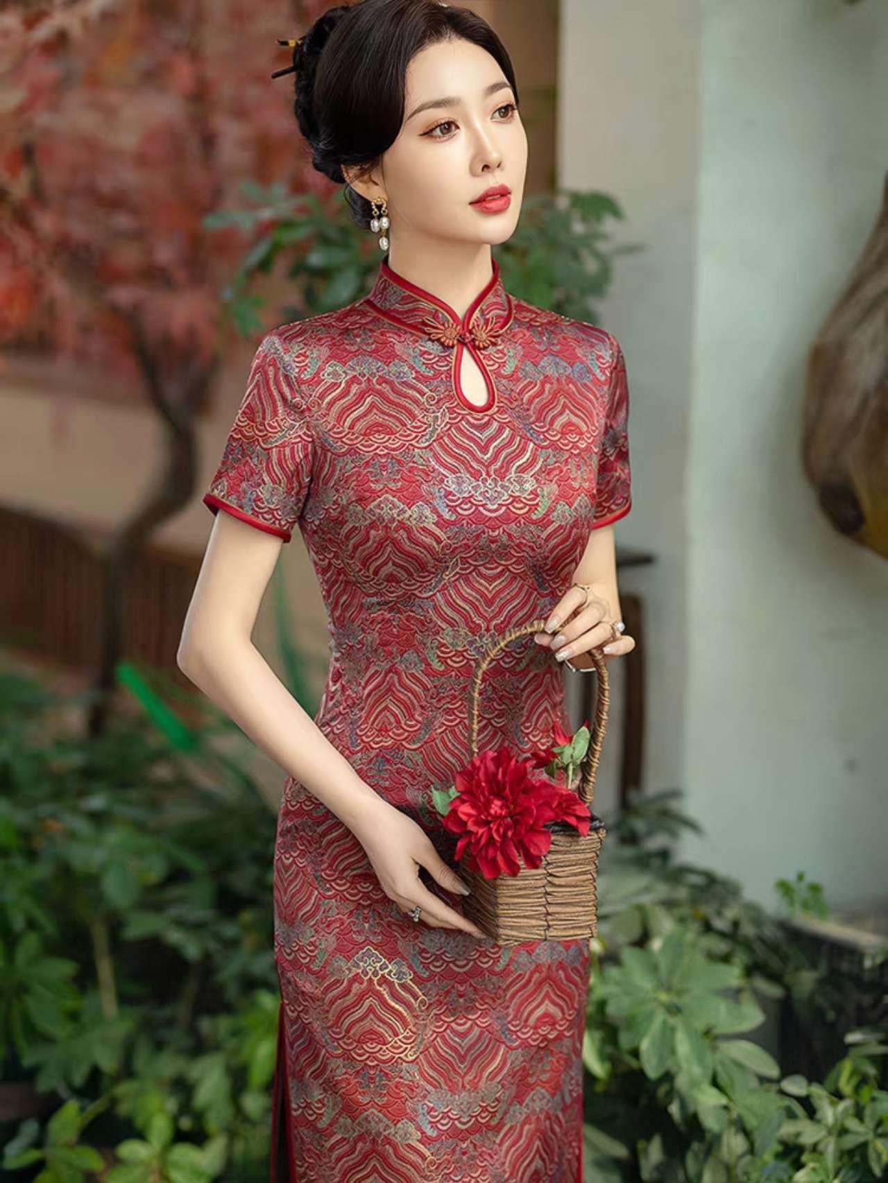 Discover timeless beauty with this vintage red qipao, crafted from luxurious Tencel satin silk, which shimmers delicately with every movement. Inspired by traditional Chinese craftsmanship, this dress features an intricate brocade pattern evoking palace motifs and waves of good fortune.