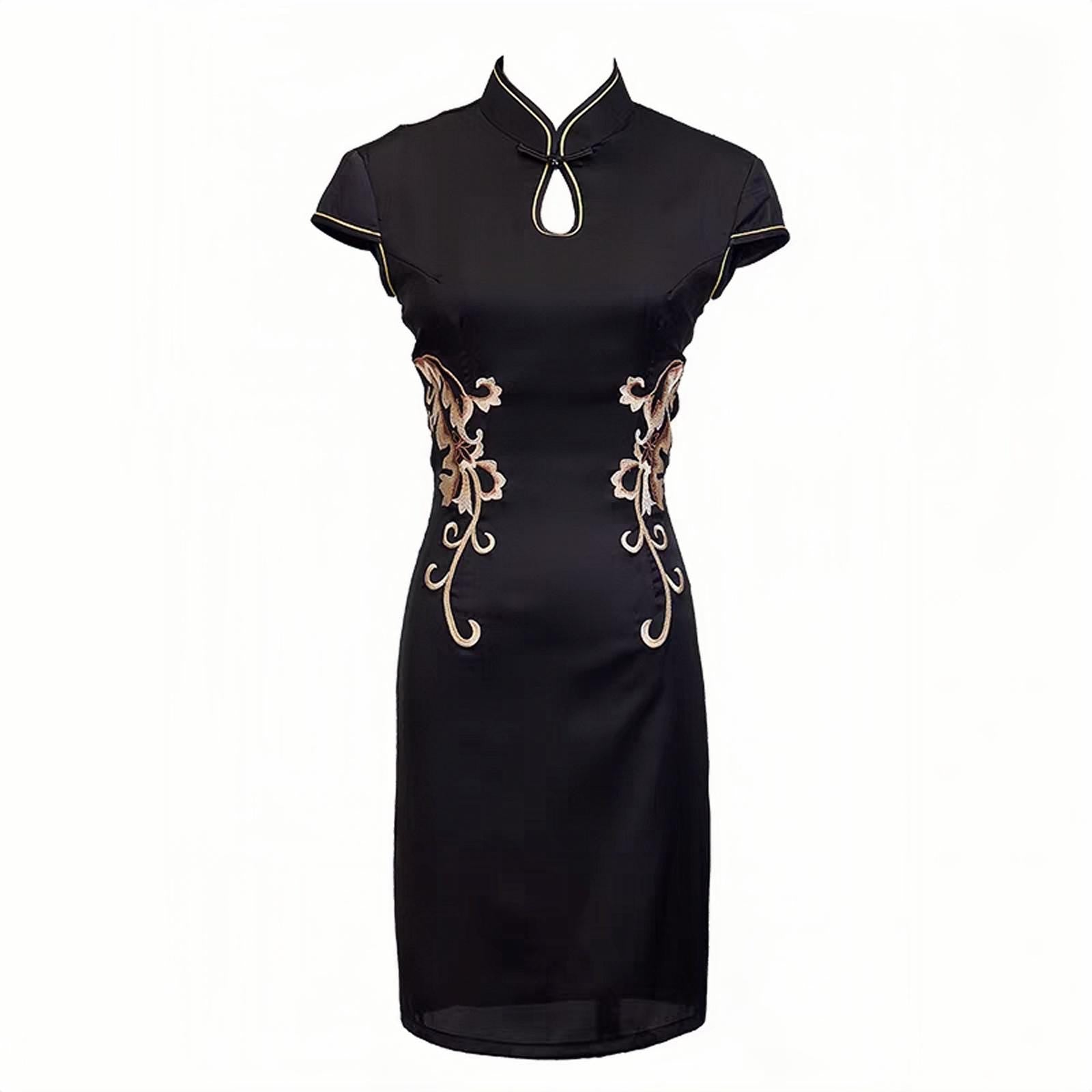 This short black satin qipao, with a fitted design that enhances the feminine silhouette, features embroidered details on both sides of the waist for an artistic and sophisticated look. Its Mandarin collar with a teardrop opening adds a sensual and elegant touch while maintaining a sense of tradition.