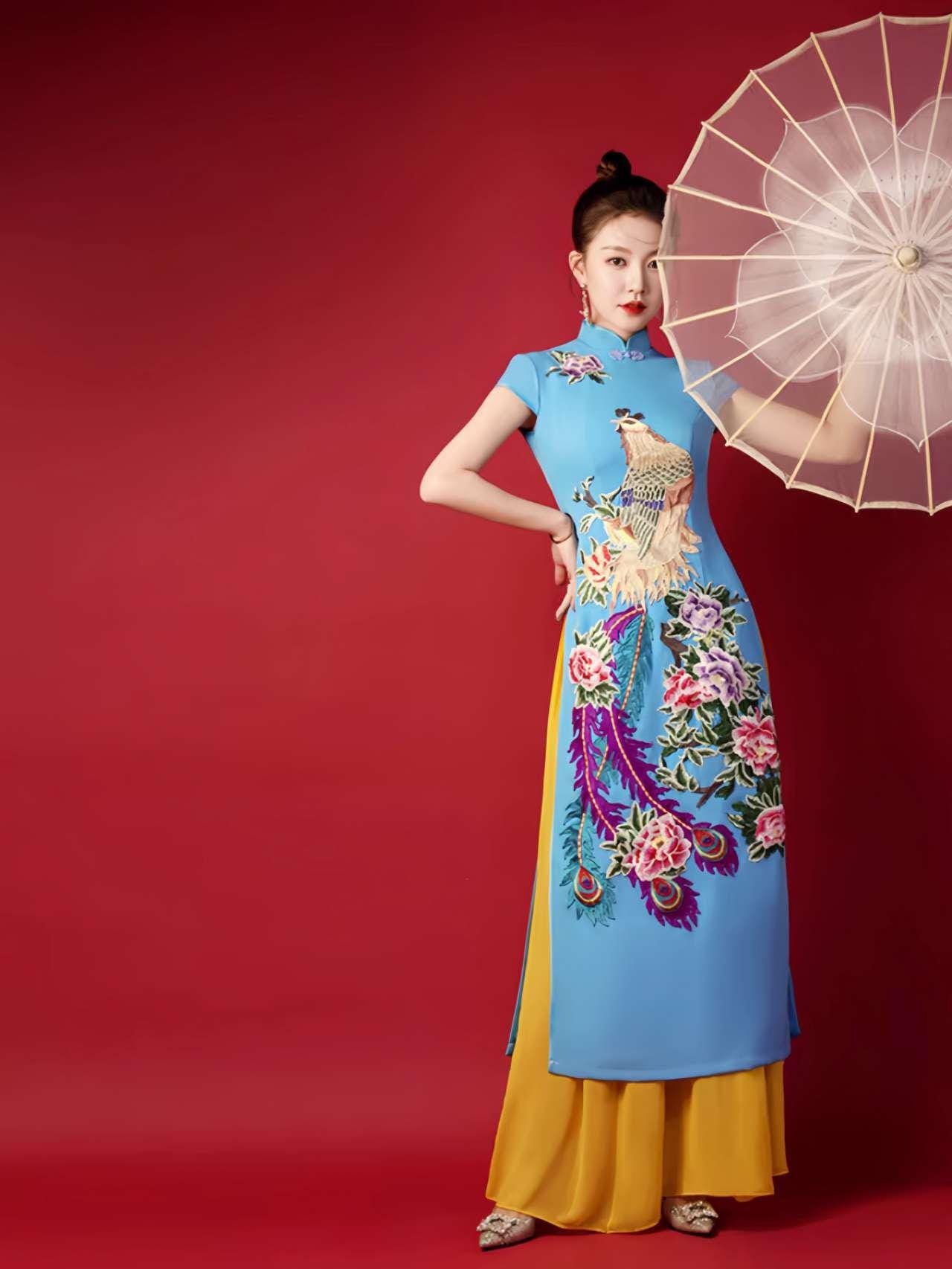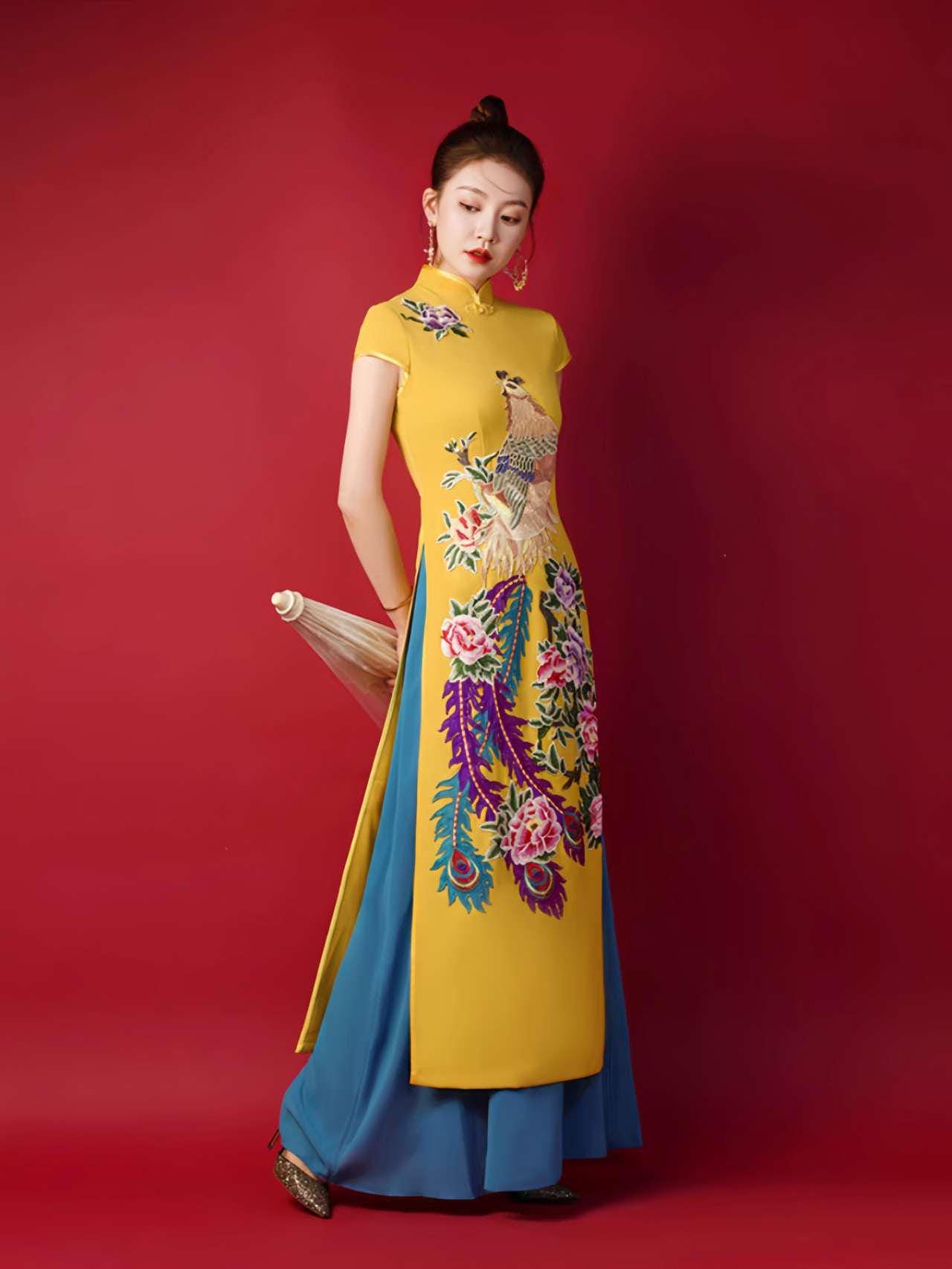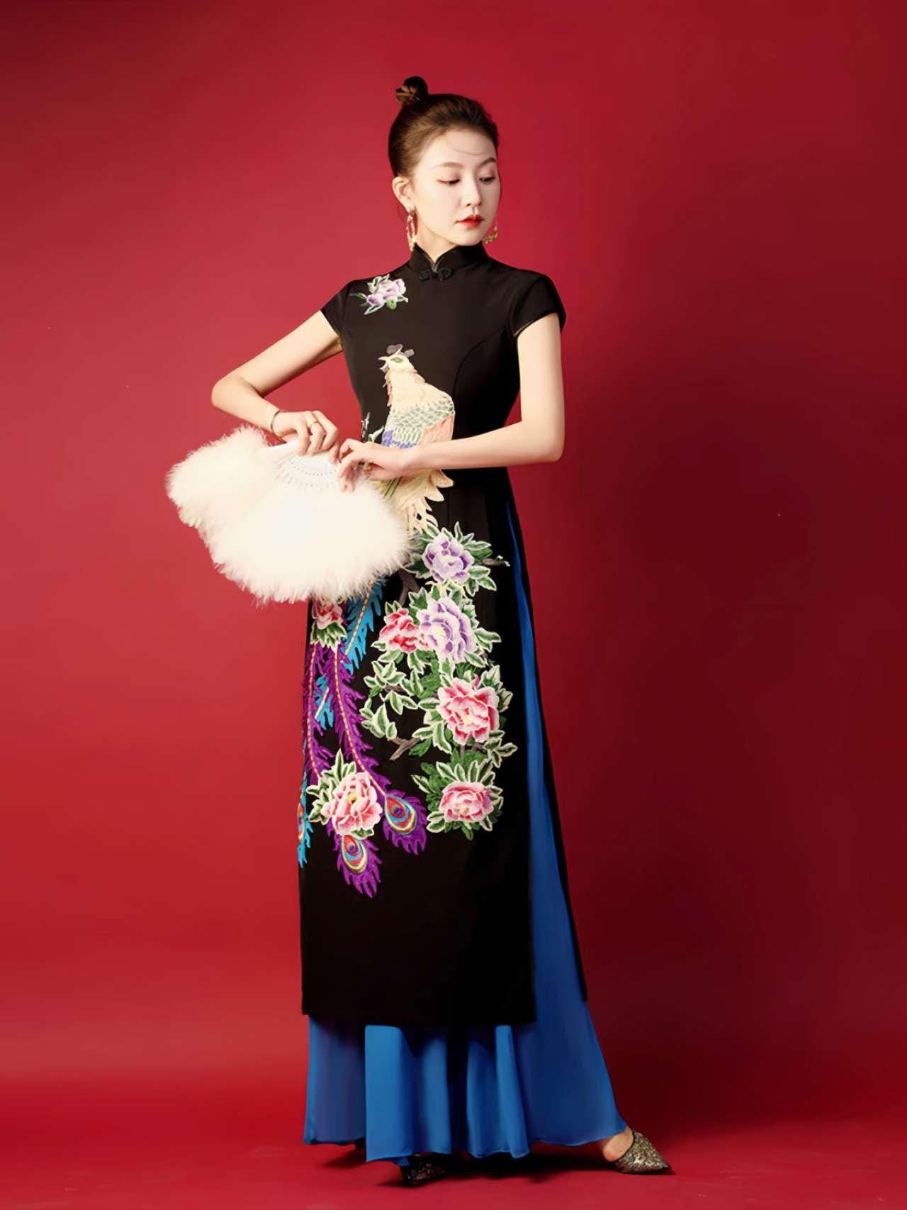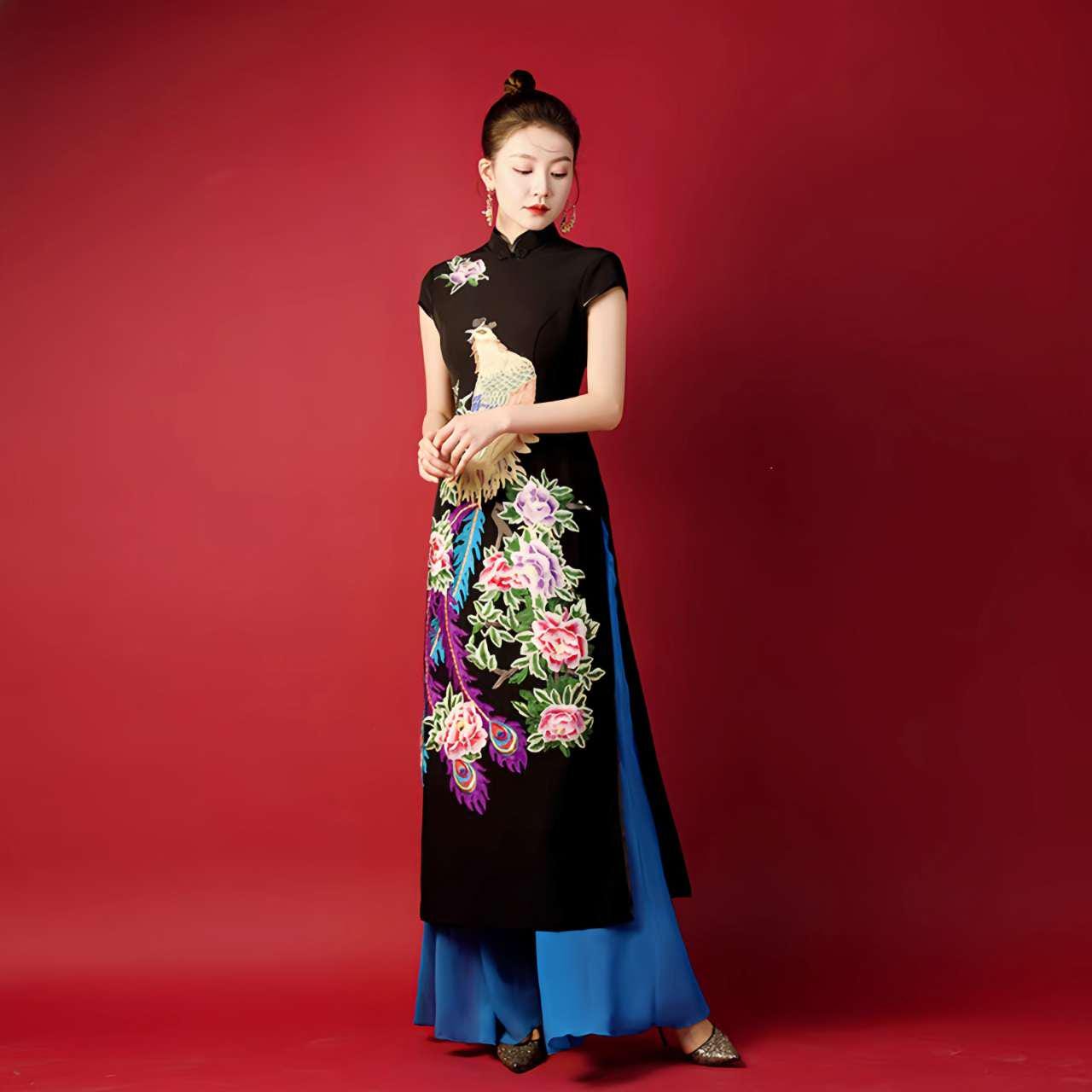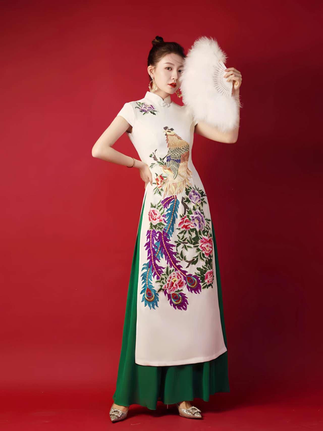 Stand out in this long Ao Dai and Qipao-style dress, a fusion of classic Chinese elegance and fluid Vietnamese design. The peacock and floral embroidery highlights the cultural delicacy with an artistic touch.