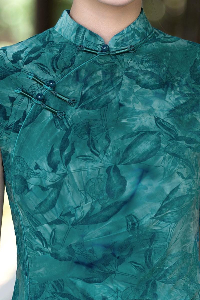 This floral-embossed jacquard qipao dress combines classic Chinese elegance with a fresh, modern feel. The velvet-textured jacquard fabric features a three-dimensional green floral design that lends a subtle, feminine beauty.