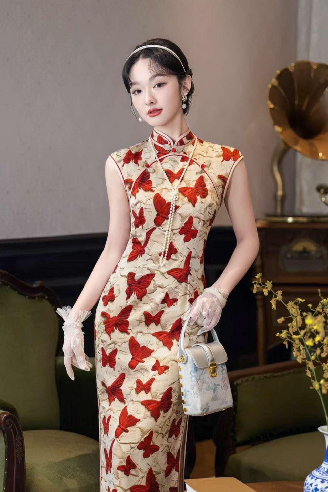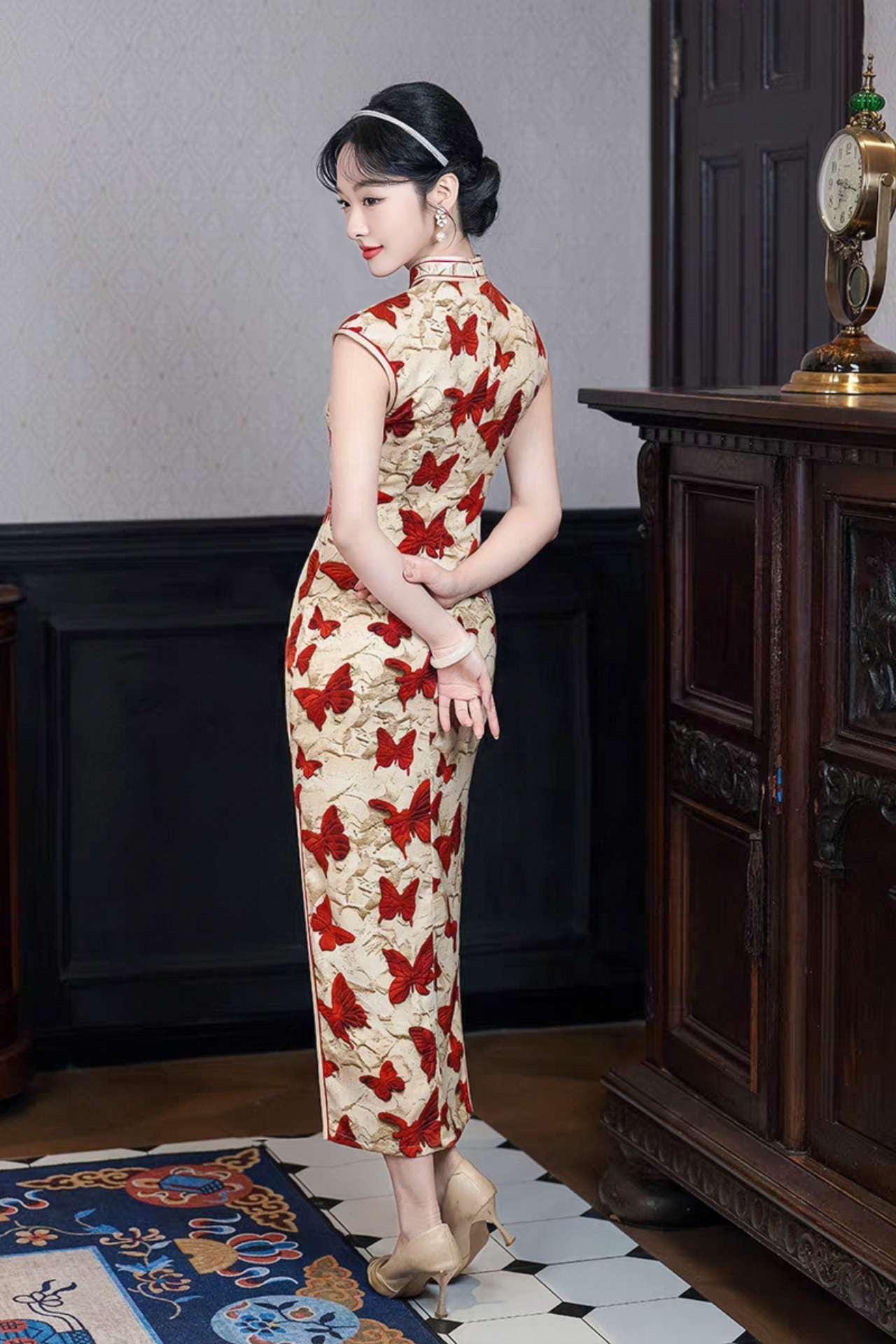 Flowing like a butterfly and shimmering with tradition, this vintage butterfly-print qipao combines romantic symbolism with timeless Chinese elegance.