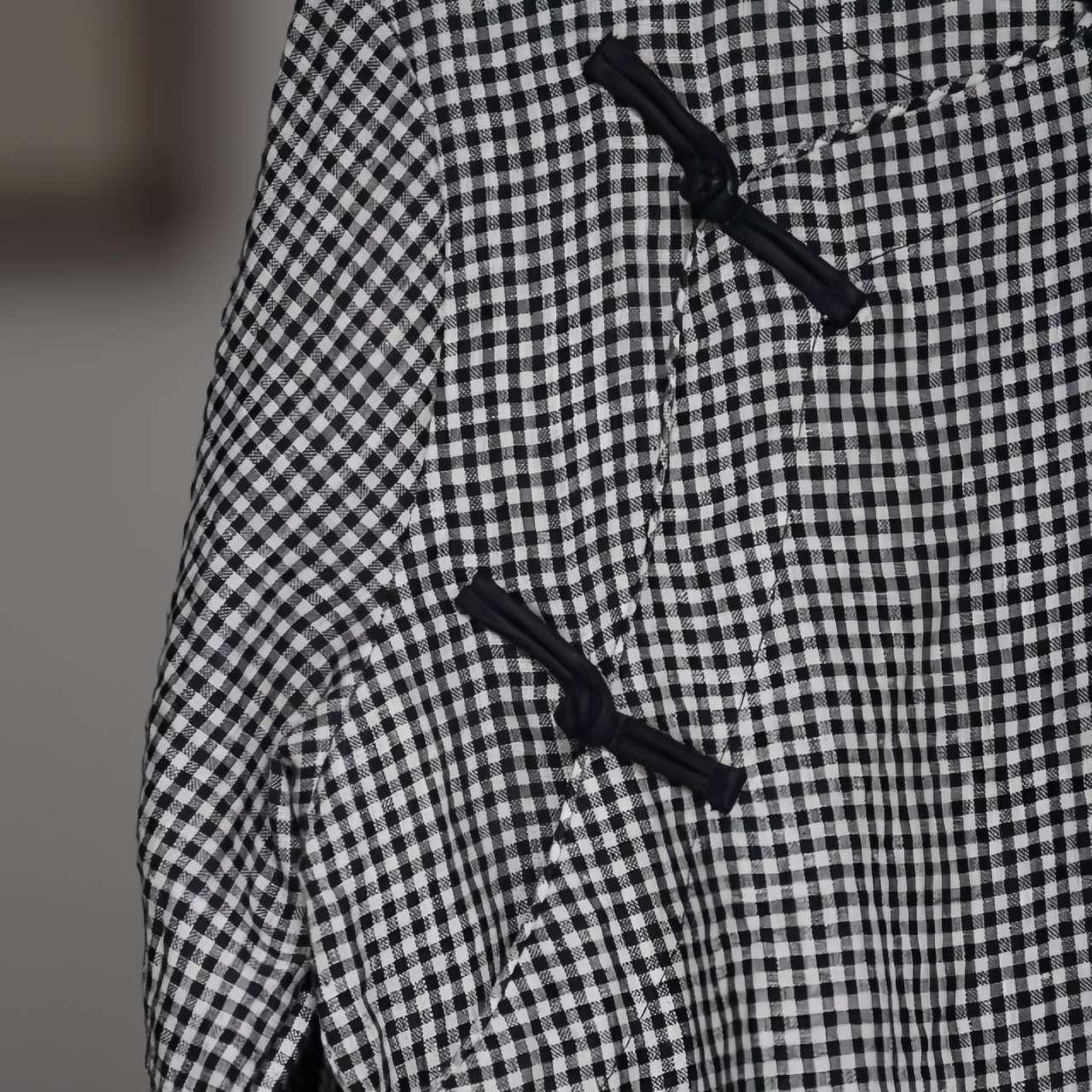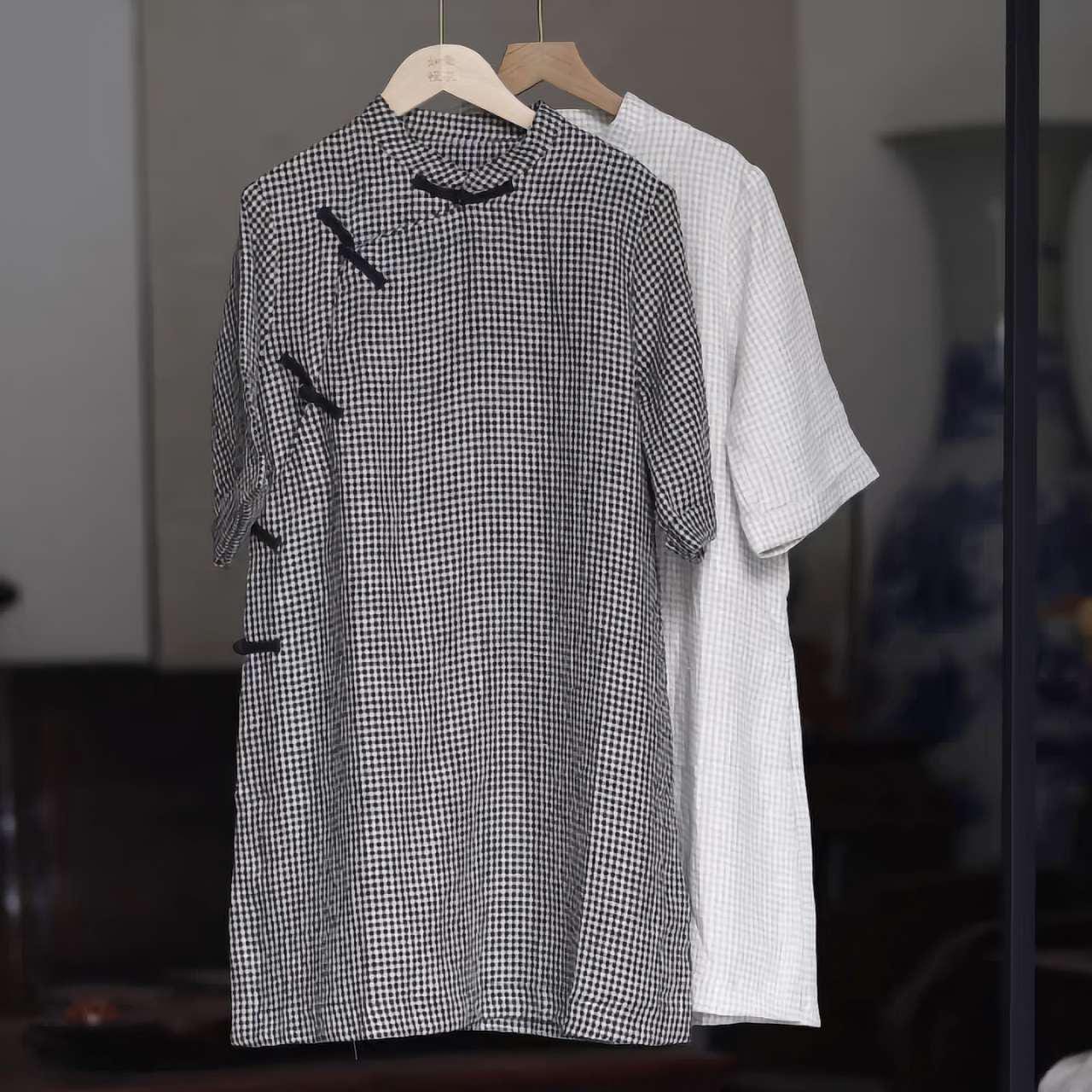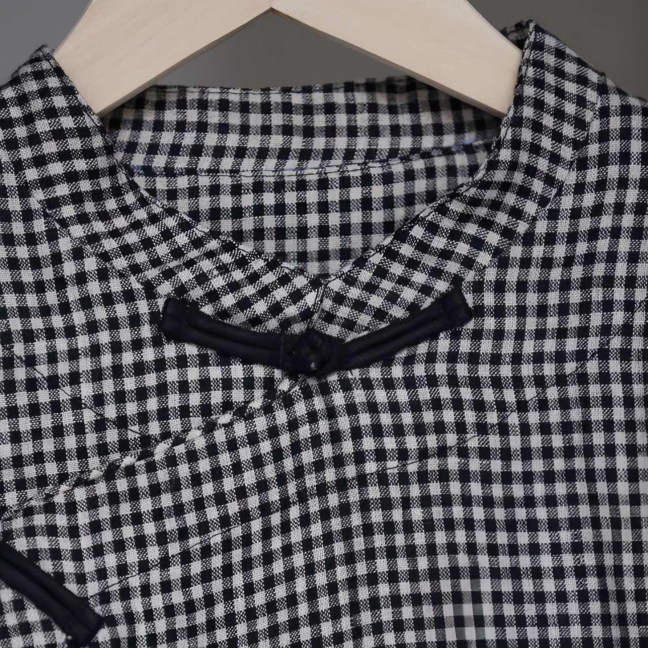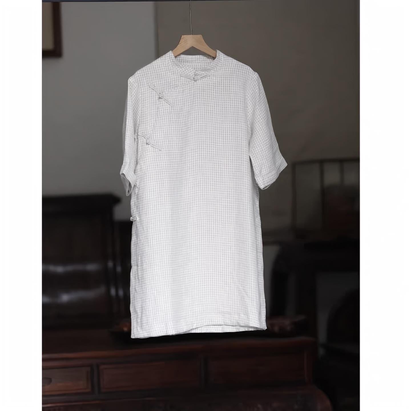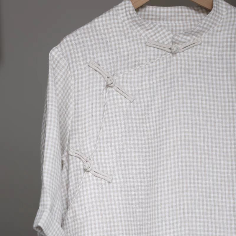 Bring quiet elegance to your wardrobe with this vintage-style checked Chinese tea shirt. Crafted with a mandarin collar, traditional diagonal closures, and a loose, mid-length cut, it offers a relaxed silhouette, ideal for tea ceremonies, cultural retreats, or slow-living fashion.
