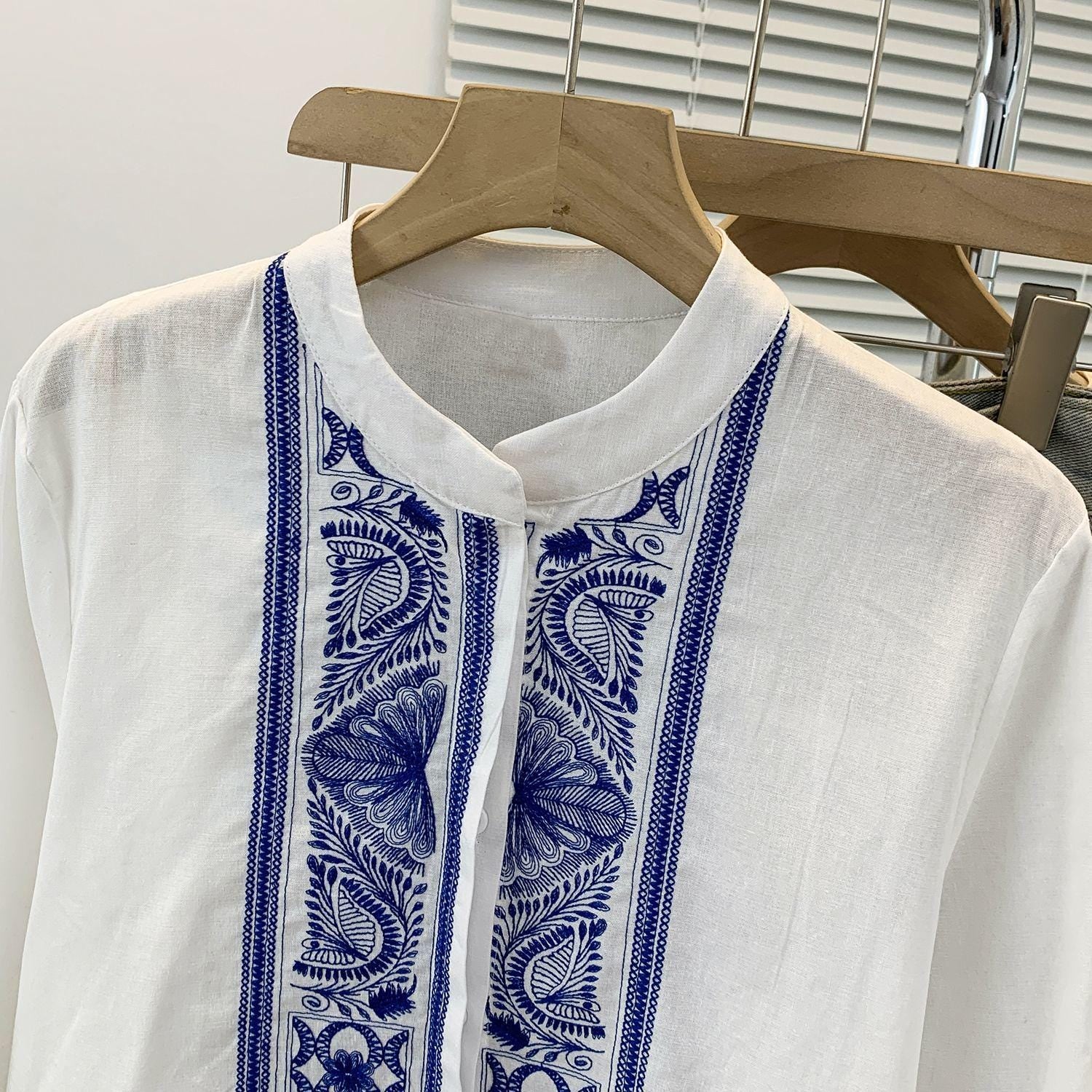 Look effortlessly elegant in this bohemian linen blouse. Featuring handcrafted embroidery details, this lightweight and breathable piece is perfect for spring and summer. Inspired by traditional folk patterns, this vintage shirt adds a sophisticated and timeless touch to any wardrobe. Its relaxed fit and long sleeves make it ideal for casual outings, vacations, or a cozy day at home.