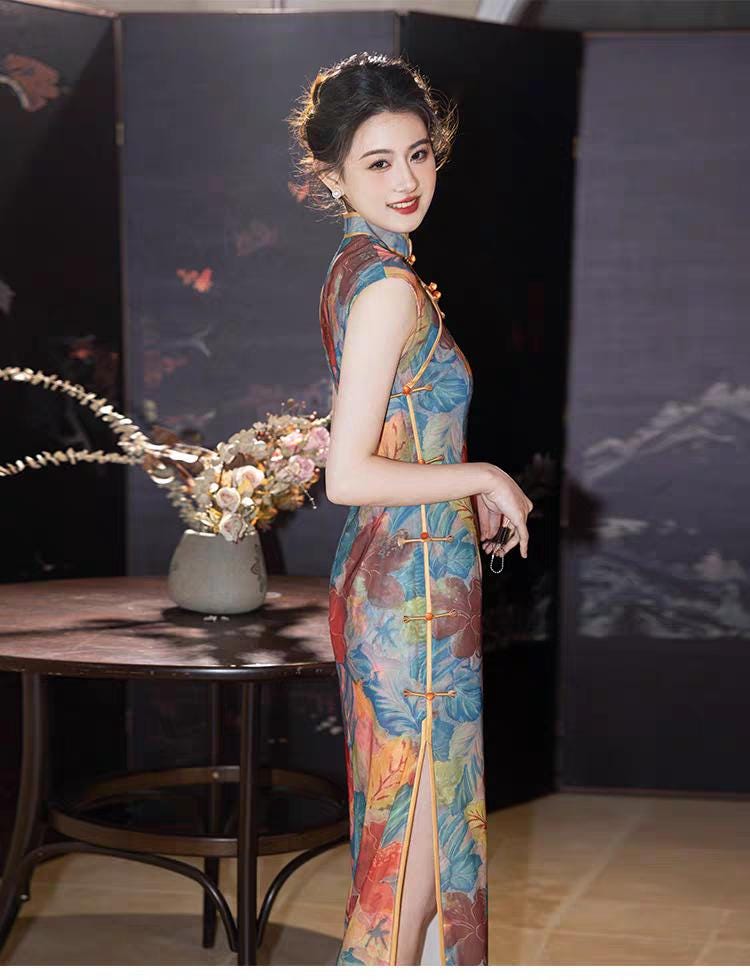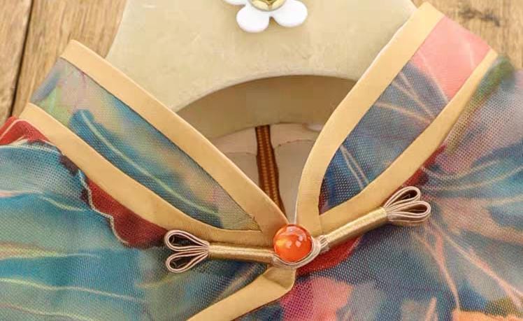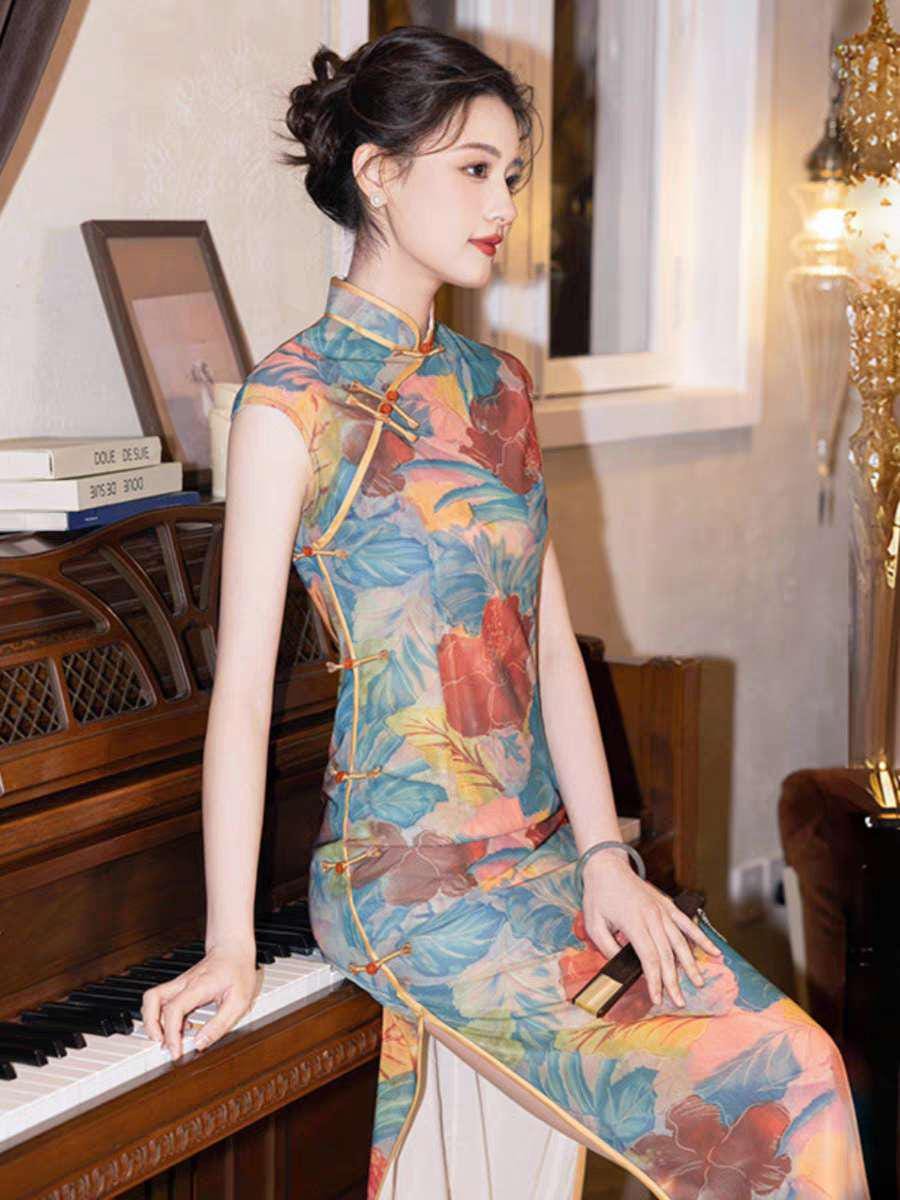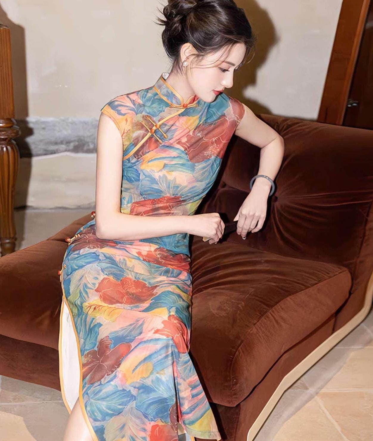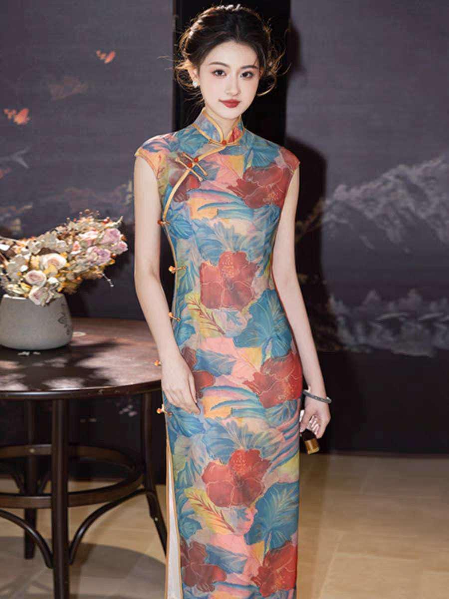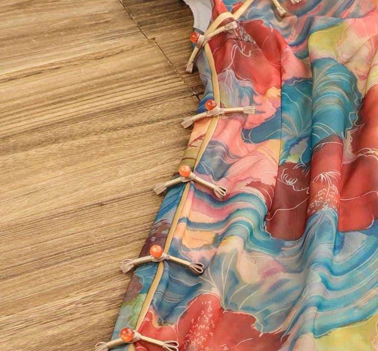 This Dopamine-style qipao dress is a celebration of summer. With a vibrant floral print and bold colors, it exudes positive energy and joy. The blend of Chinese elegance with a modern artistic style makes it a perfect piece for outdoor events, photoshoots, or spontaneous getaways.