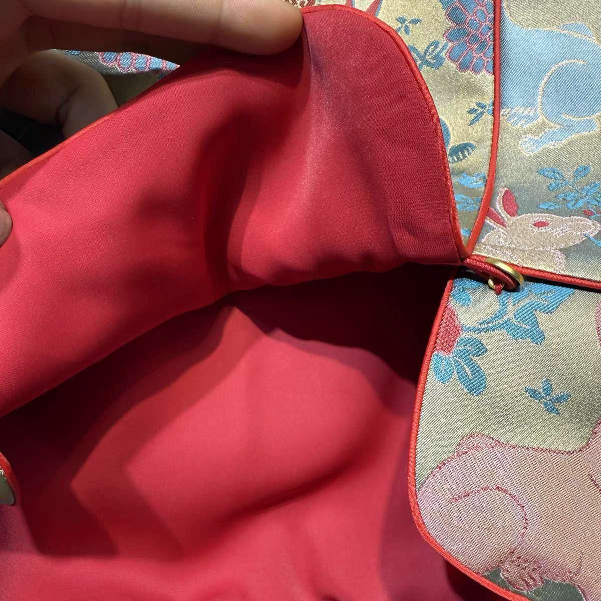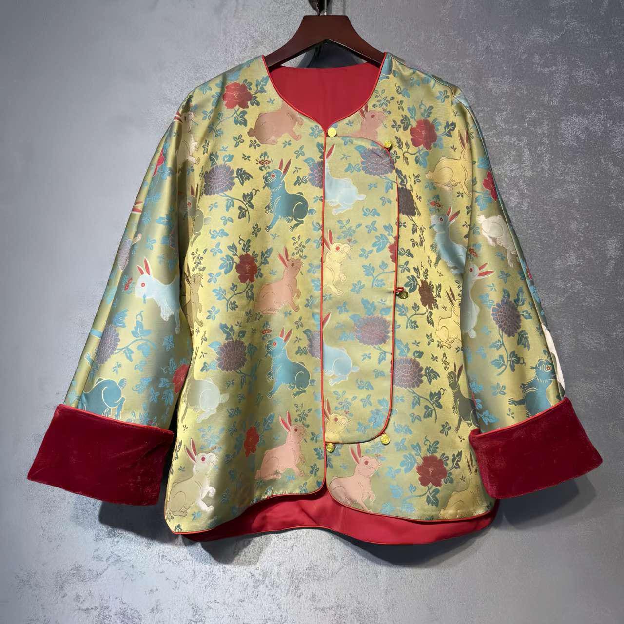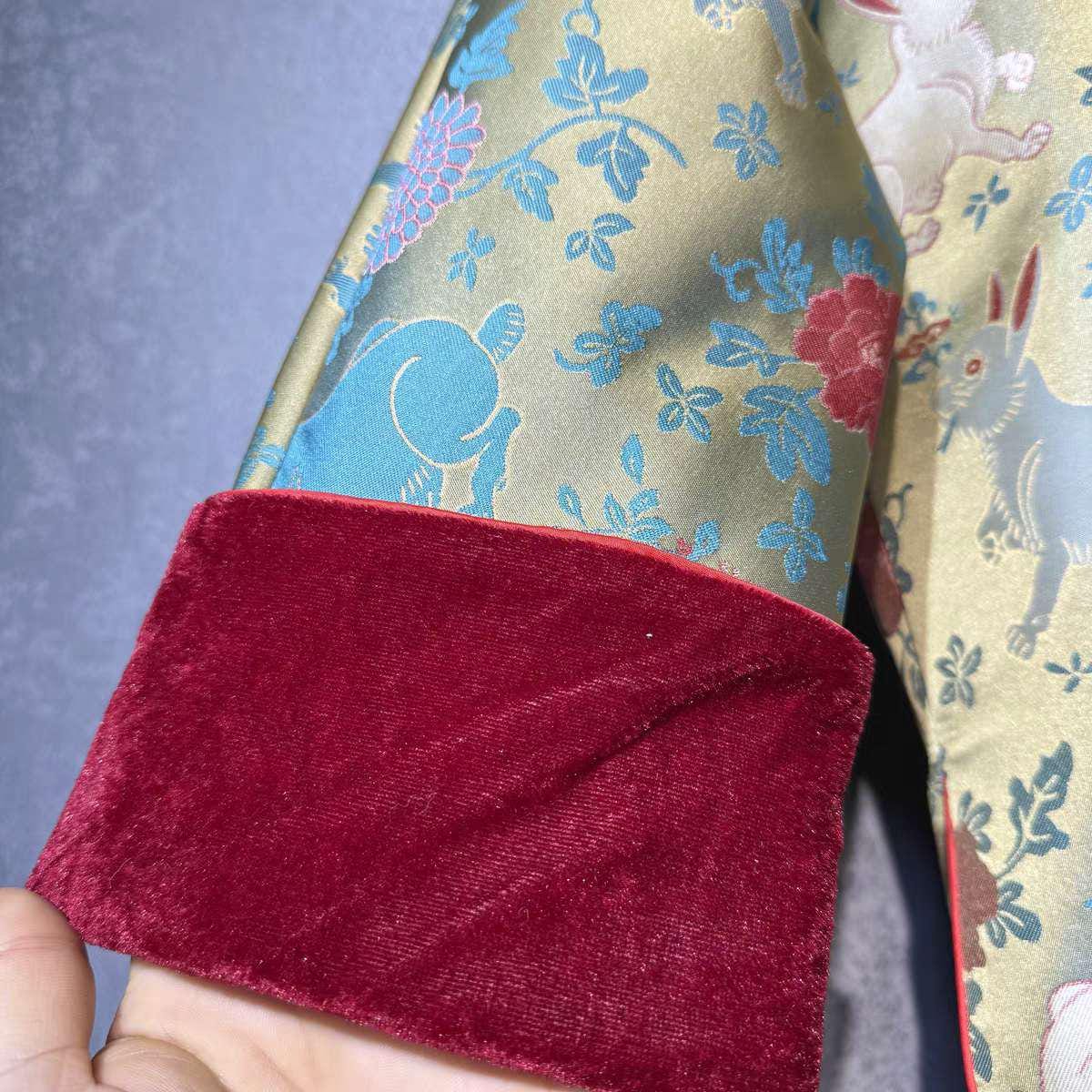 Crafted from high-quality Song brocade, it features an adorable pattern of softly colored rabbits among traditional flowers. Red velvet cuffs and bright red accents add a warm, festive touch.