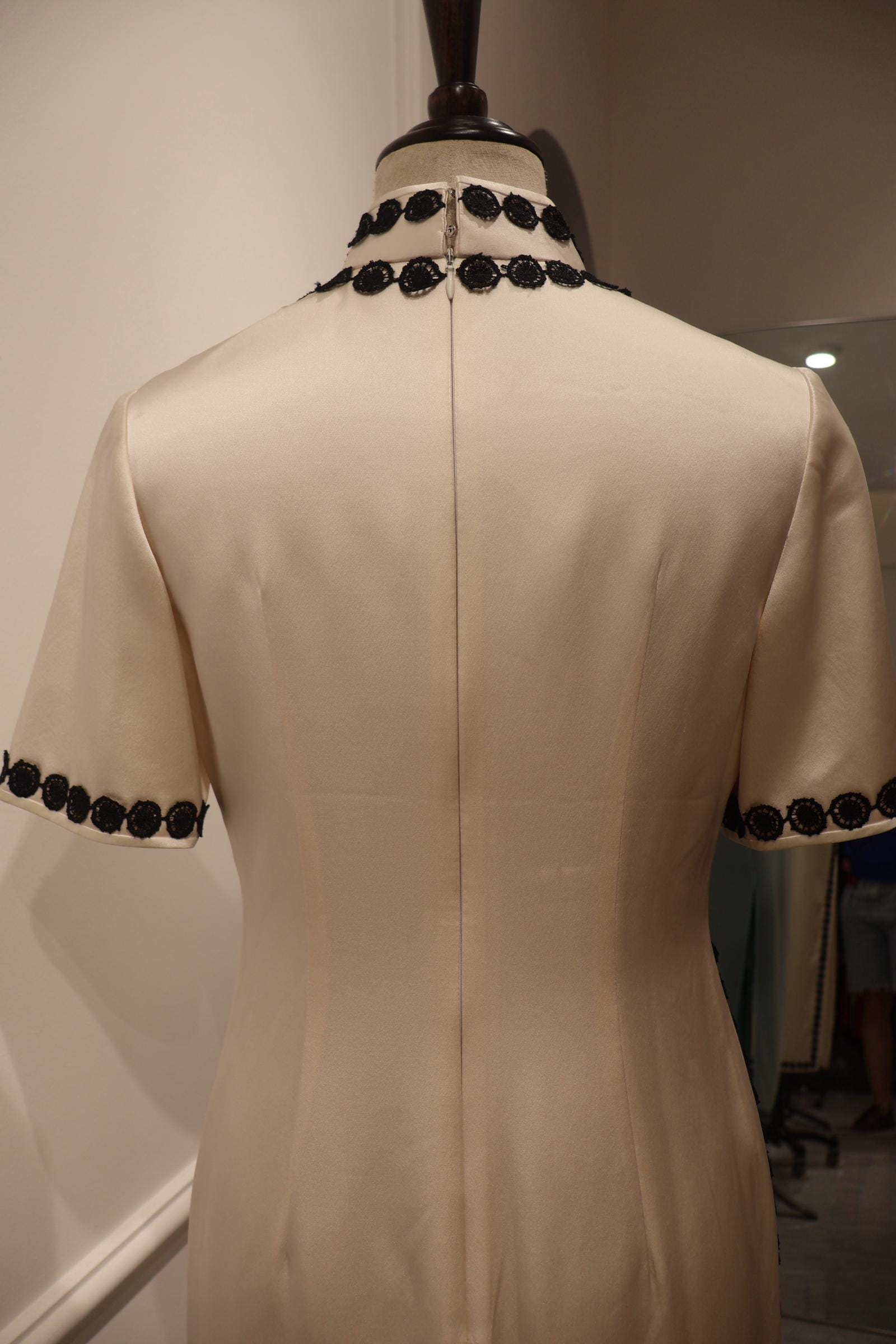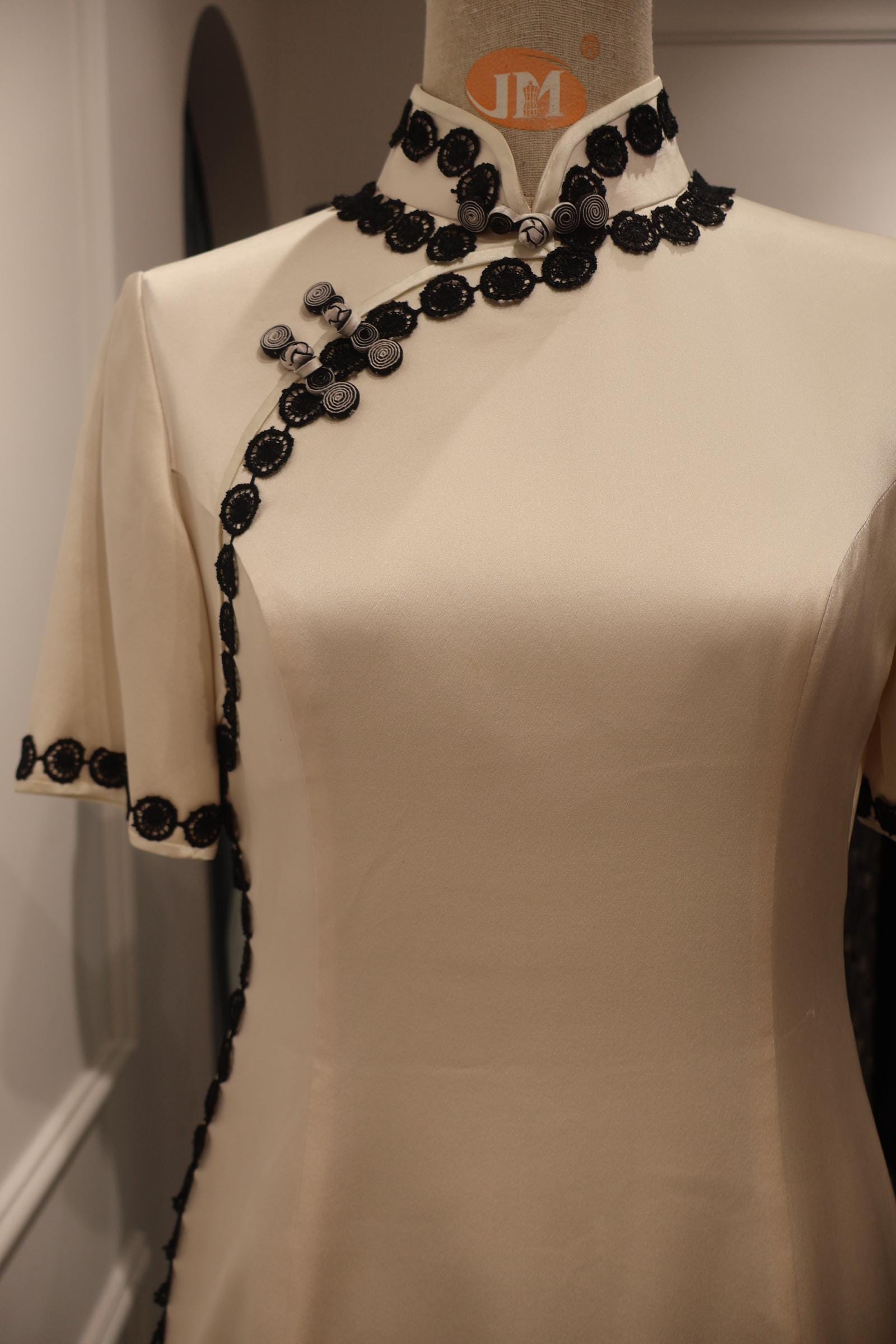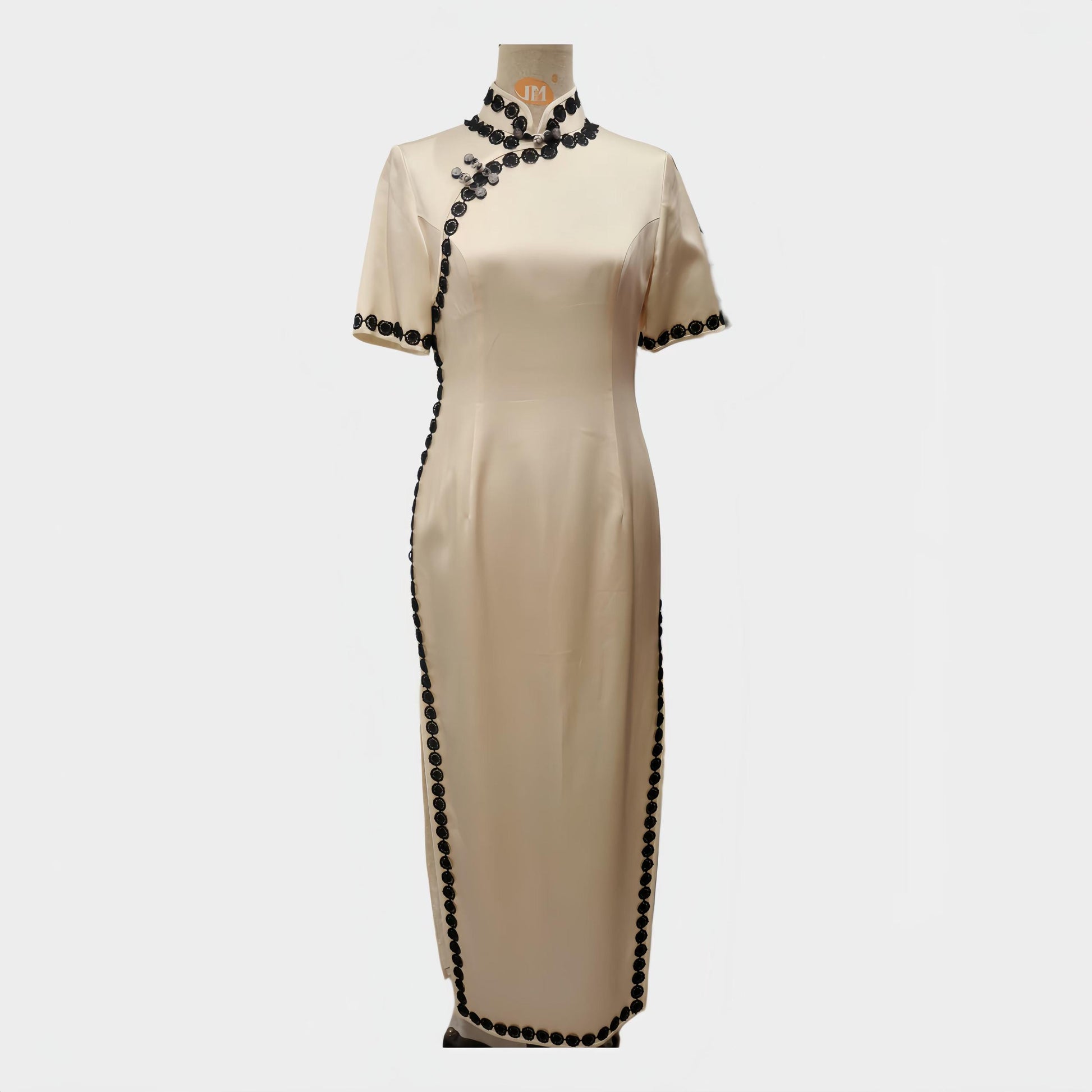 It features a Mandarin collar, short sleeves, and an ankle-length silhouette with delicate black Chinese buttons that frame the lines of the body. The elegant fit emphasizes femininity, while the soft silk adds shine and comfort.