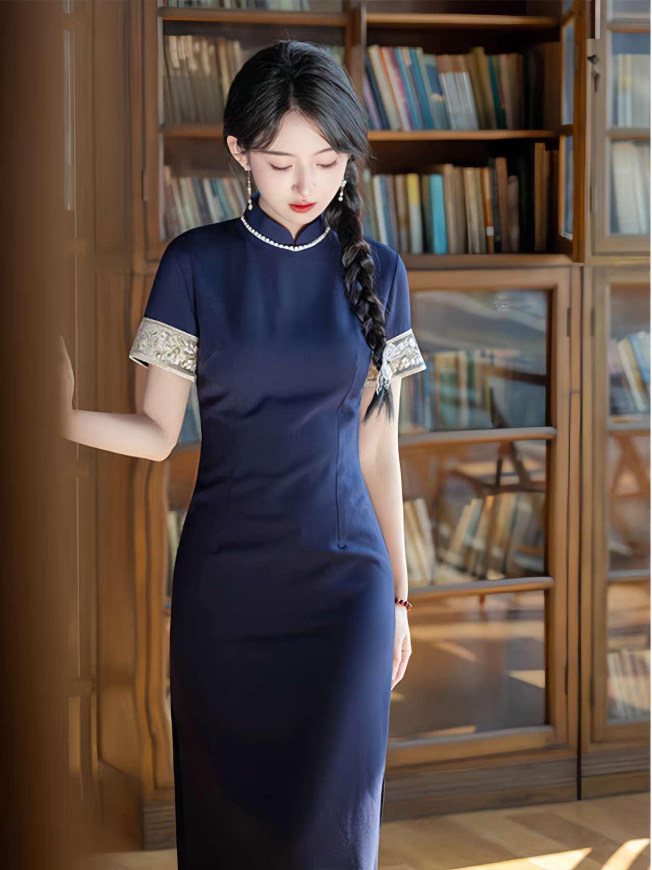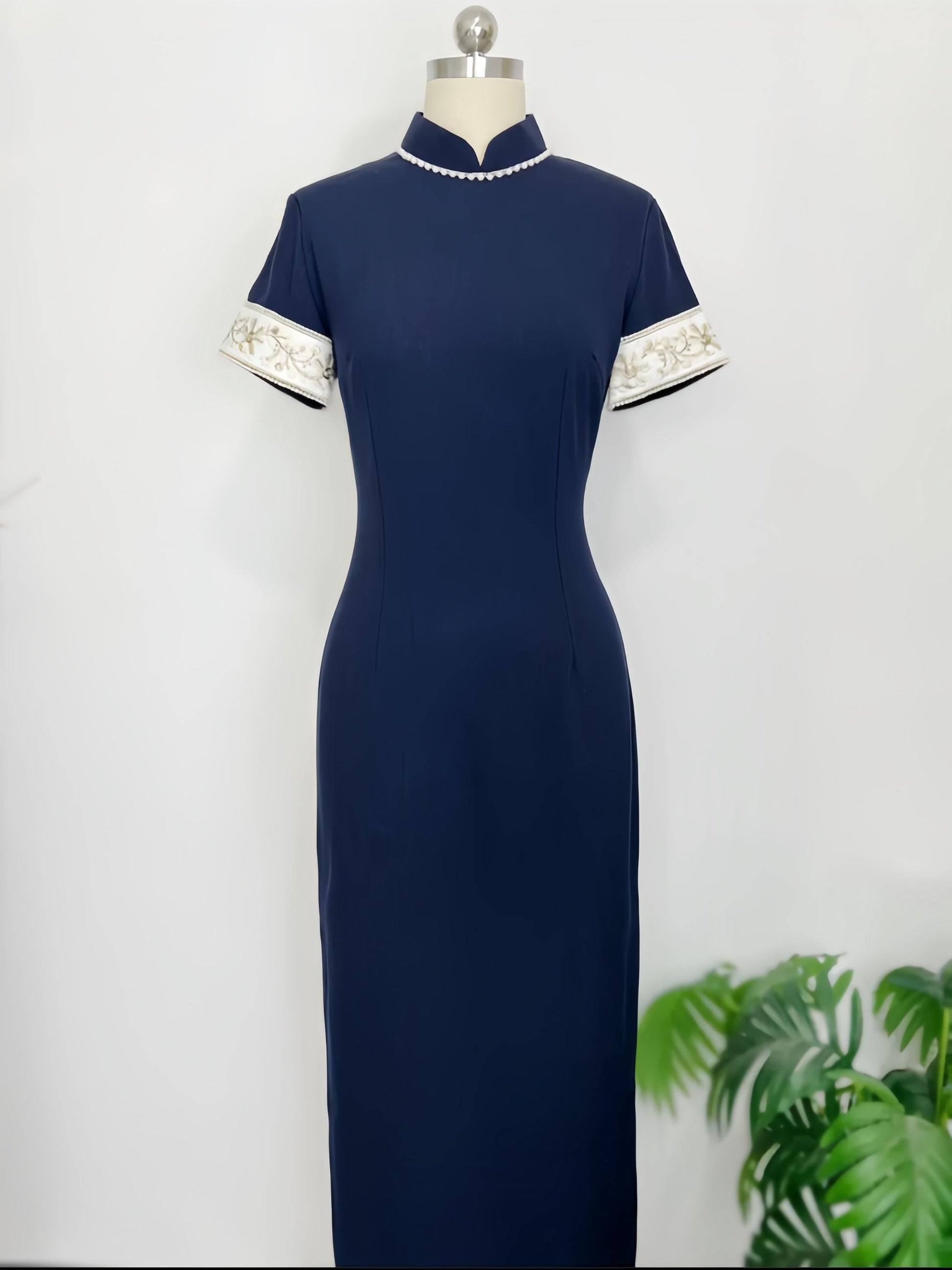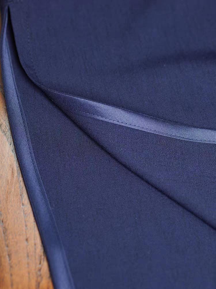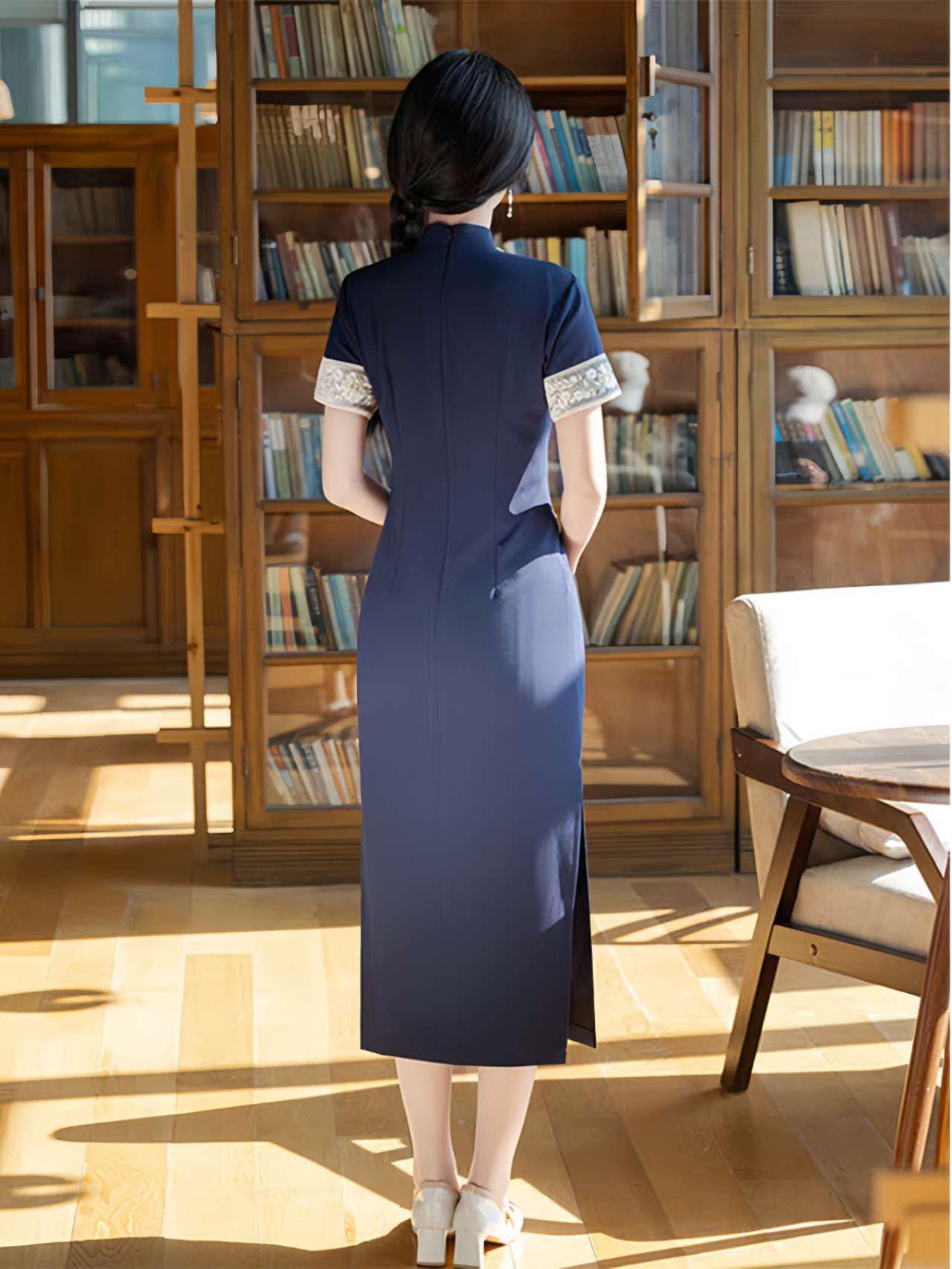 Crafted from a Tencel and linen blend, this deep navy qipao combines modern minimalism with the refined silhouette of traditional Chinese design. The contrasting cuffs feature delicate floral embroidery for a subtle and elegant decorative touch.