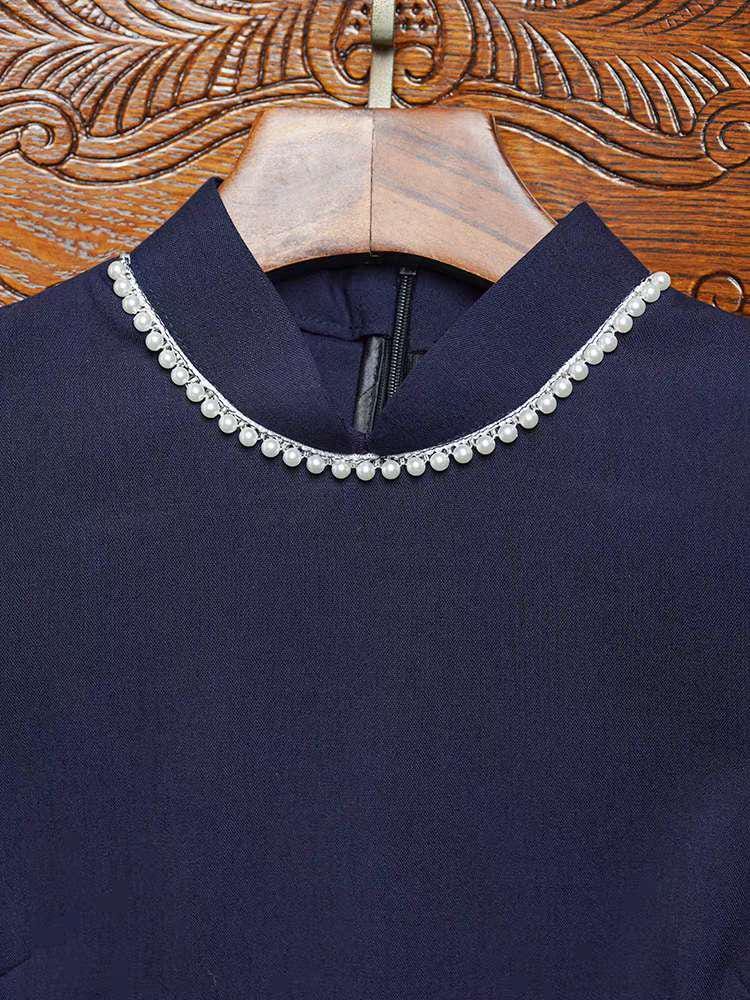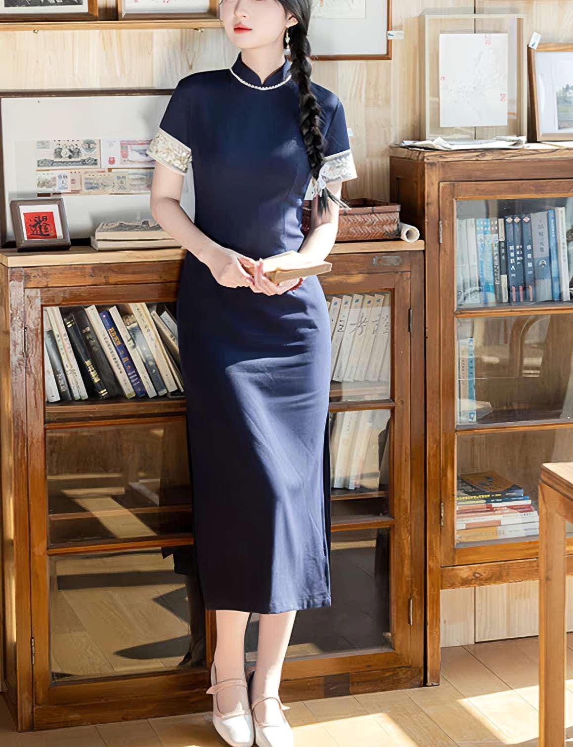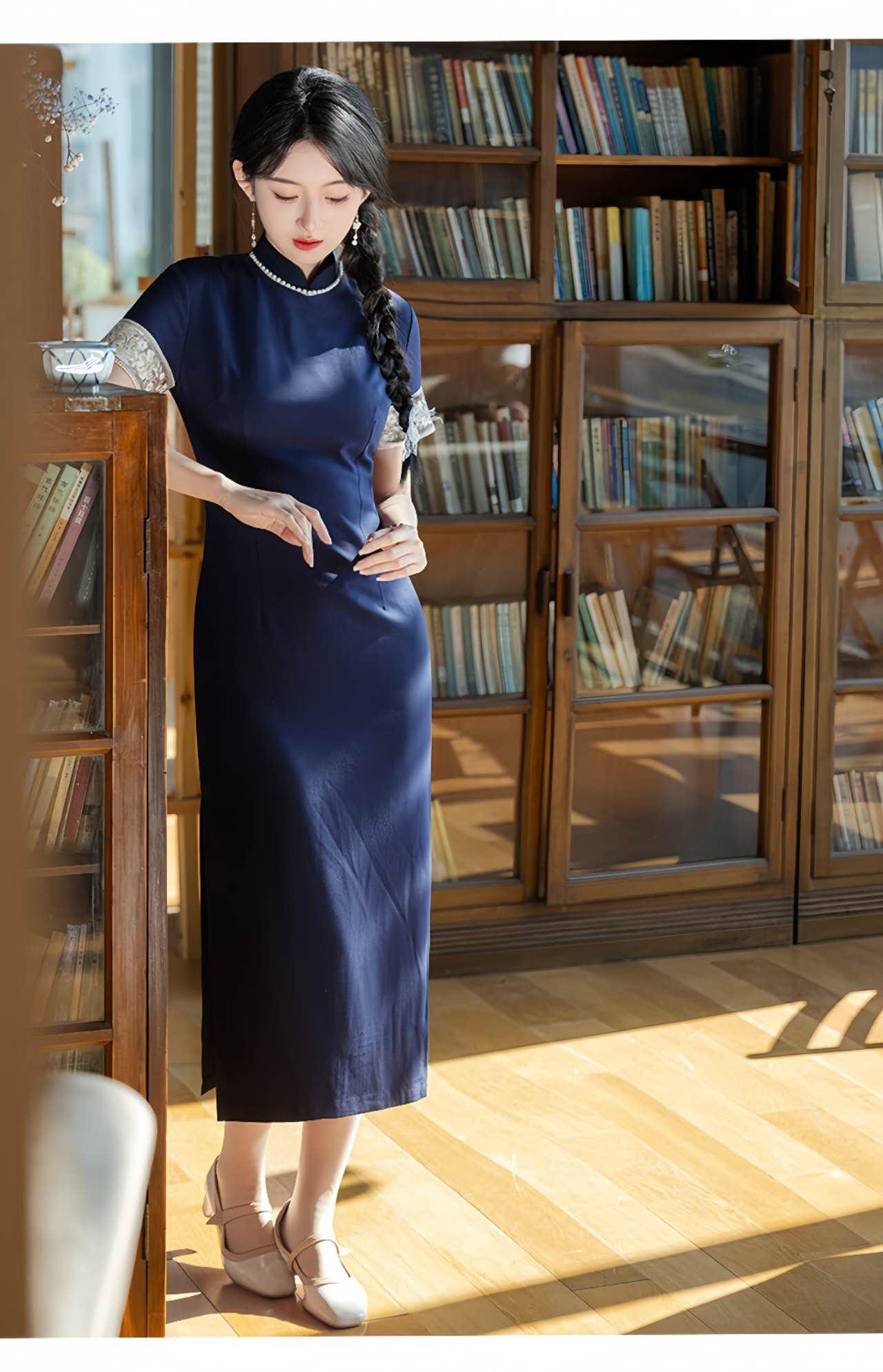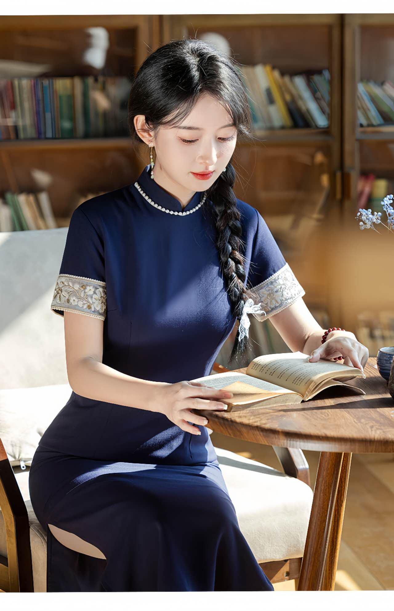 Crafted from a Tencel and linen blend, this deep navy qipao combines modern minimalism with the refined silhouette of traditional Chinese design. The contrasting cuffs feature delicate floral embroidery for a subtle and elegant decorative touch.