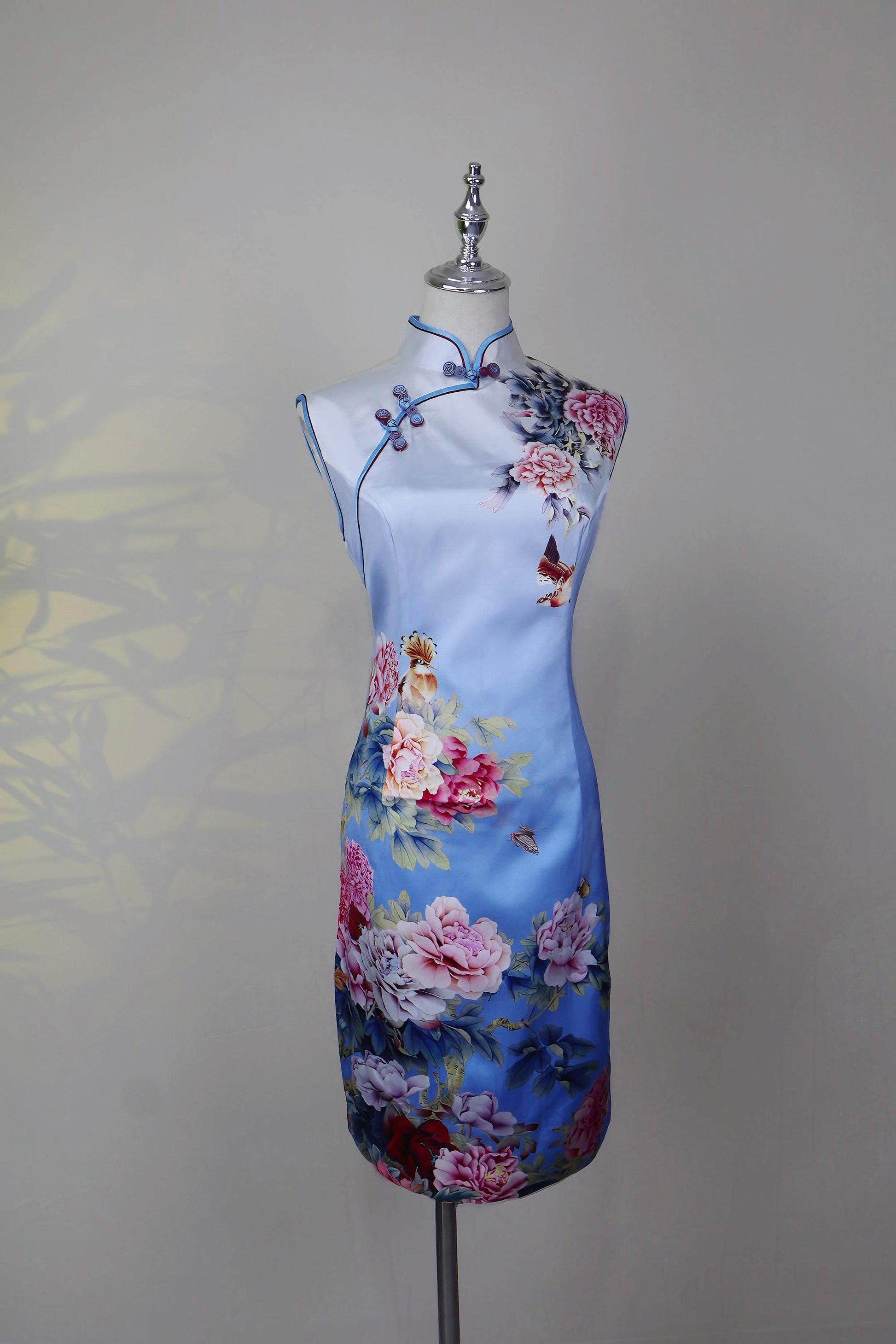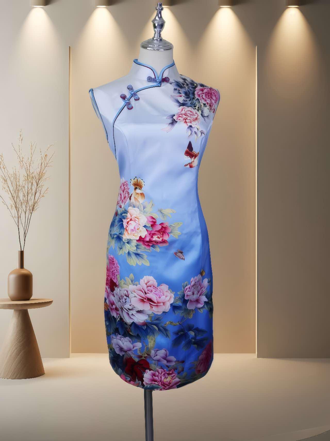 Immerse yourself in the magic of this luxurious silk cheongsam dress, crafted from 100% real silk and decorated with a mesmerizing flower and bird pattern that symbolizes harmony, freedom, and the eternal dance of nature. Each vibrant peony and delicate bird tells a story of balance and beauty, making this sleeveless robe a perfect choice for tea ceremonies, cultural celebrations, or as a deeply meaningful gift. The high Mandarin collar and intricate details showcase exceptional craftsmanship, offering a timeless silhouette. Handcrafted with passion, this dress is a wearable tribute to the grace of nature.