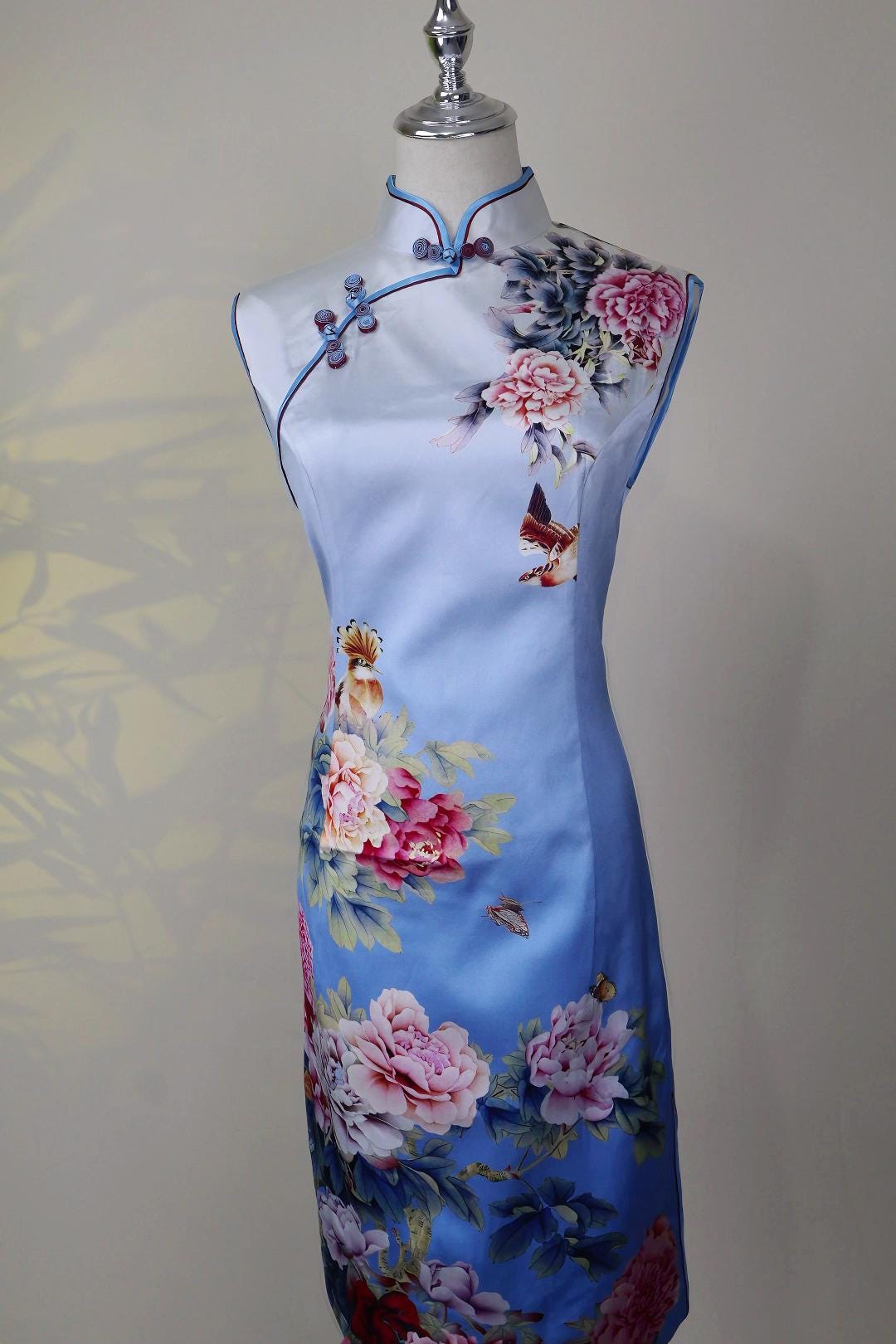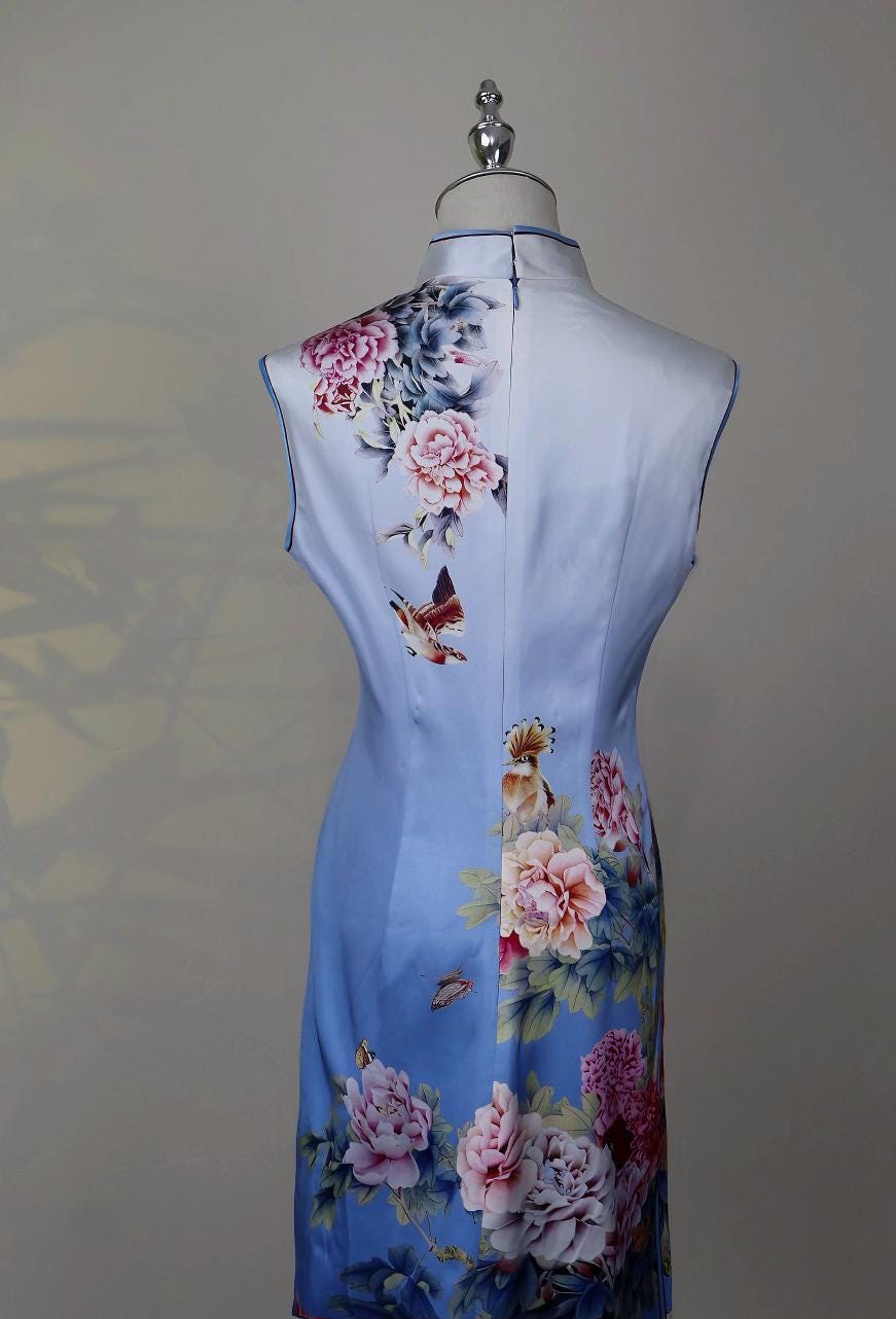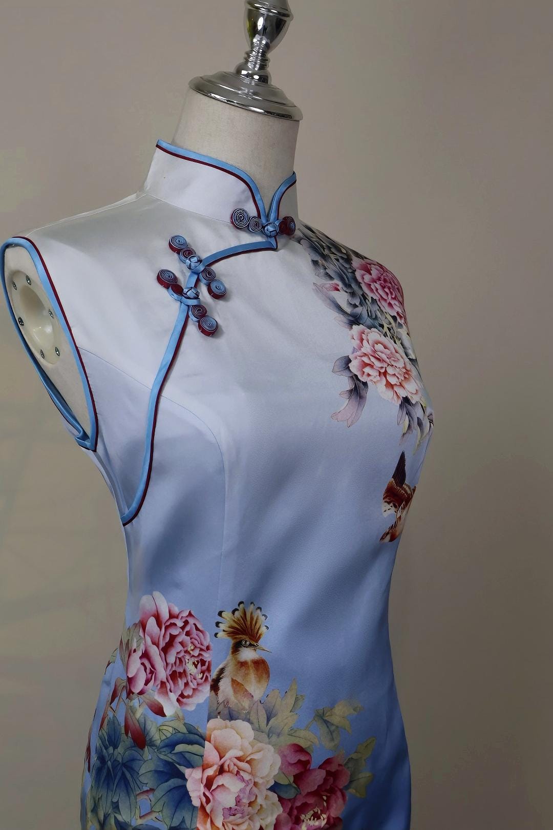 Exquisite Silk Cheongsam with Floral and Bird Art, Natural Harmony Dress, Serene Art Dress, Unique Symbol, Poetic Elegance Gift