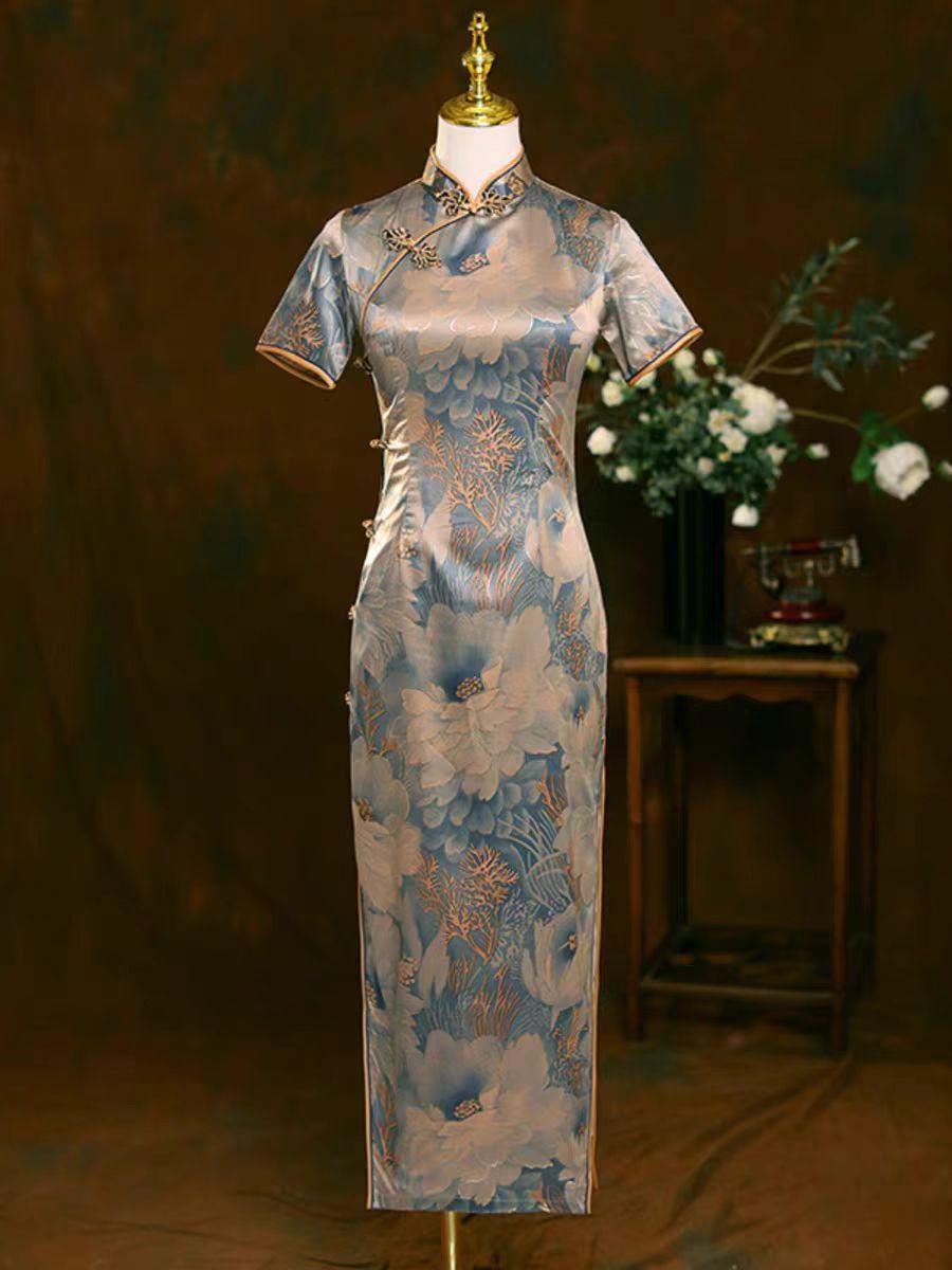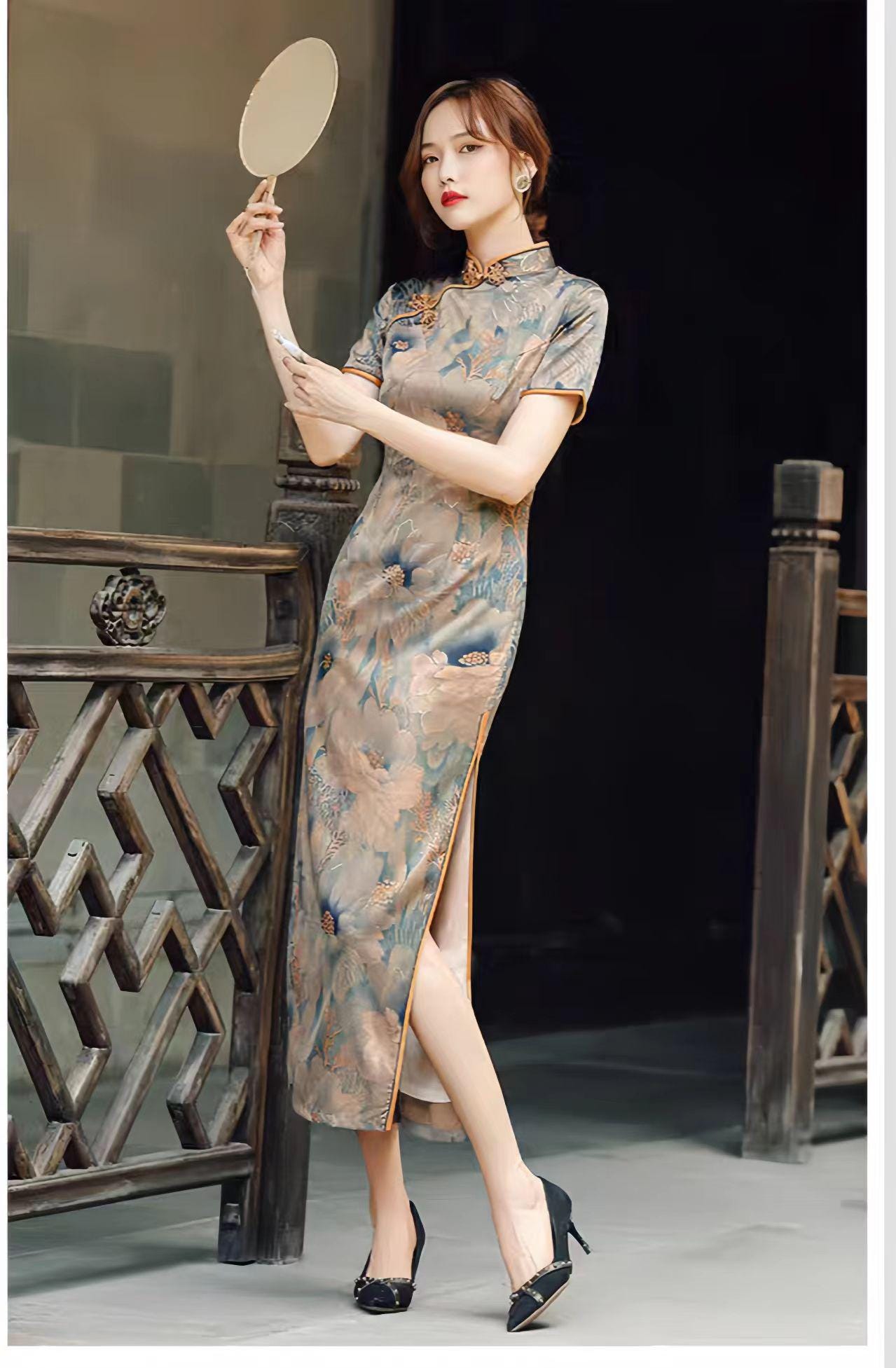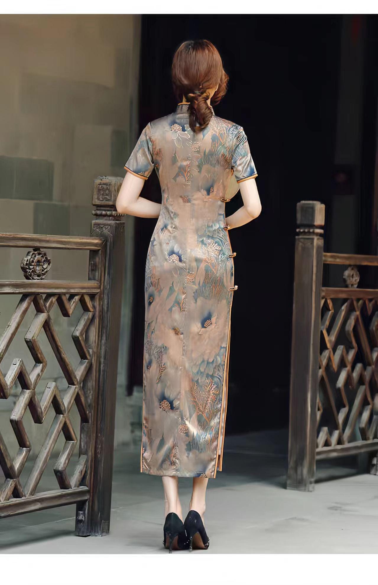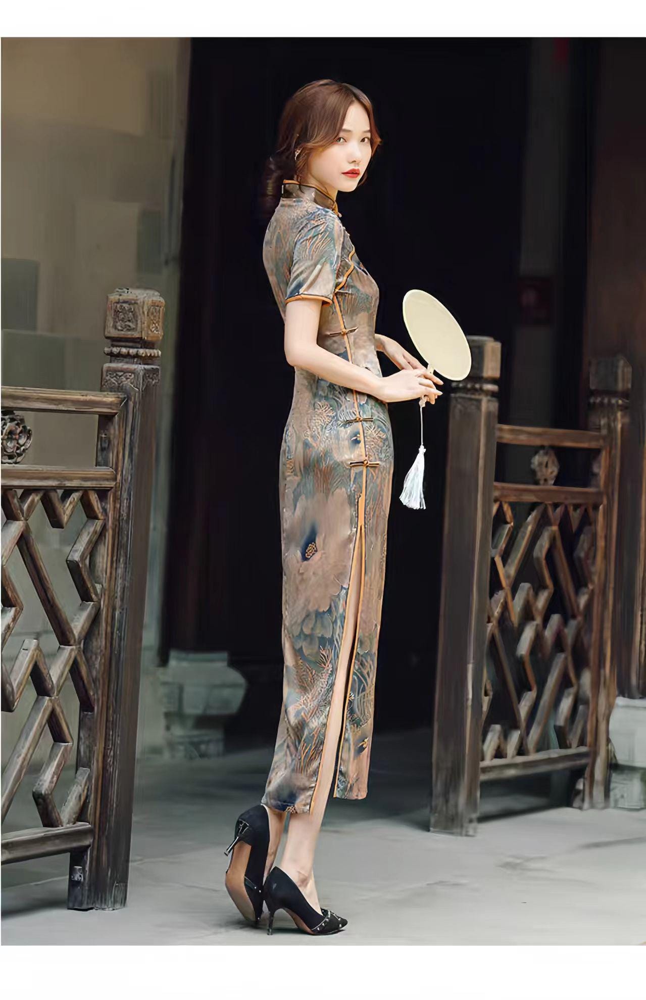 Immerse yourself in timeless elegance with our Vintage Silk Qipao, a delicate fusion of tradition and sophistication. Inspired by the glamorous era of 1930s Shanghai, this Chinese dress features delicate floral prints and peacock feather details that enhance its oriental charm.