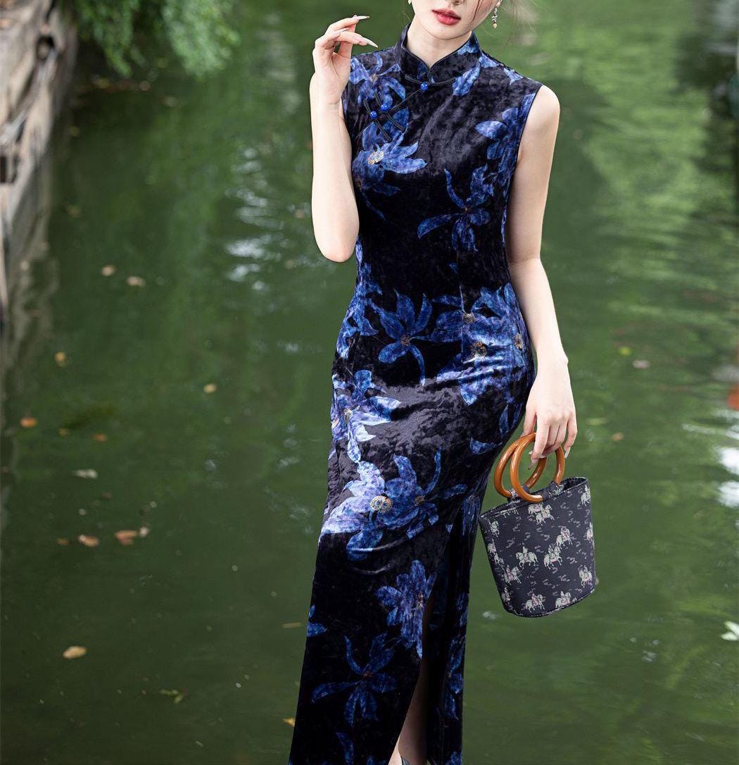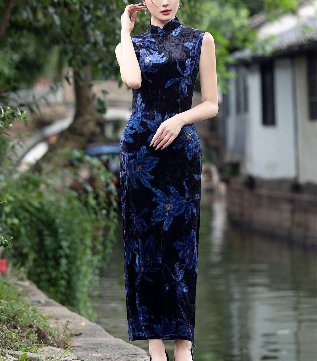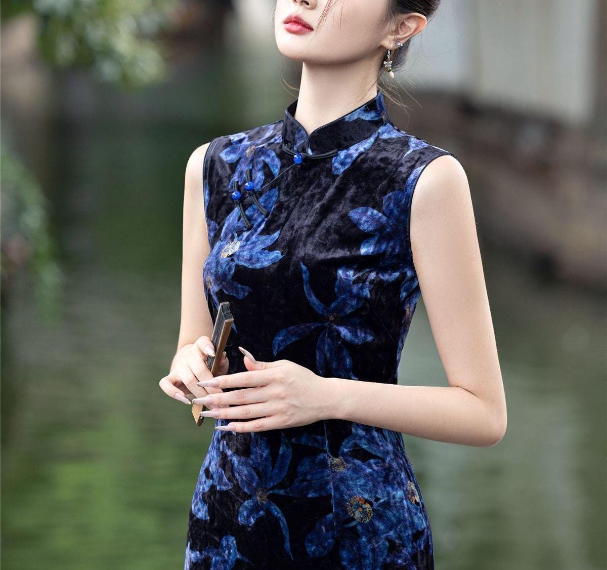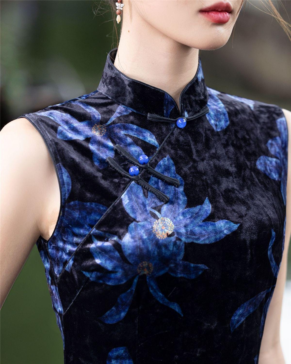 Discover the perfect combination of tradition and elegance with this luxurious velvet qipao dress. Its high mandarin collar and sleeveless silhouette highlight your natural grace with a refined touch of oriental fashion. The velvety texture with floral print lends a sophisticated look, ideal for tea ceremonies, weddings, cultural events, and elegant evenings.