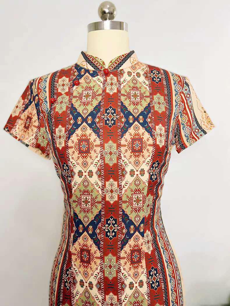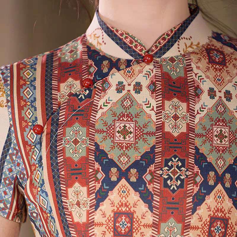 This retro cheongsam dress is crafted from breathable linen with an ethnic-style pattern that evokes traditional oriental beauty with a modern bohemian touch. The fitted cut and 120 cm length subtly flatter the figure, while the classic Mandarin collar enhances the design's grace.
