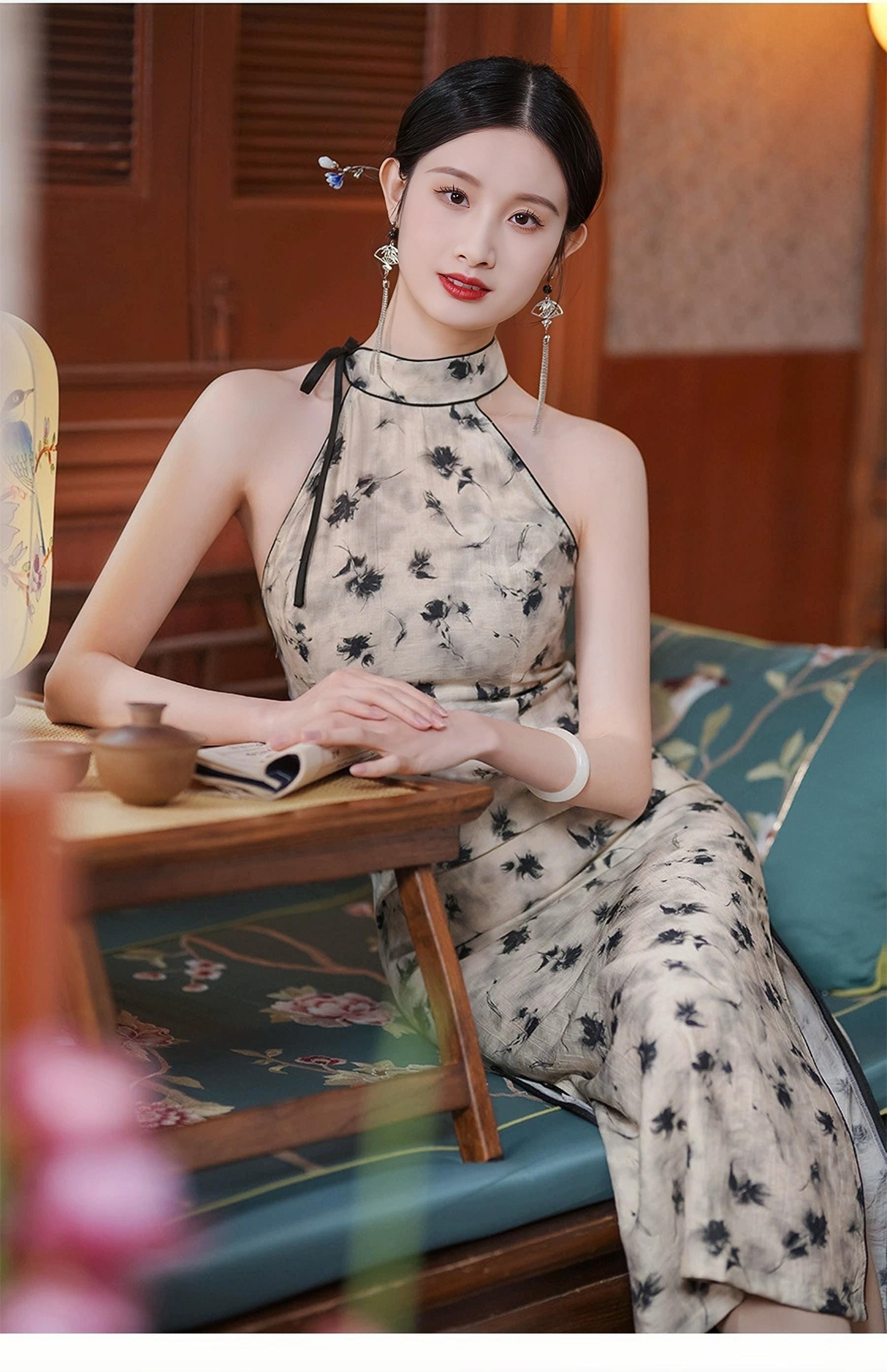 This spectacular halterneck qipao dress combines modern lines with traditional Chinese grace. Crafted from silk and linen, it offers a soft, natural feel, ideal for special occasions or summer gatherings.