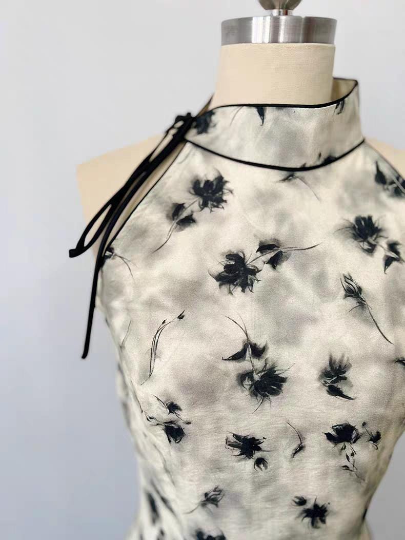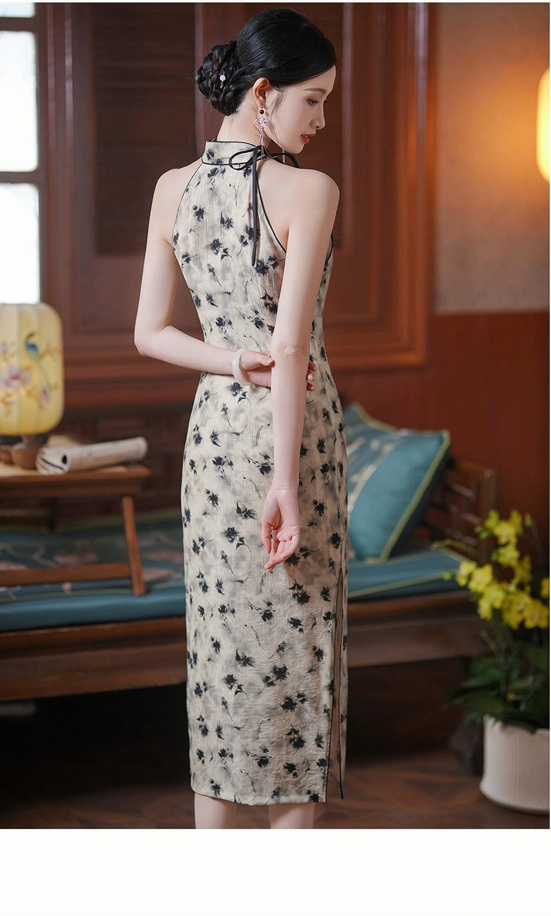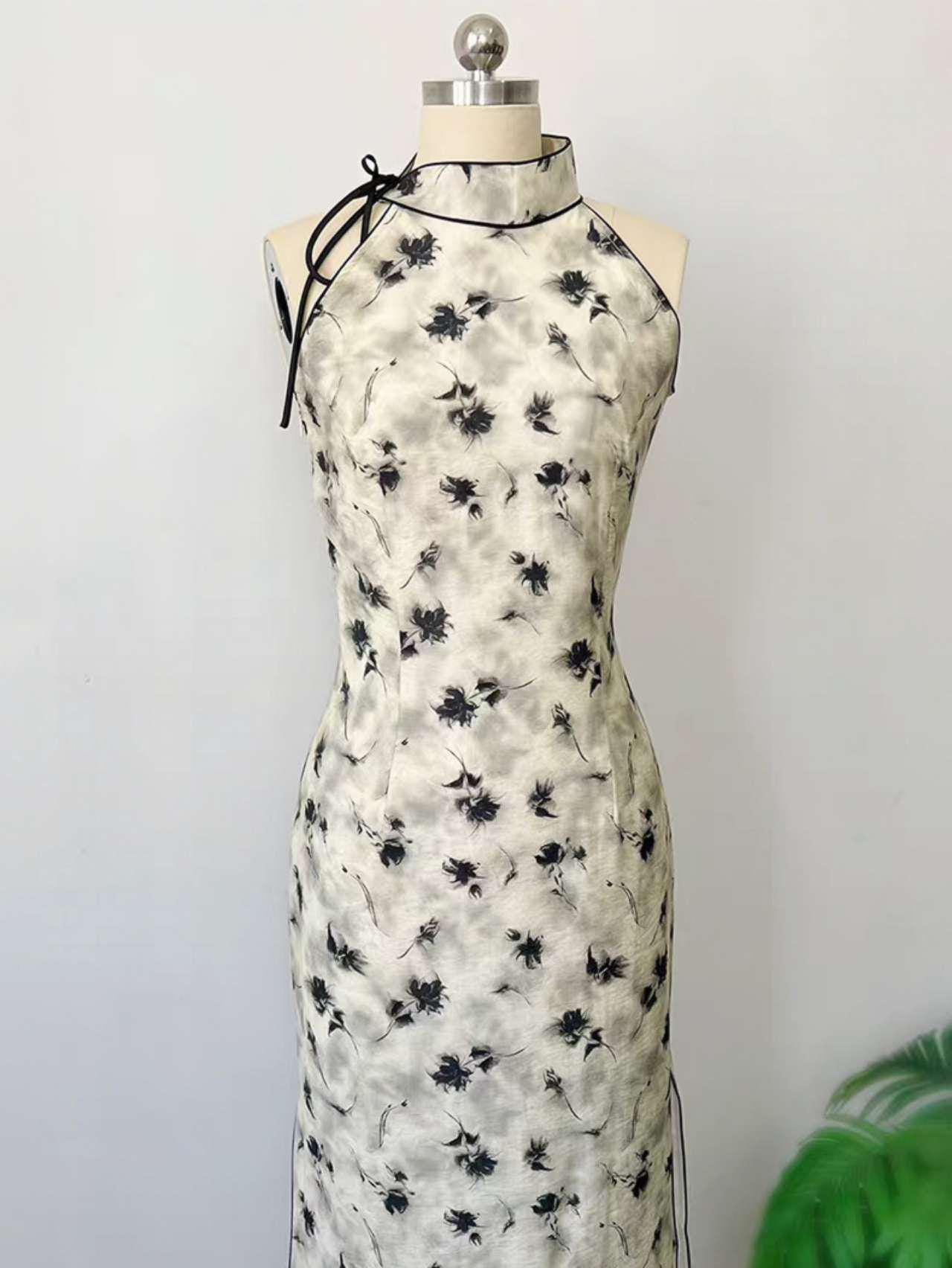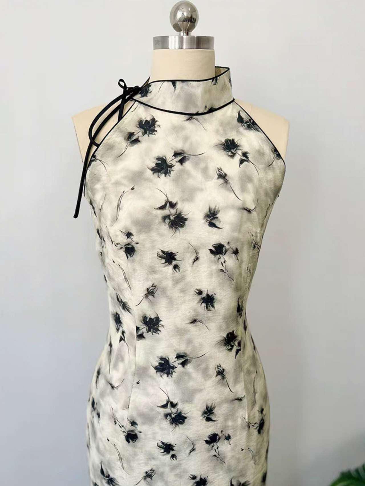 Halter Neck Qipao, Black Floral Dress, Modern Chinese Cheongsam, Retro Oriental Dress, Summer Qipao, Tea Party Dress, Gift