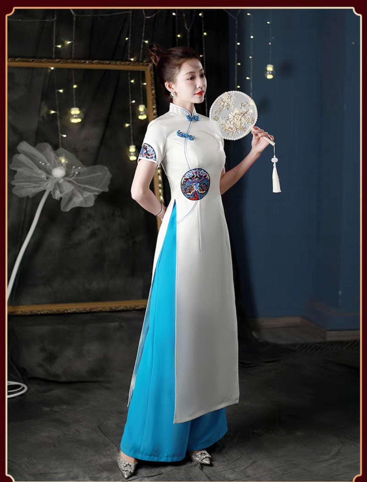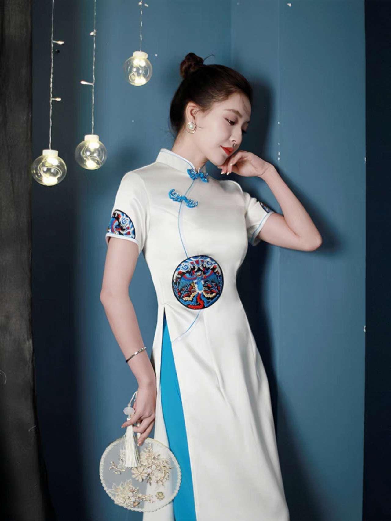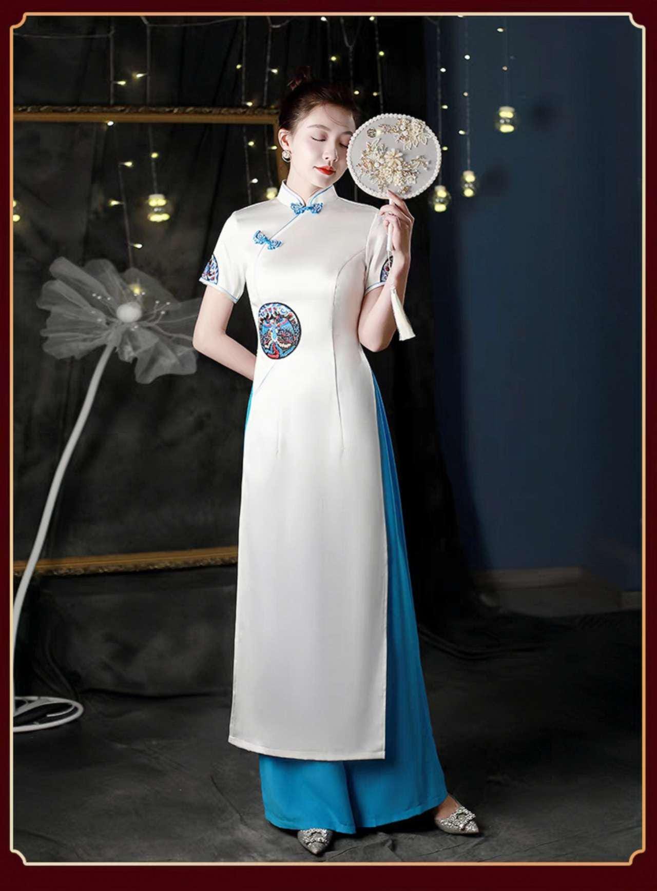 Elegant White Cheongsam, Chinese Qipao Set, Blue Panel Dress, Oriental Evening Dress, Long Dress, Cultural Ceremony Dress