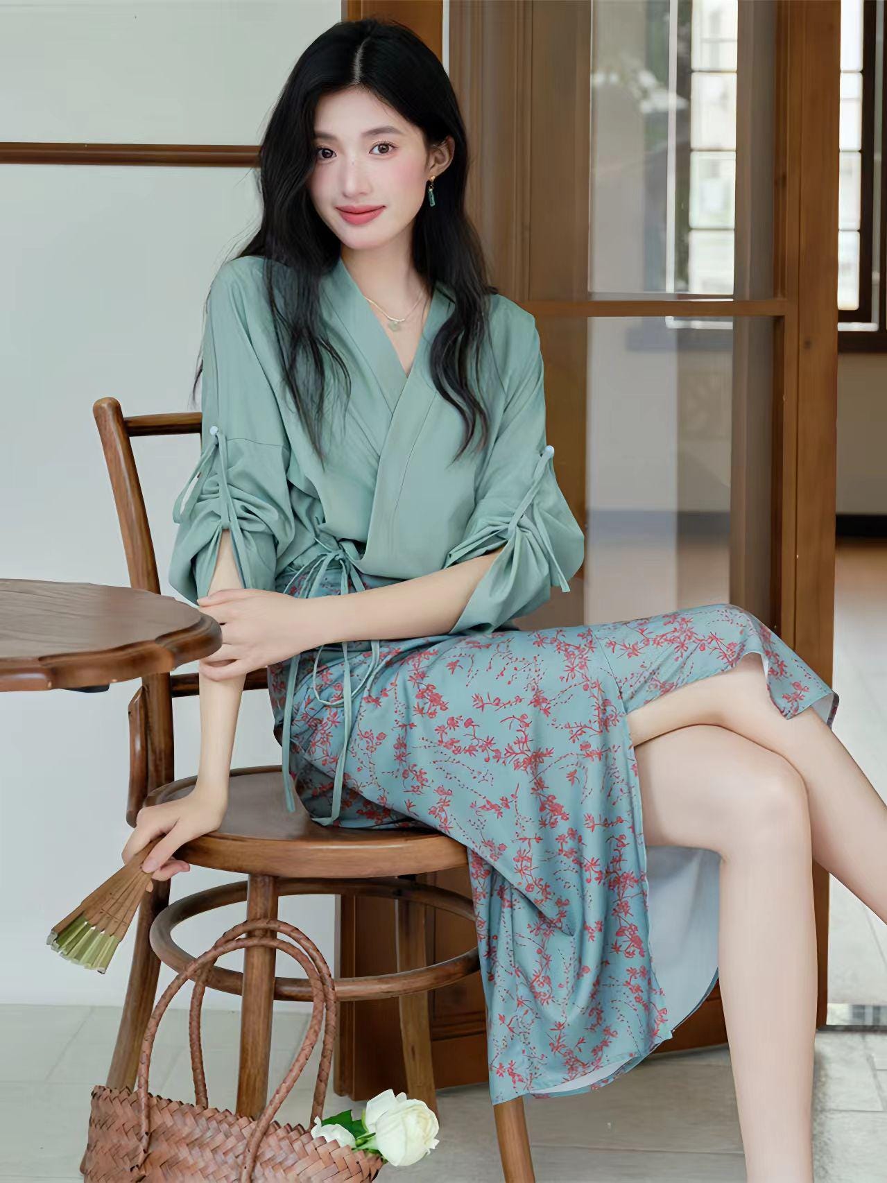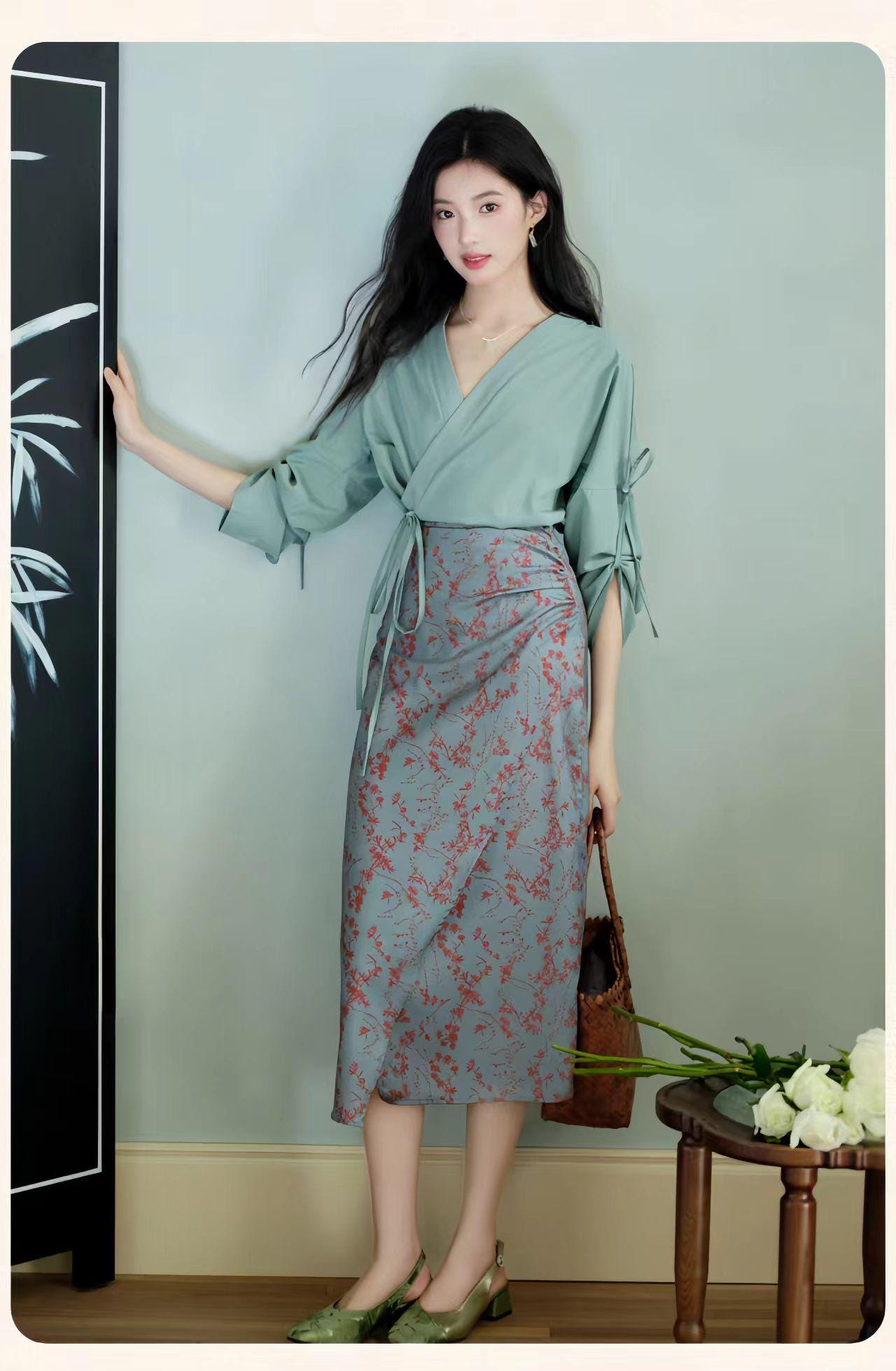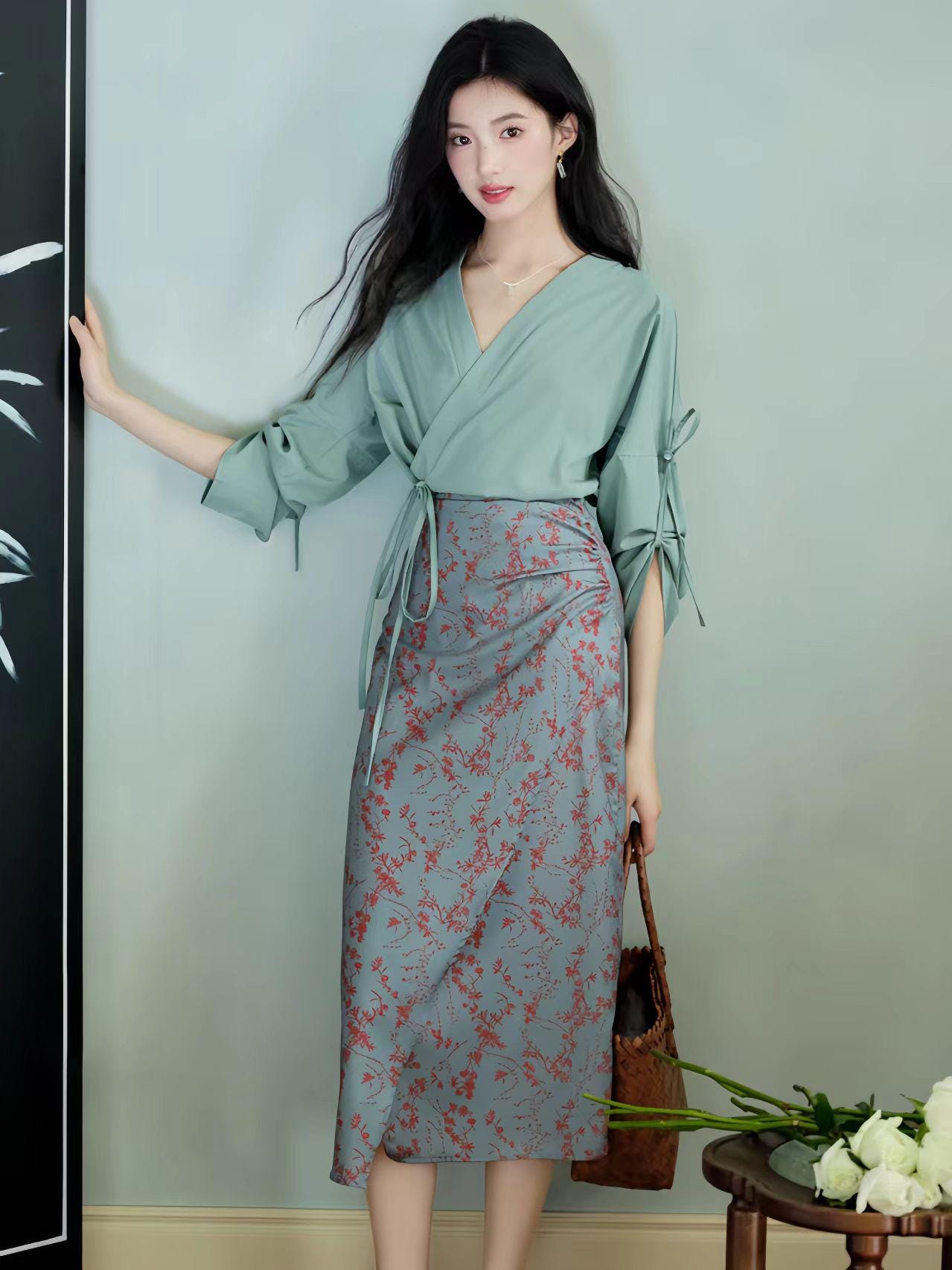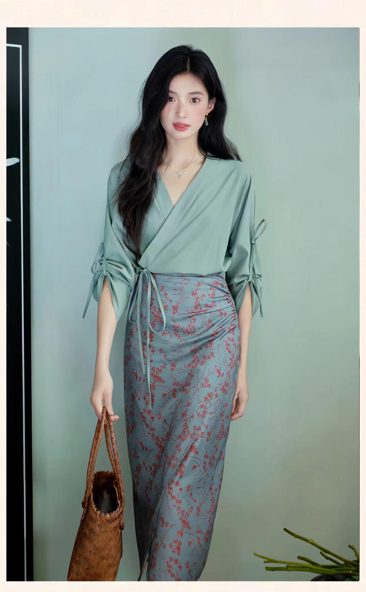 Bring timeless elegance to your wardrobe with this qipao-inspired two-piece set, featuring a green wrap blouse with an adjustable tie and a delicate floral print midi skirt. The design combines oriental charm with modern minimalism, perfect for both casual and semi-formal occasions.