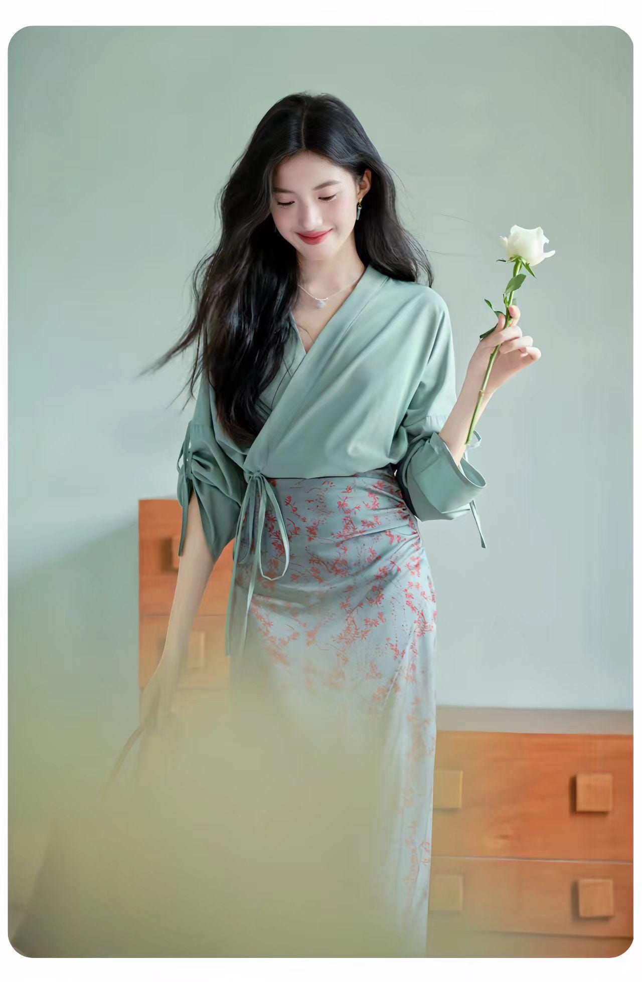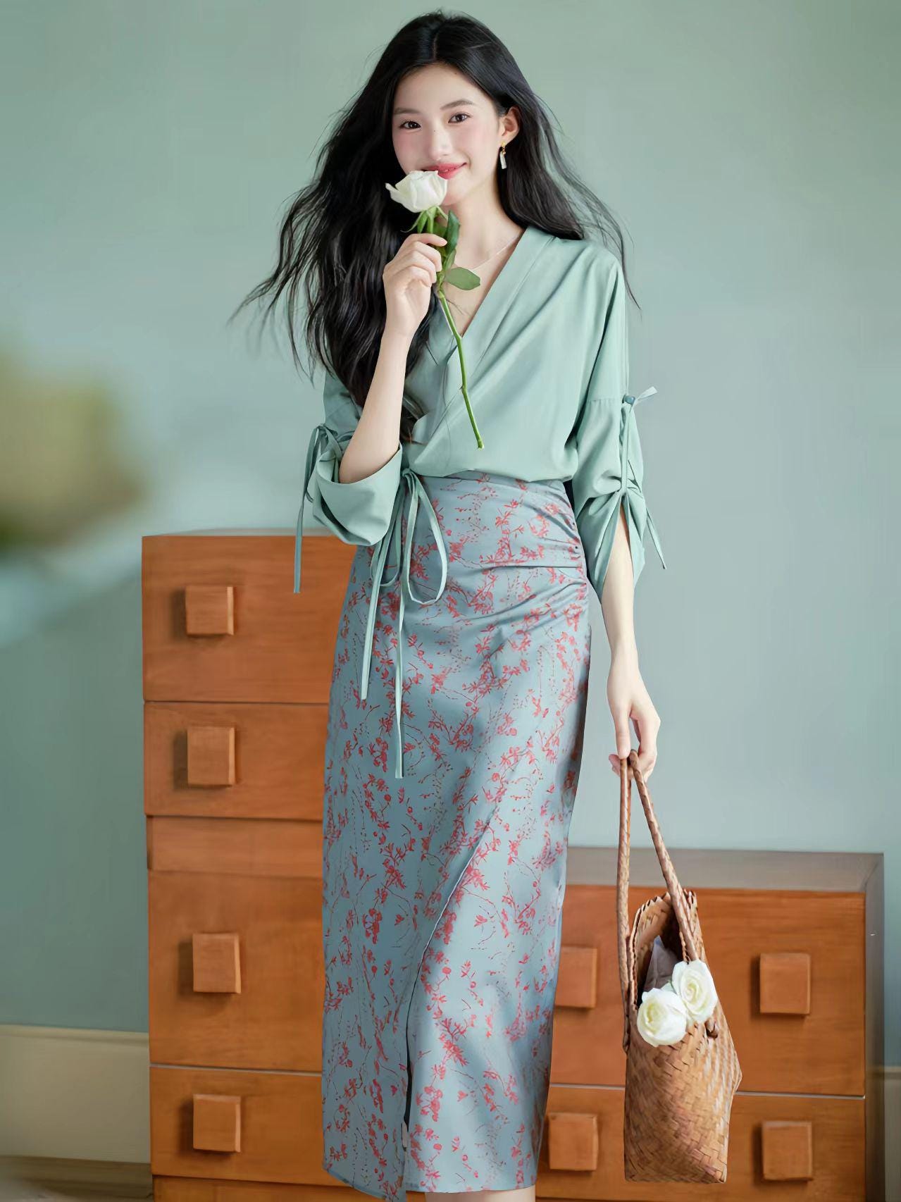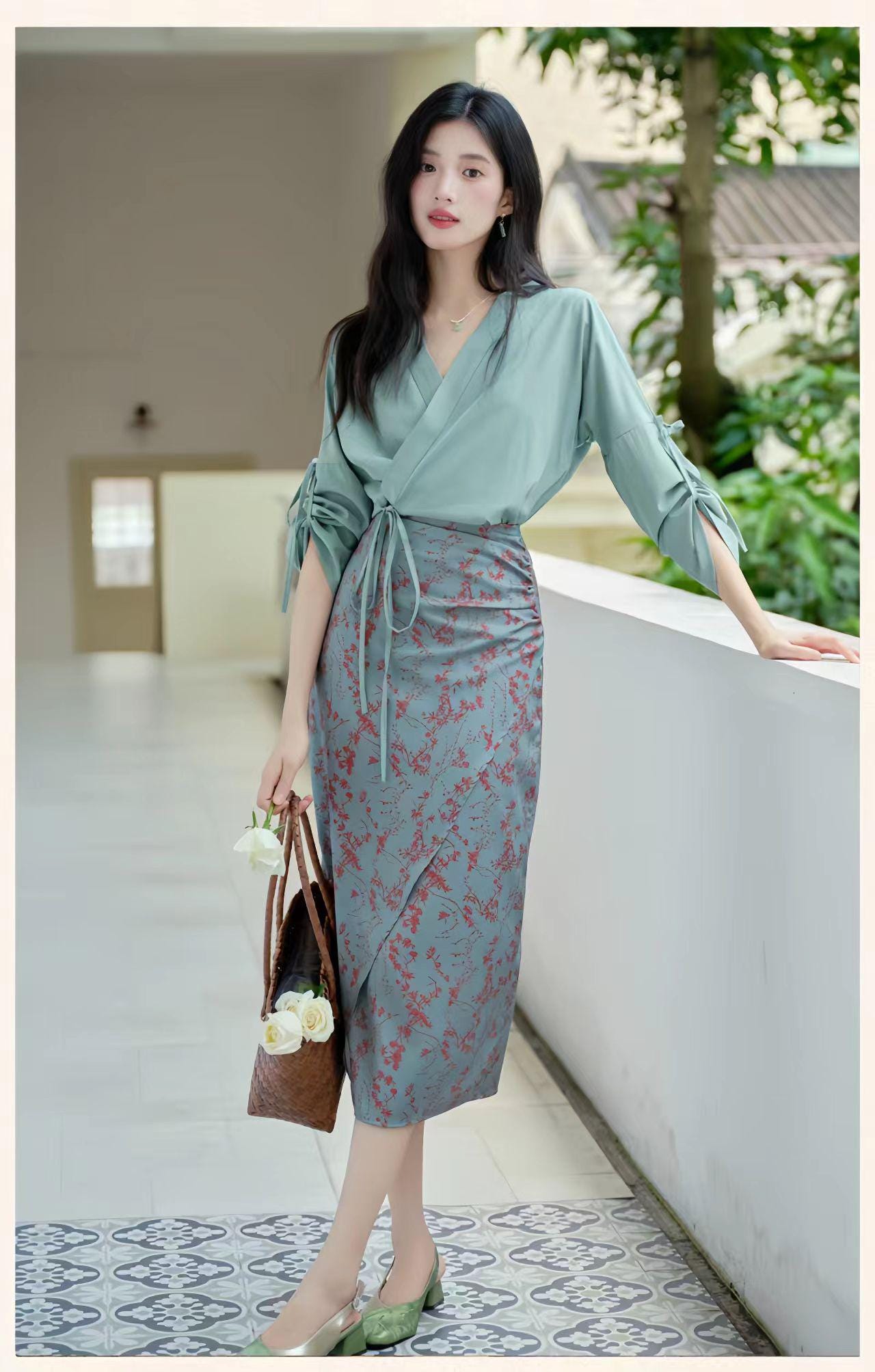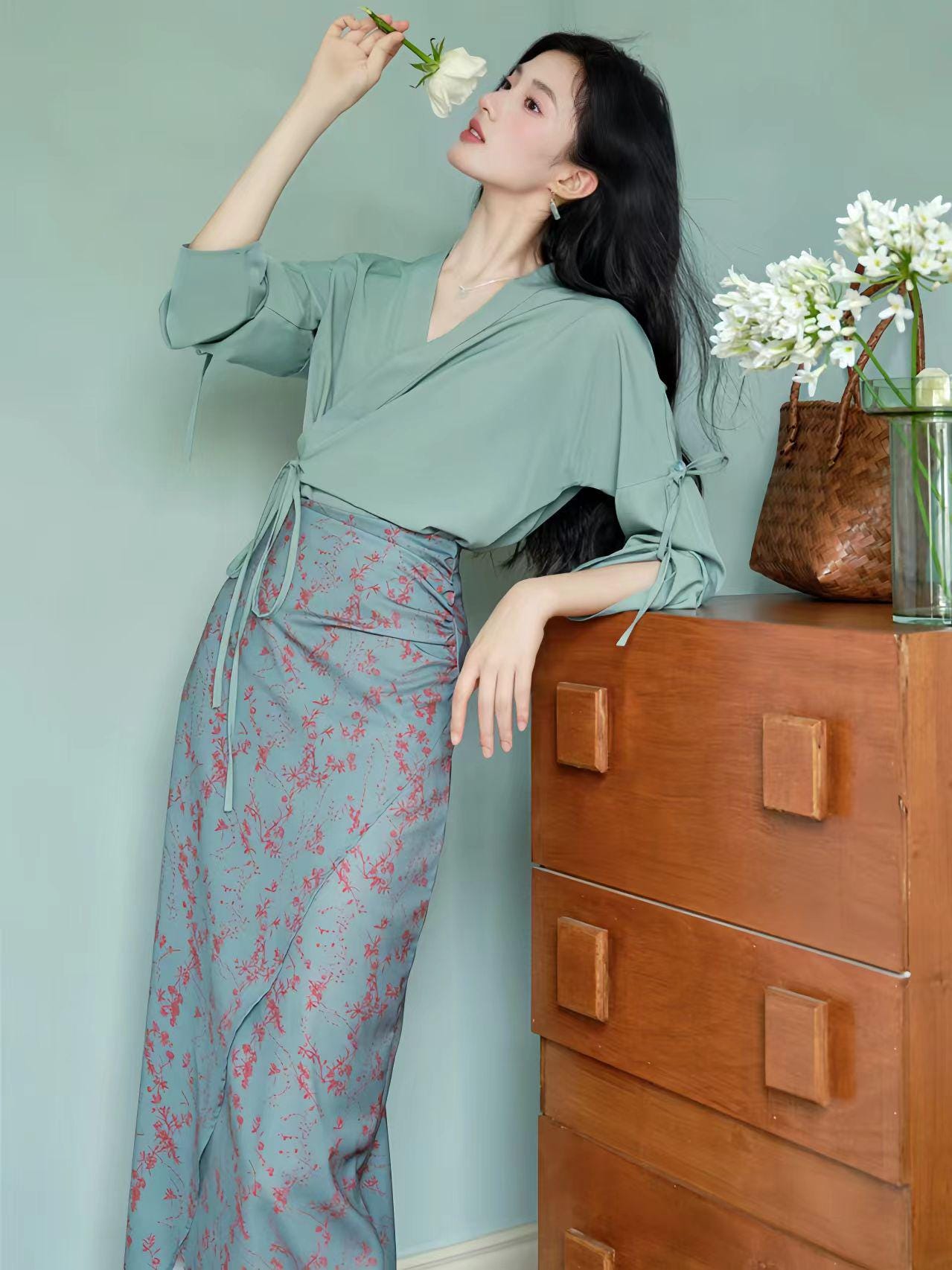 Bring timeless elegance to your wardrobe with this qipao-inspired two-piece set, featuring a green wrap blouse with an adjustable tie and a delicate floral print midi skirt. The design combines oriental charm with modern minimalism, perfect for both casual and semi-formal occasions.