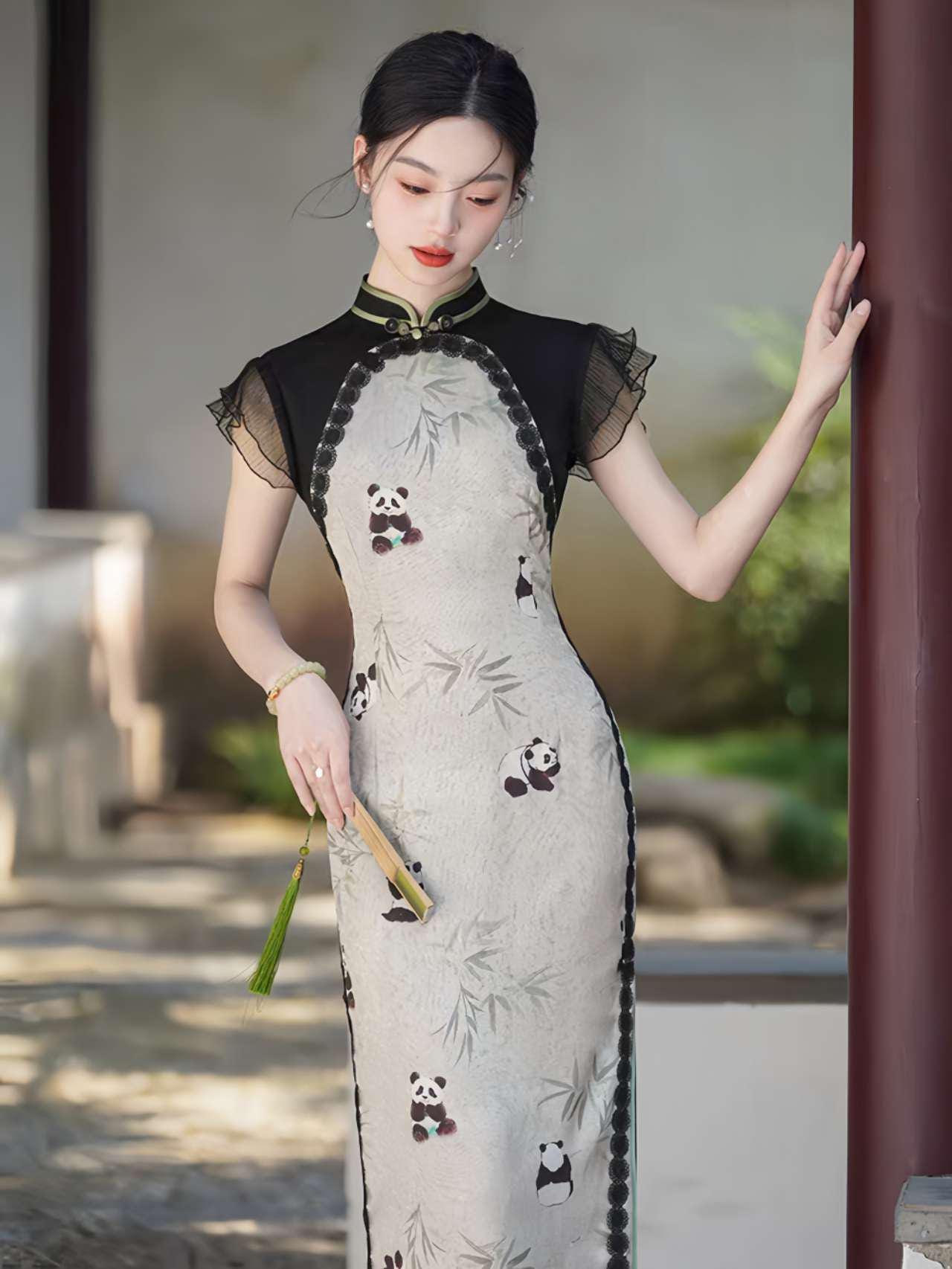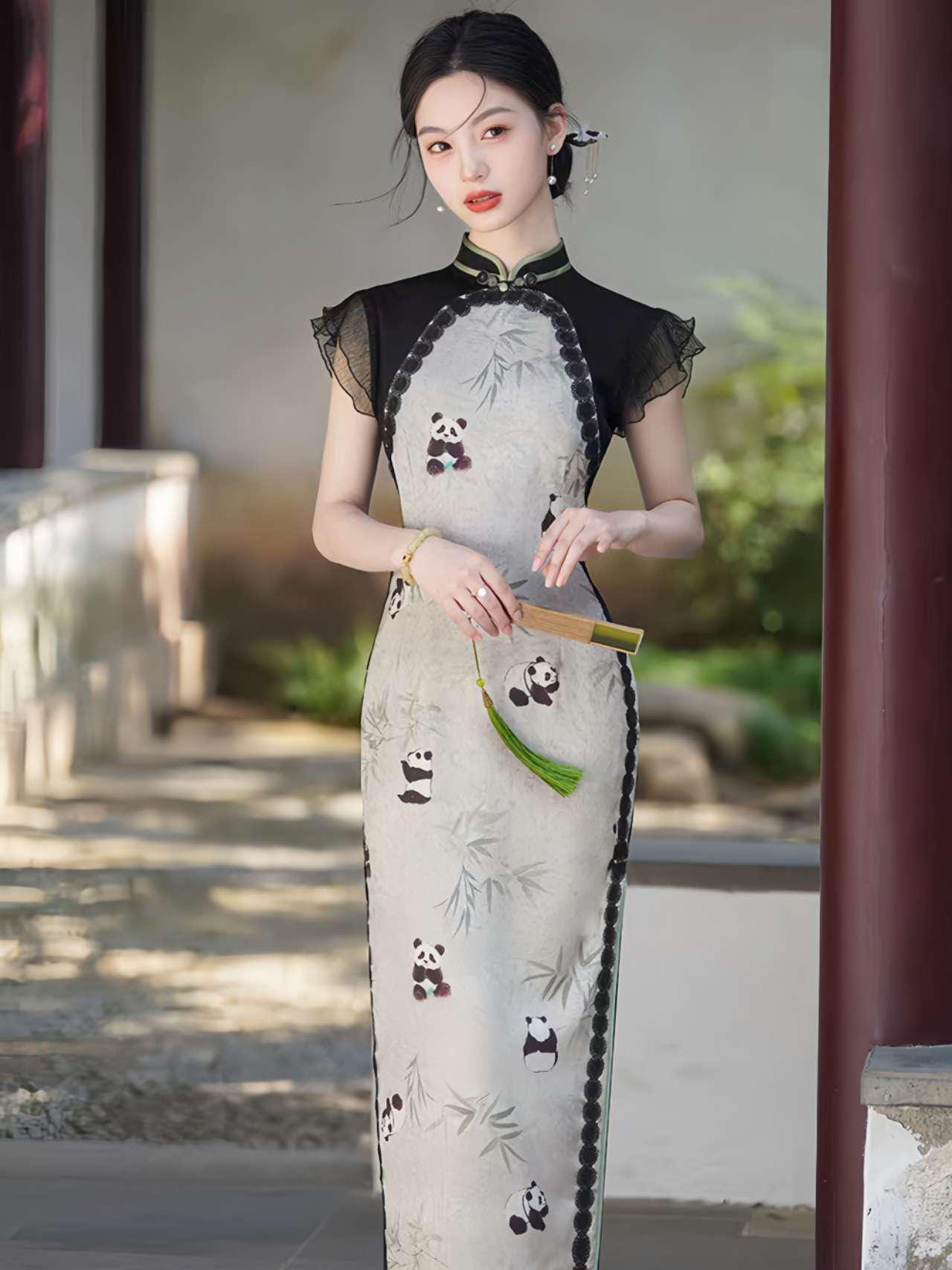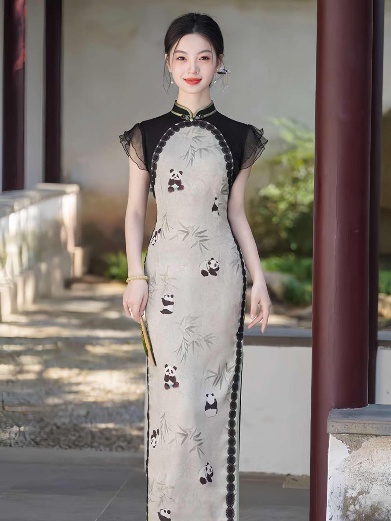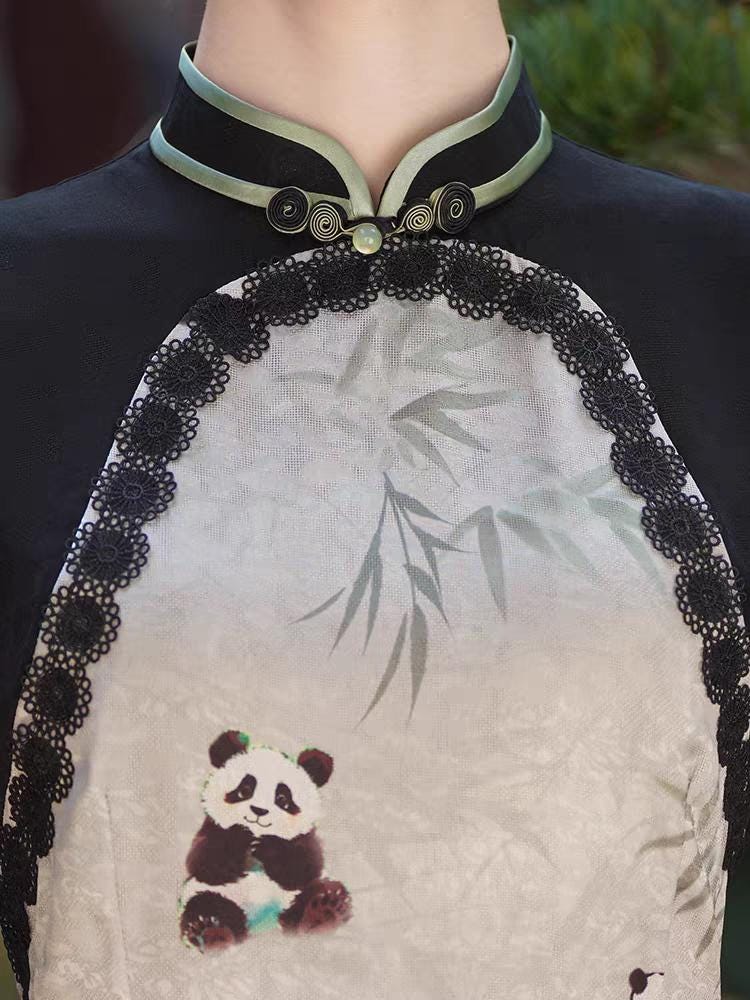 This panda-print qipao combines tenderness with classic elegance. Crafted from lightweight silk, its design features a 120-cm skirt, butterfly-style tulle sleeves, and a mandarin collar with traditional buttons, adding a unique charm.