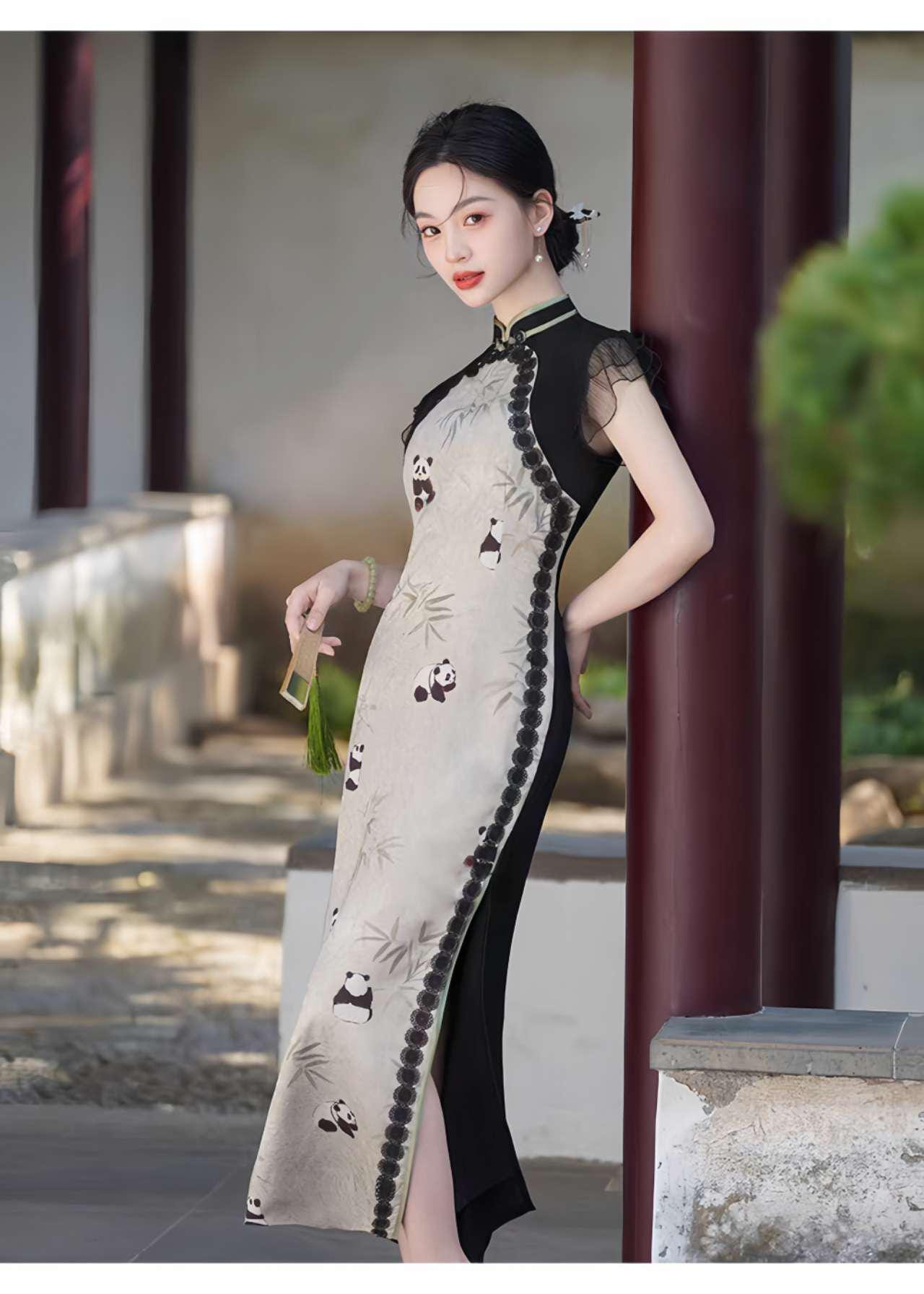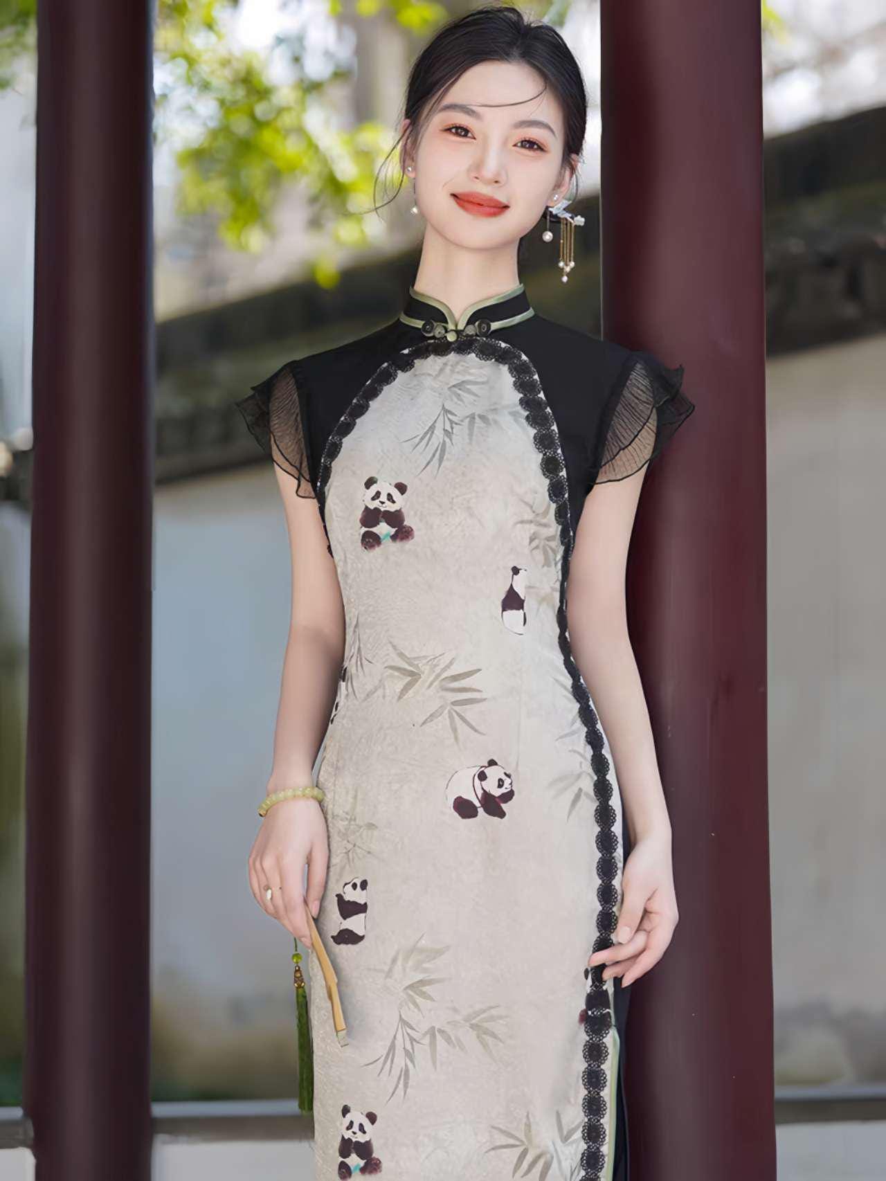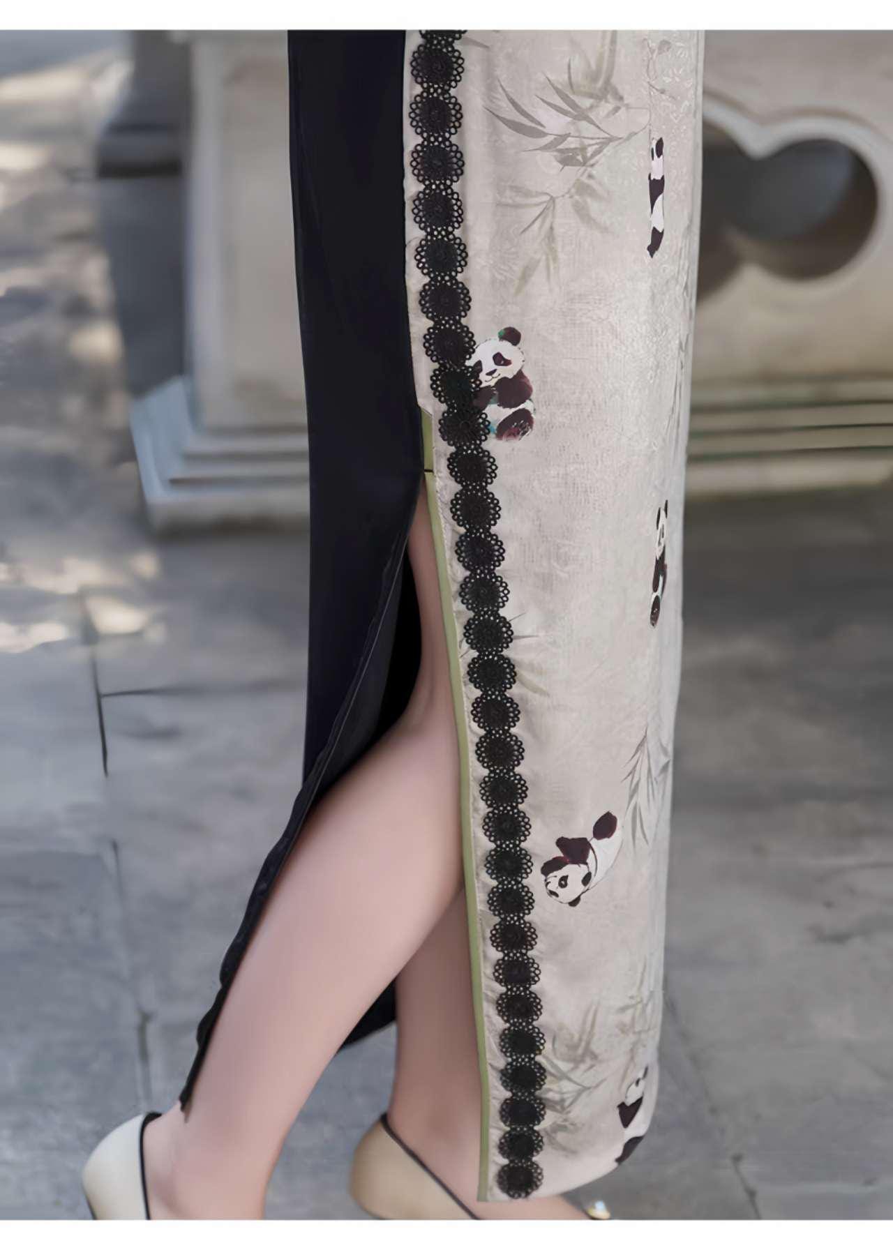 This panda-print qipao combines tenderness with classic elegance. Crafted from lightweight silk, its design features a 120-cm skirt, butterfly-style tulle sleeves, and a mandarin collar with traditional buttons, adding a unique charm.