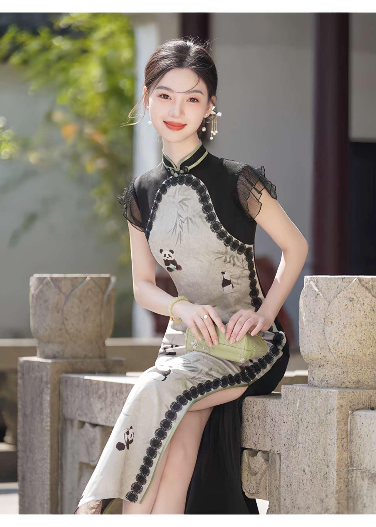 The panda and bamboo print pays homage to Chinese culture, while the side details flatter the figure. Ideal for tea parties, cultural celebrations, summer weddings, or occasions where you want to stand out with style and sweetness.