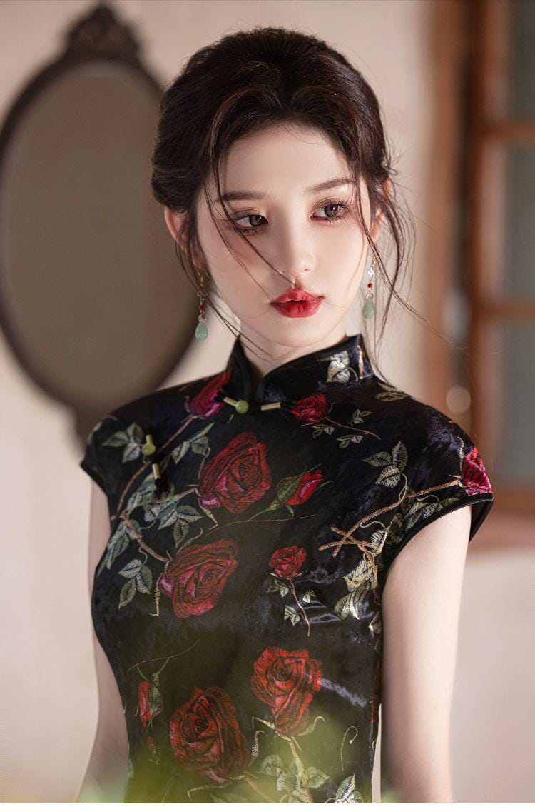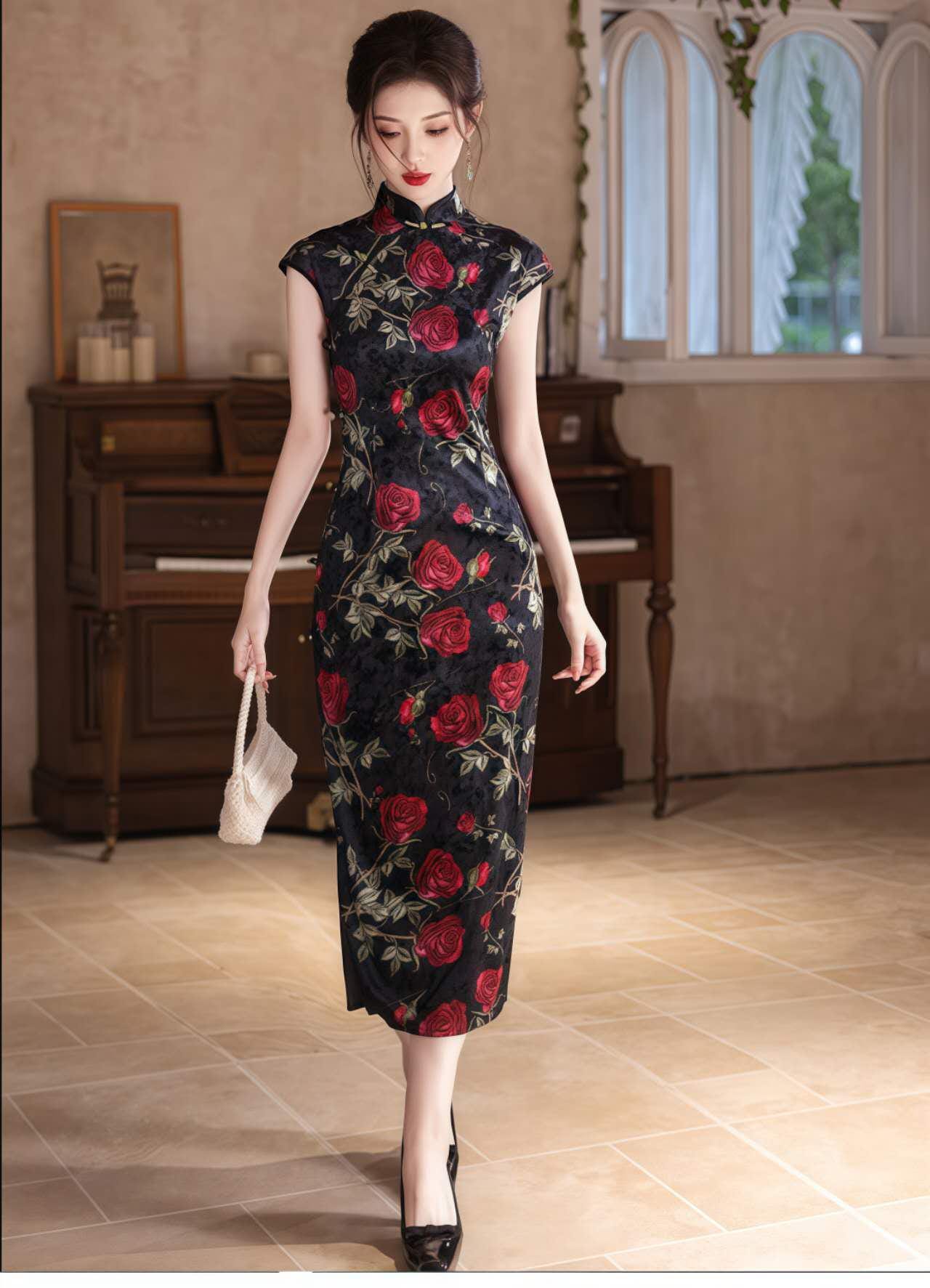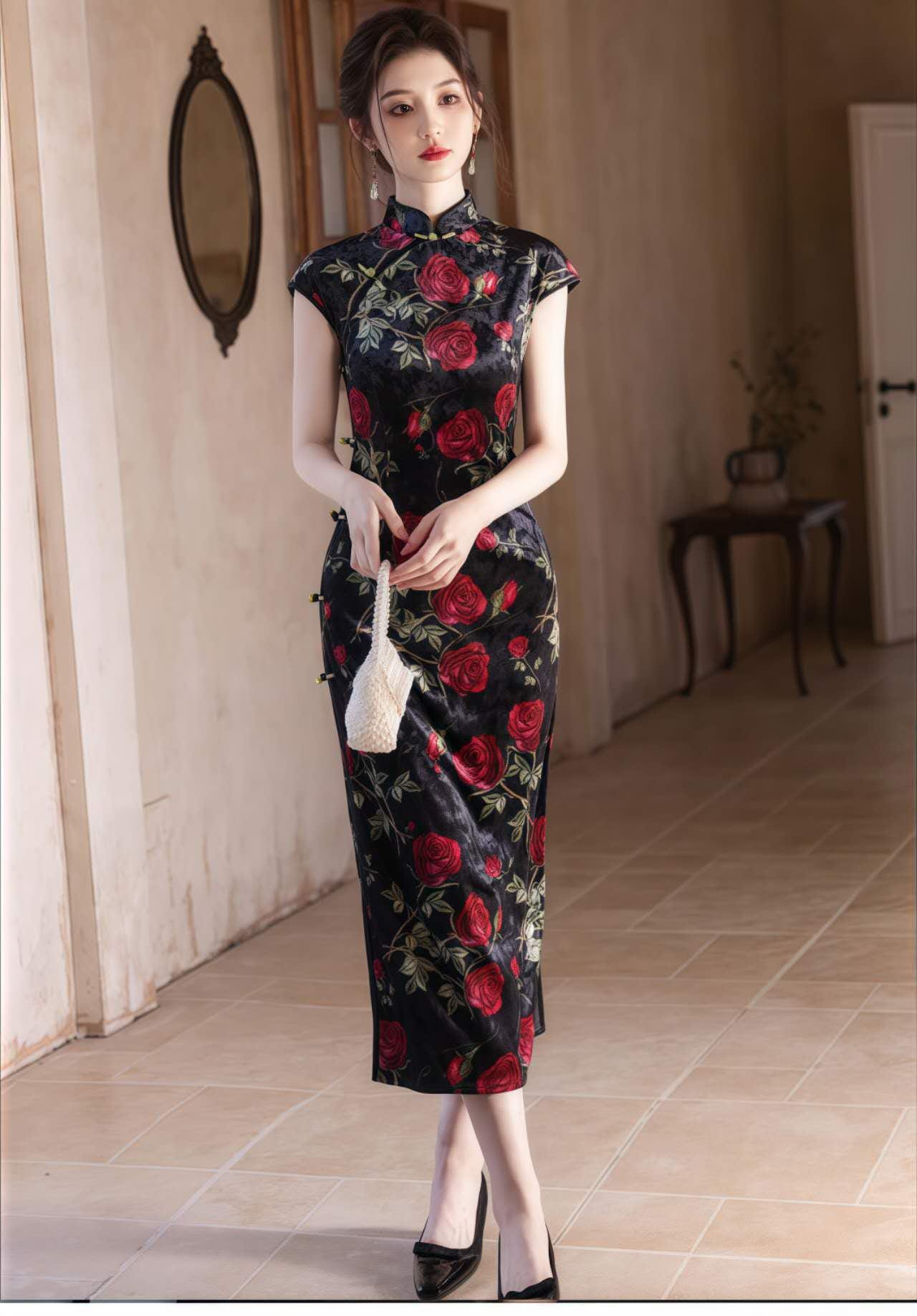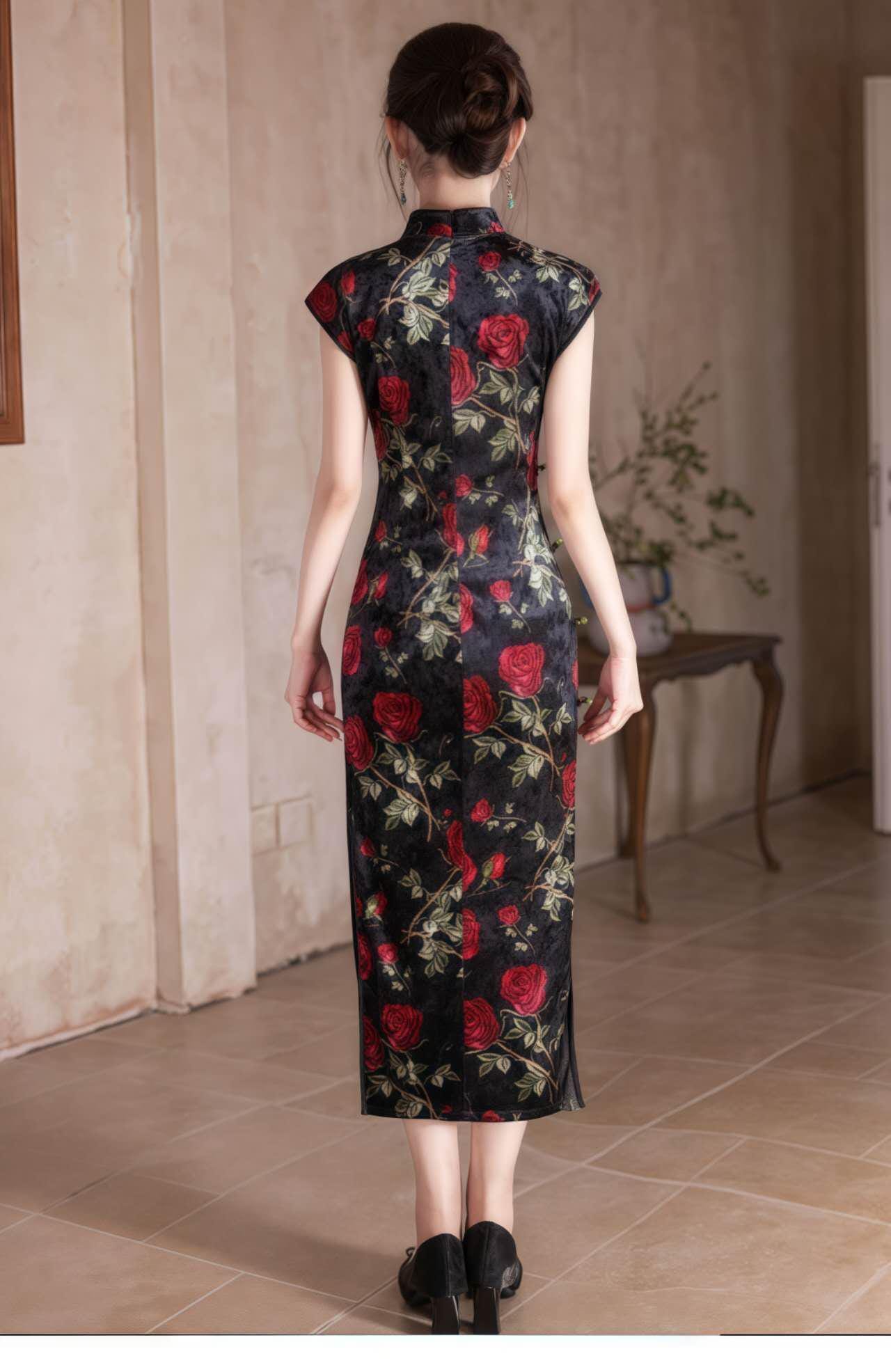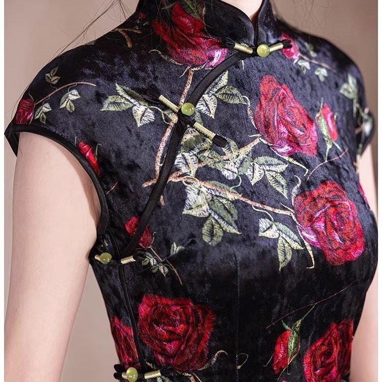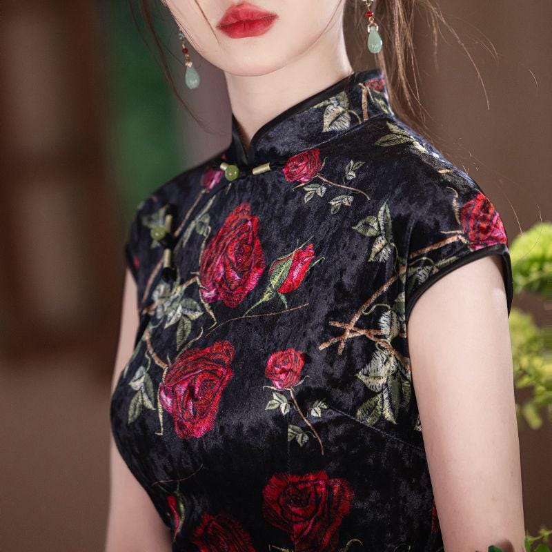 Discover the elegance of this black velvet qipao, beautifully embroidered with red roses. This classic cheongsam features a fitted design with a Mandarin collar and traditional Chinese buttons. Perfect for parties, weddings, and special occasions where you want to stand out. The high-quality velvet ensures comfort and sophisticated style.