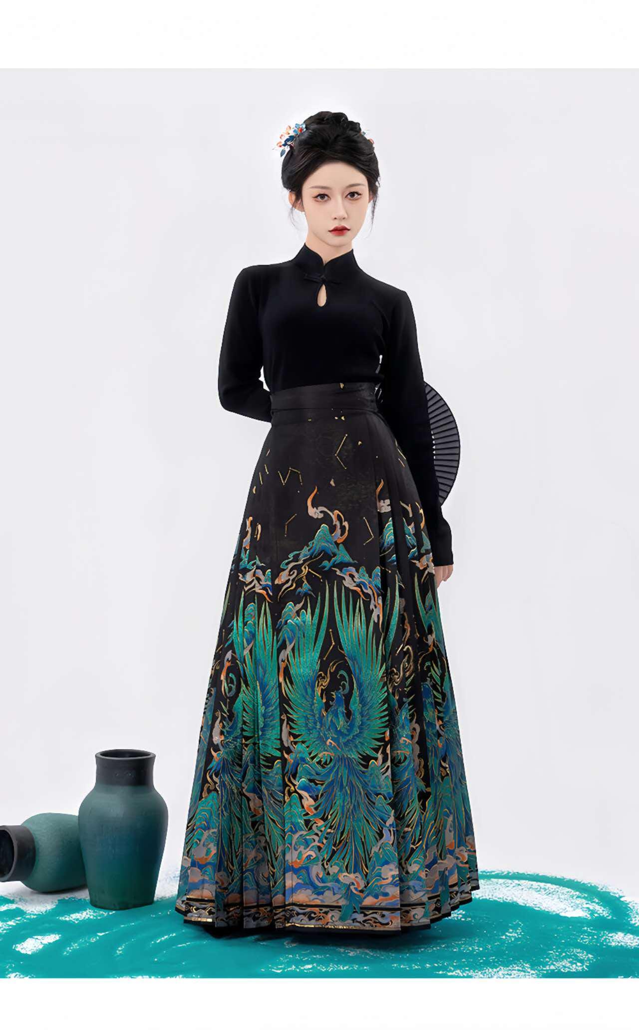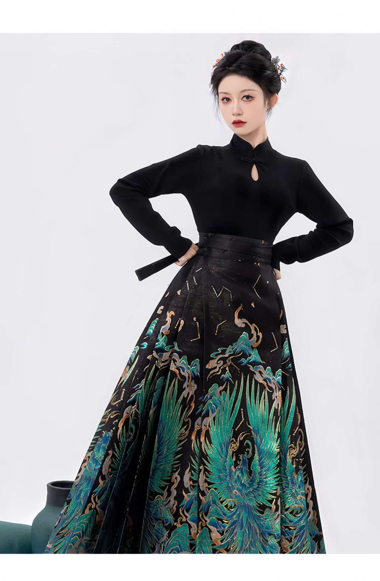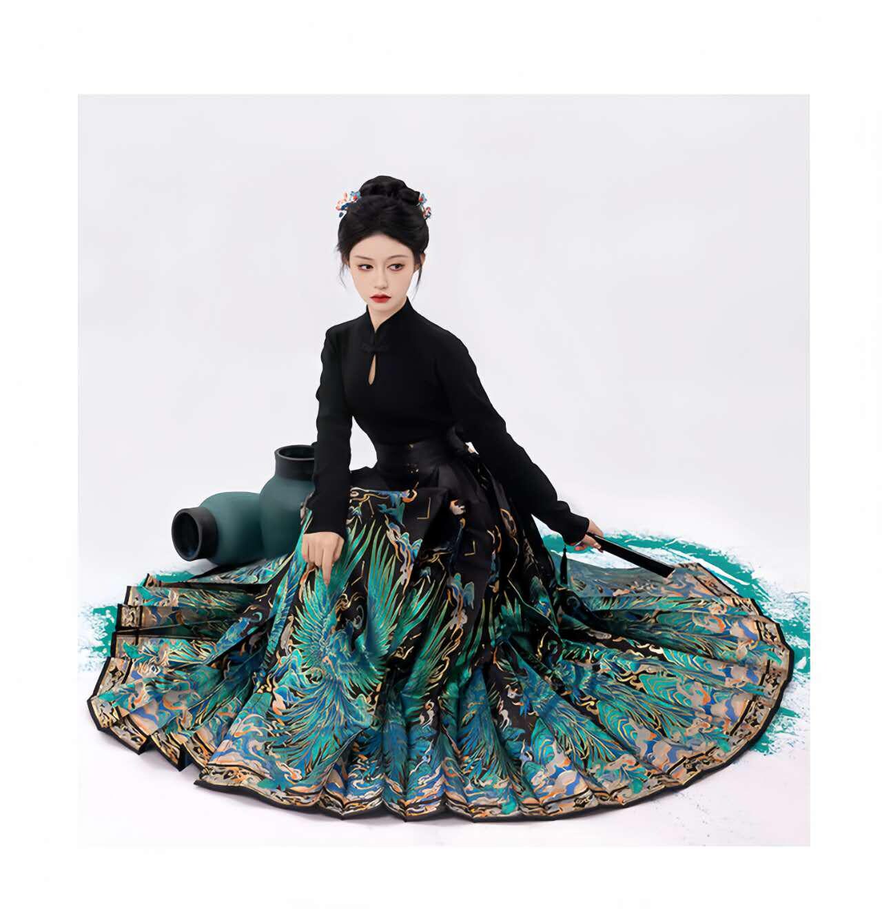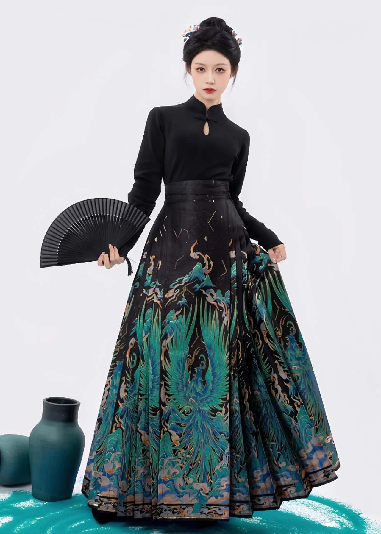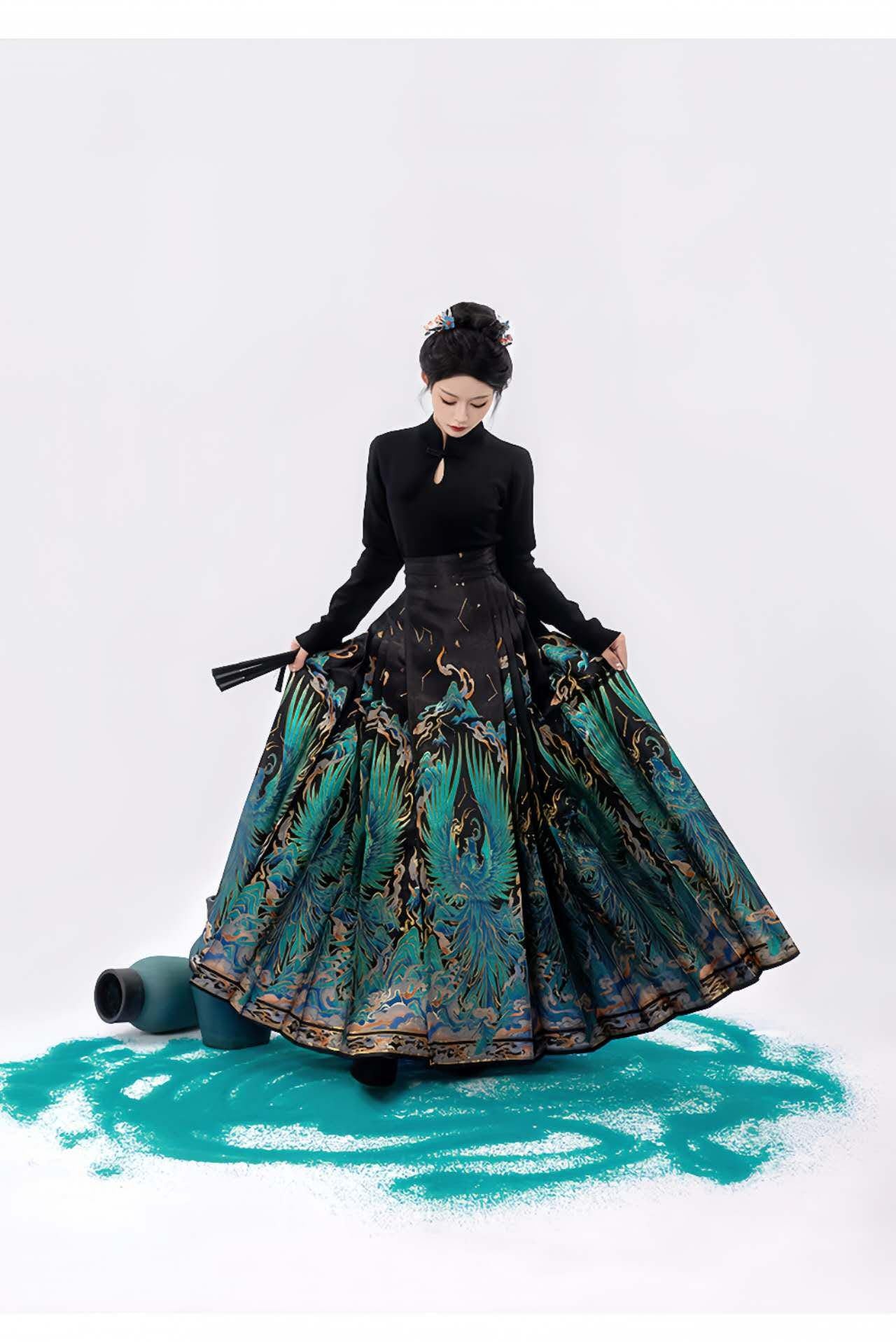 This stunning traditional Ma Mian Qun (马面裙) skirt is inspired by Chinese mythology. Featuring majestic embroidery of the sacred Qingluan bird, a symbol of eternal love and peace, it is presented on an elegant black background of high-density brocade satin.