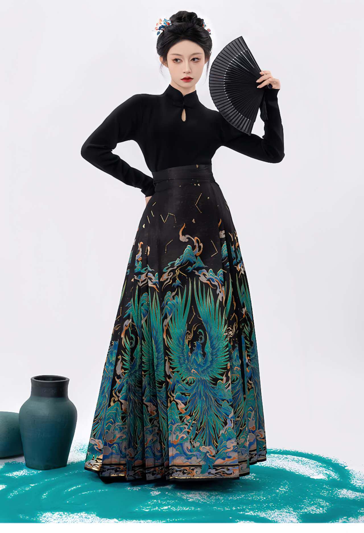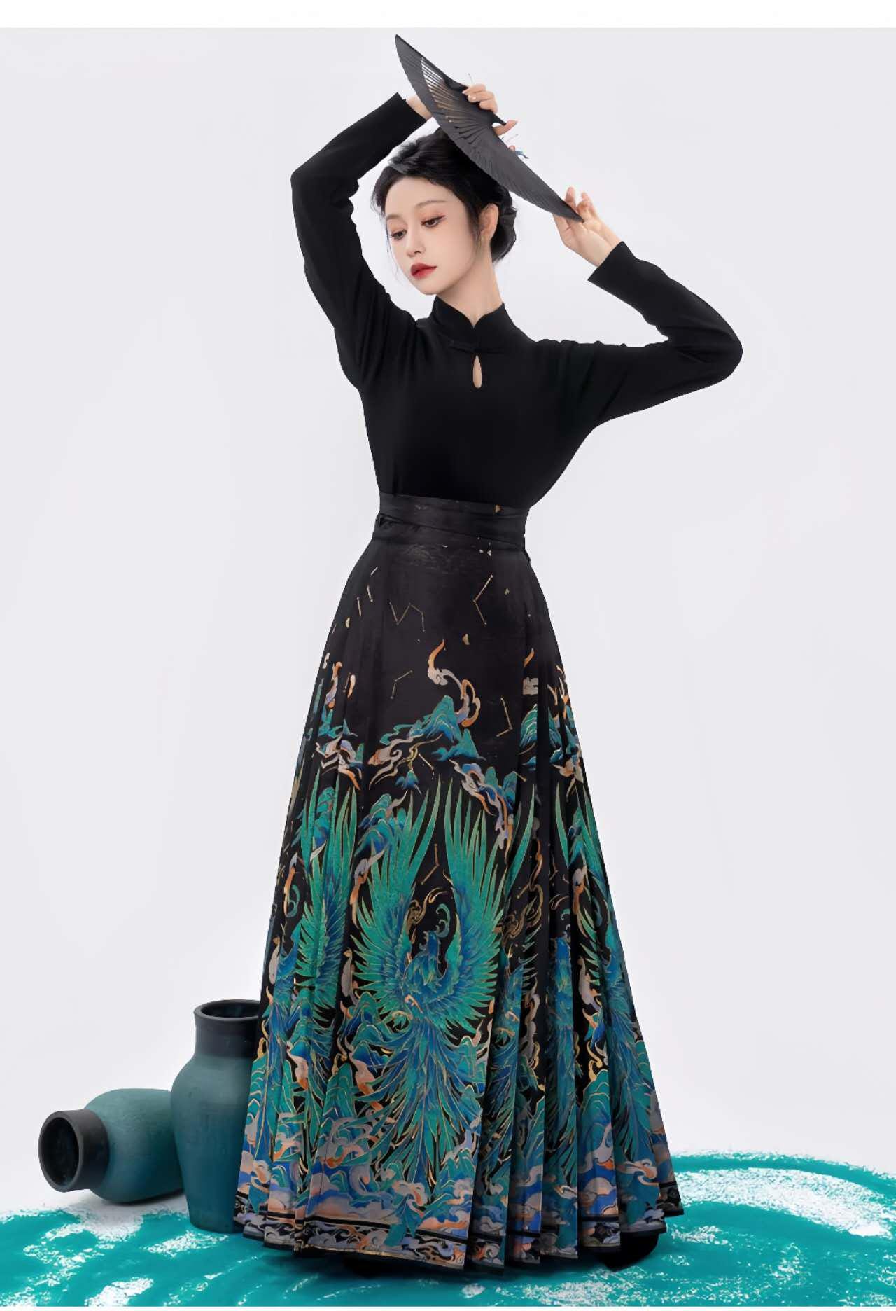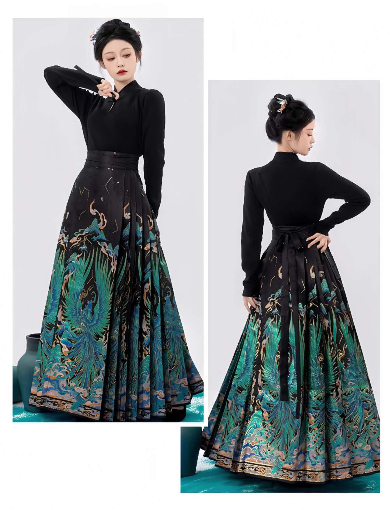 Mythical Bird Hanfu Skirt, Chinese Maxi Skirt, High Waist Pleated Skirt, MaMianQun Printed, Elegant Festival Set, Ancient Style Hanfu