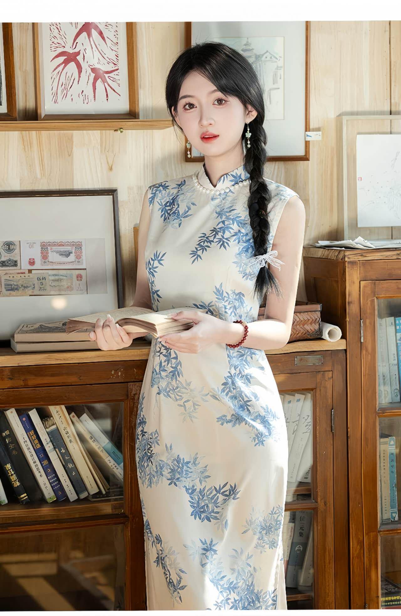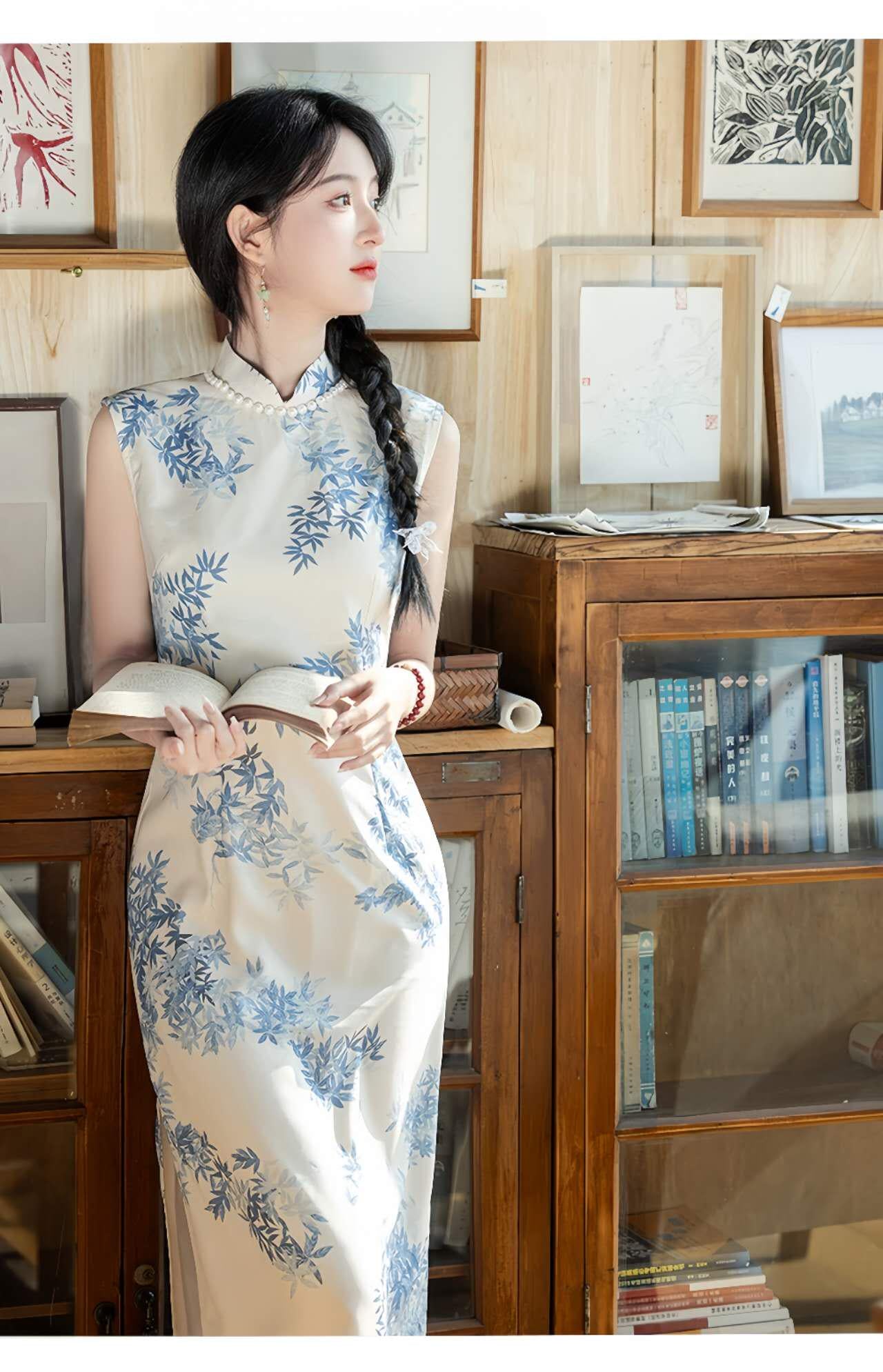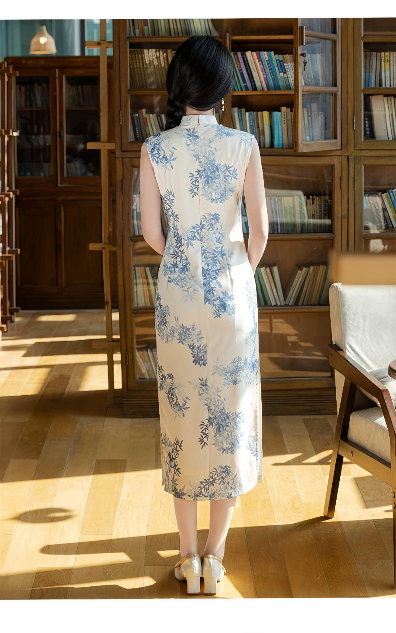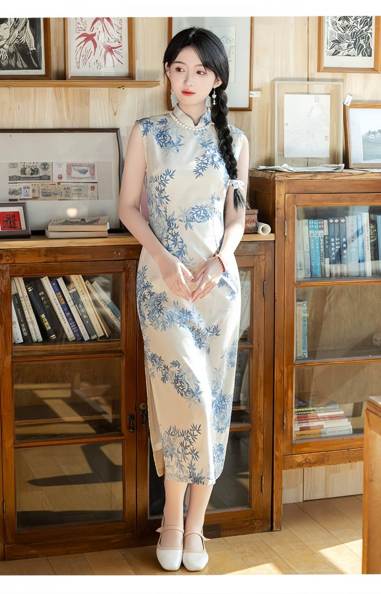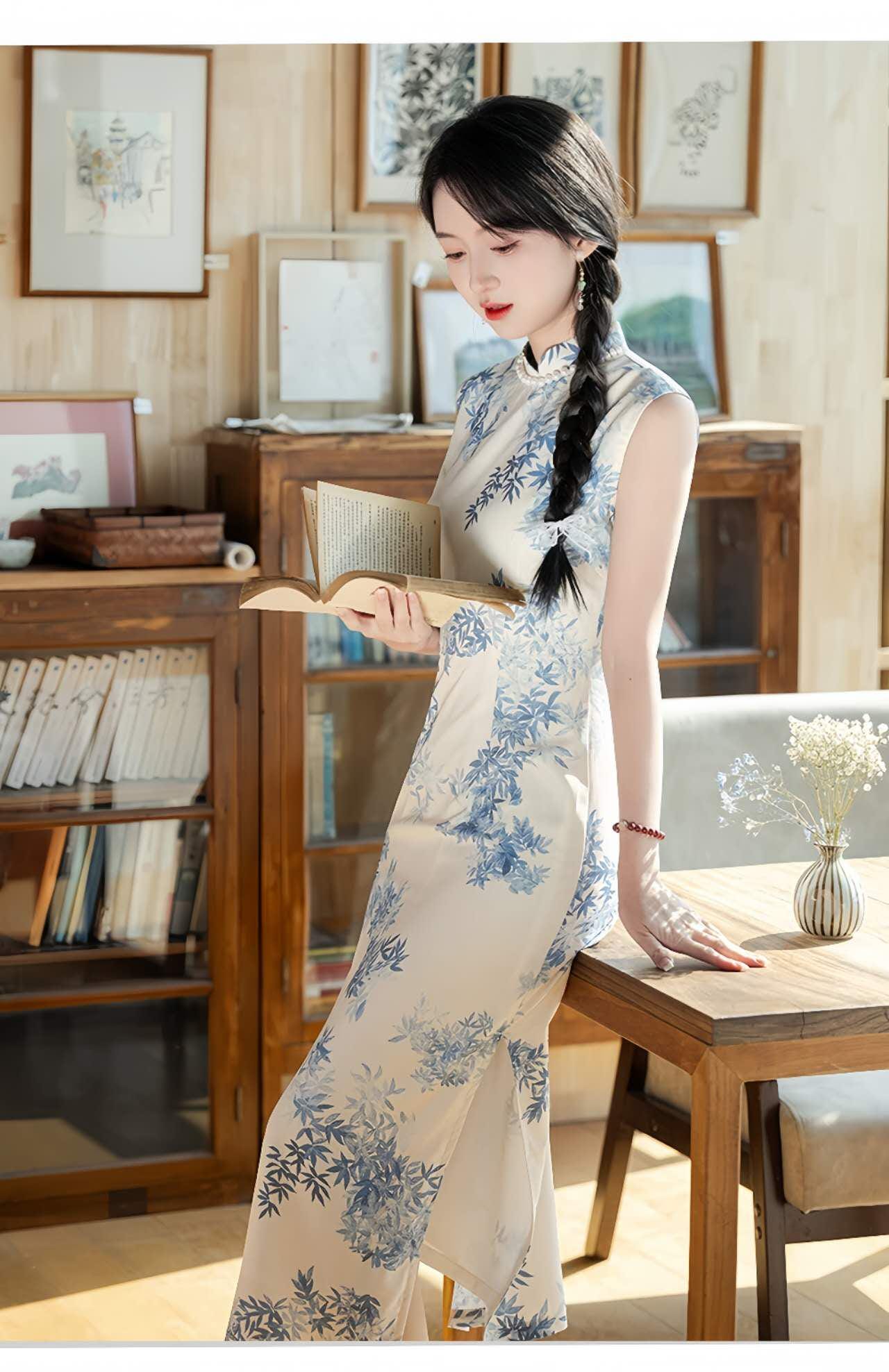 Silk Linen Cheongsam Dress, Blue White Bamboo Qipao, Elegant Chinese Tea Dress, Classic Oriental Style Bookstore, Gift for Her