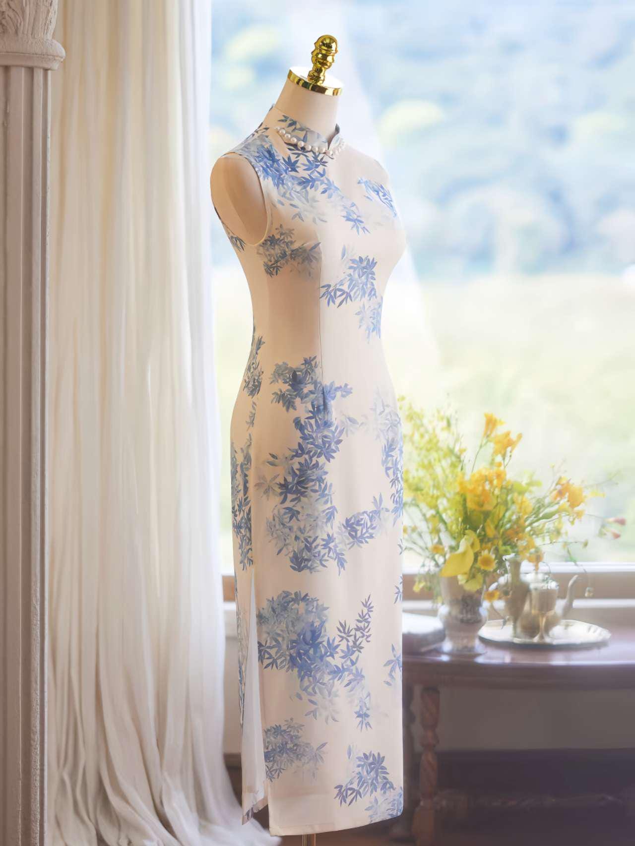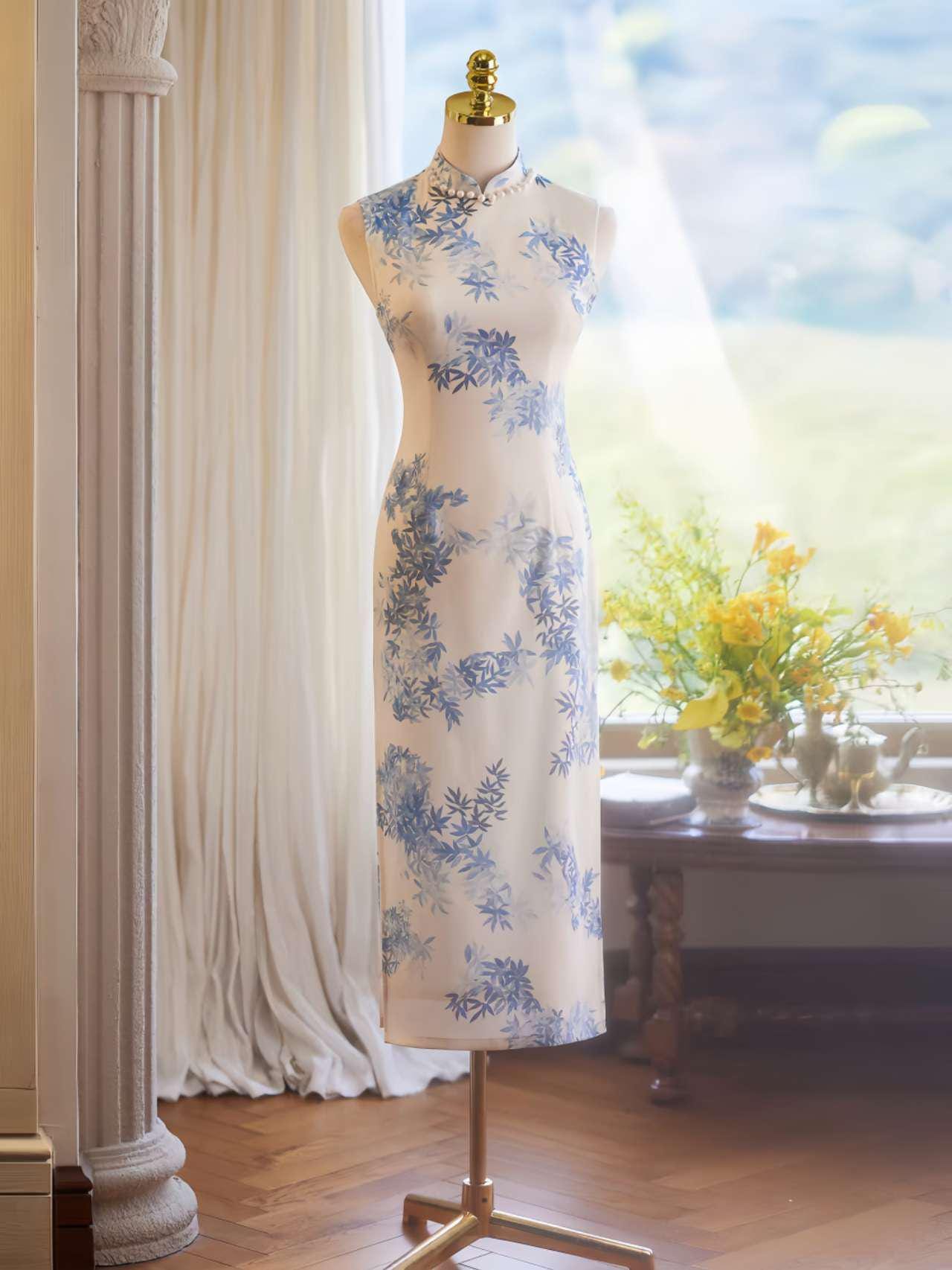 Embrace classic elegance with this blue and white qipao dress, inspired by traditional Chinese aesthetics. Crafted from a luxurious silk and linen blend, this 120cm cheongsam combines a soft sheen and a light texture, ideal for warm days or special events.