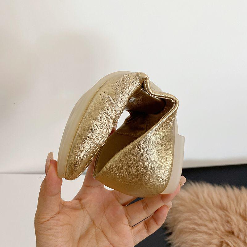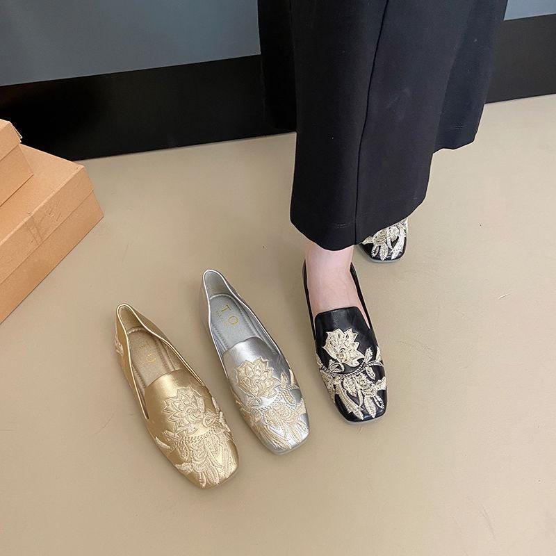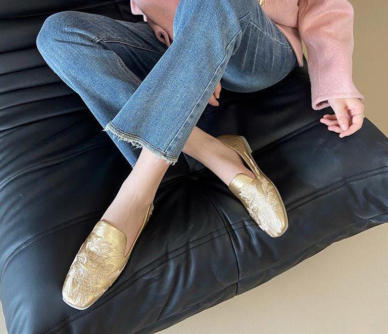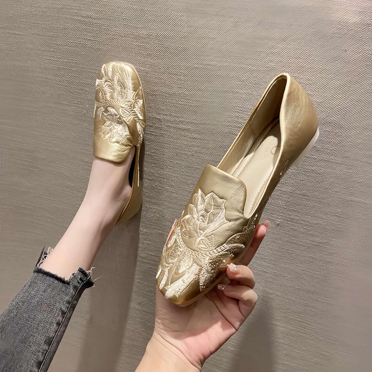 Handmade golden flats made from genuine leather, combining the elegance of traditional Chinese embroidery with modern comfort. The lotus floral design represents purity and femininity, ideal for special occasions or everyday wear.
