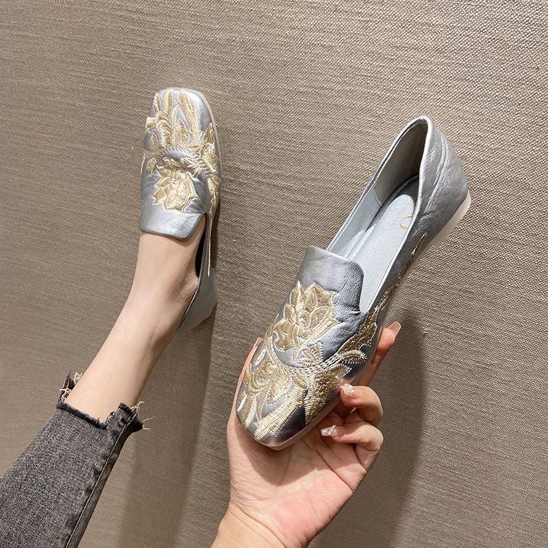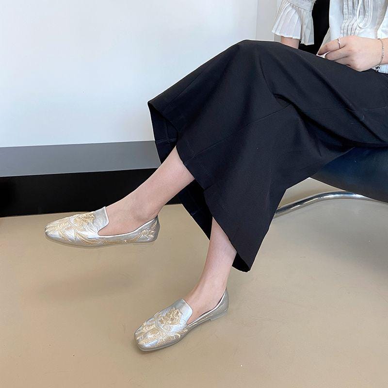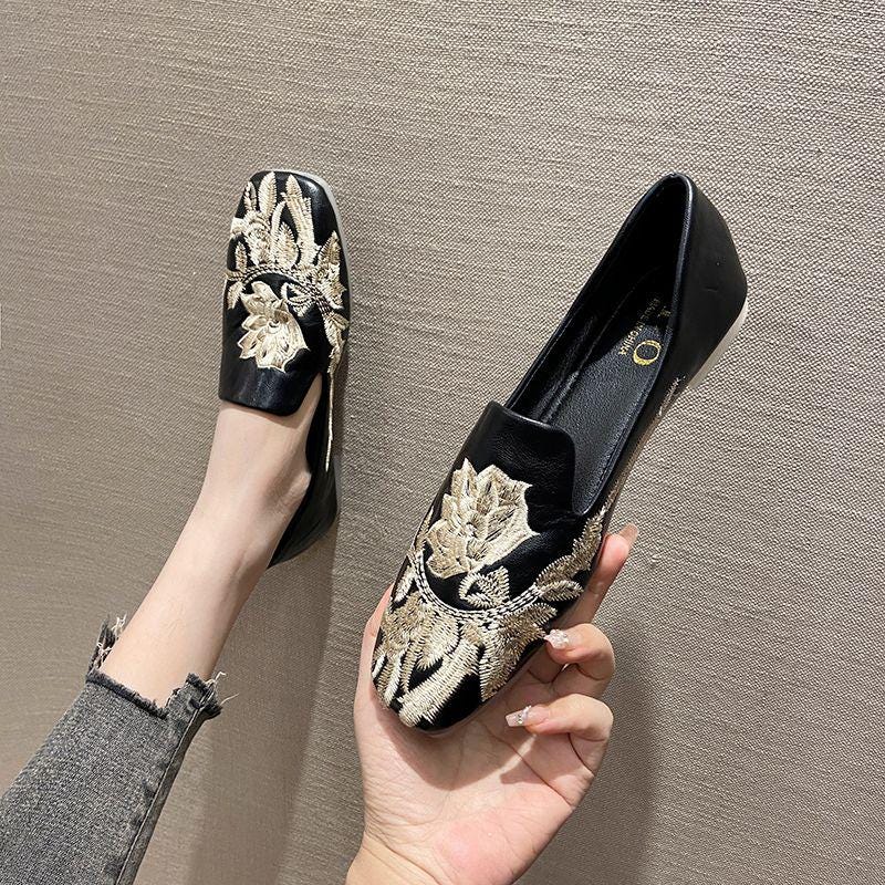 Square-toe art loafers, lotus embroidered loafers, retro embroidered flats, comfortable qipao-style shoes, gift for mom